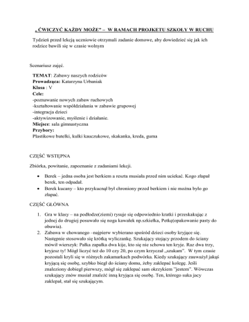 „ ĆWICZYĆ KAŻDY MOŻE” – W RAMACH PROJKETU SZKOŁY W RUCHU Tydzień przed lekcją uczniowie otrzymali zadanie domowe, aby dowiedzieć się jak ich rodzice bawili się w czasie wolnym Scenariusz zajęć. TEMAT: Zabawy naszych rodziców Prowadząca: Katarzyna Urbaniak Klasa : V Cele: -poznawanie nowych zabaw ruchowych -kształtowanie współdziałania w zabawie grupowej -integracja dzieci -aktywizowanie, myślenie i działanie. Miejsce: sala gimnastyczna Przybory: Plastikowe butelki, kulki kauczukowe, skakanka, kreda, guma CZĘŚĆ WSTĘPNA Zbiórka, powitanie, zapoznanie z zadaniami lekcji. Berek – jedna osoba jest berkiem a reszta musiała przed nim uciekać. Kogo złapał berek, ten odpadał. Berek kucany – kto przykucnął był chroniony przed berkiem i nie można było go złapać. CZĘŚĆ GŁÓWNA 1. Gra w klasy – na podłodze(ziemi) rysuje się odpowiednio kratki i przeskakując z jednej do drugiej posuwało się noga kawałek np.szkiełka, Petkę(opakowanie pasty do obuwia). 2. Zabawa w chowanego –najpierw wybierano spośród dzieci osoby kryjące się. Następnie stosowało się krótką wyliczankę. Szukający stojący przodem do ściany mówił wierszyk: Pałka zapałka dwa kije, kto się nie schowa ten kryje. Raz dwa trzy, kryjesz ty! Mógł liczyć też do 10 czy 20, po czym krzyczał „szukam”. W tym czasie pozostali kryli się w różnych zakamarkach podwórka. Kiedy szukający zauważył jakąś kryjącą się osobę, szybko biegł do ściany domu, żeby zaklepać kolegę. Jeśli znaleziony dobiegł pierwszy, mógł się zaklepać sam okrzykiem ”jestem”. Wówczas szukający znów musiał znaleźć inną kryjąca się osobę. Ten, którego suka jacy zaklepał, stał się szukającym. 3. Gra w chłopa – należało na podwórku narysować postać chłopaka a następnie rzucało się kamyk tak, aby wpadł na odpowiedni kwadrat. Potem skakało się przez poszczególne części na jednej nodze. W części gdzie była głowa, należało wskoczyć obiema nogami jednocześnie.. Grało się tak długo, aż ktoś nie skusił.( stanął na linii lub kamyk upadł poza linię). 4. Skakanie w gumę – do zabawy potrzebna była guma. Dwie osoby stawały w środku gumy i ją rozciągały. Najpierw zakładały gumę na kostki, potem na łydkach, kolanach , biodrach, w pasie, czyli coraz wyżej. Trzecia osoba skakała zaczynając od gumy założonej na kostkach. Skakała tak długo aż skusiła. Wtedy następowała zmiana trzymających gumę. 5. Ciuciubabka – jednej osobie zakrywało się oczy chusteczką a reszta uciekała i chowała się , aby nie dać się złapać. 6. Gra w kręgle. 7. Rzucanka w kulki -rzucamy po kolei małymi kulkami w kierunku narysowanego koła. Aby wygrać trzeba tak rzucić kulkę , aby znalazła się ona w najbardziej centralnym punkcie koła. Przy okazji można wybija© kulki współzawodników. CZĘŚĆ KOŃCOWA Podsumowanie zajęć, dyskusja na temat różnic spędzania czasu wolnego przez nas i naszych rodziców, pożegnanie.