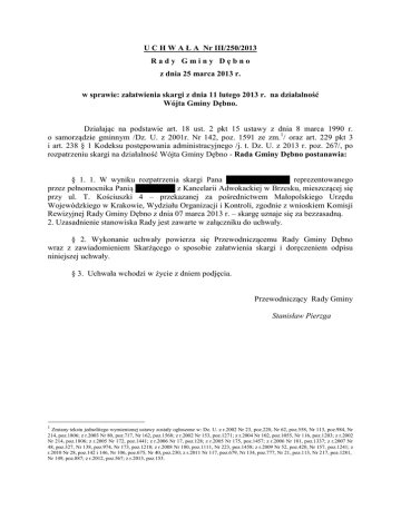 U C H W A Ł A Nr III/250/2013 Rady Gminy Dębno z dnia 25 marca 2013 r. w sprawie: załatwienia skargi z dnia 11 lutego 2013 r. na działalność Wójta Gminy Dębno. Działając na podstawie art. 18 ust. 2 pkt 15 ustawy z dnia 8 marca 1990 r. o samorządzie gminnym /Dz. U. z 2001r. Nr 142, poz. 1591 ze zm.1/ oraz art. 229 pkt 3 i art. 238 § 1 Kodeksu postępowania administracyjnego /j. t. Dz. U. z 2013 r. poz. 267/, po rozpatrzeniu skargi na działalność Wójta Gminy Dębno - Rada Gminy Dębno postanawia: § 1. 1. W wyniku rozpatrzenia skargi Pana Jerzego Kostrzewy reprezentowanego przez pełnomocnika Panią Justynę Bek z Kancelarii Adwokackiej w Brzesku, mieszczącej się przy ul. T. Kościuszki 4 – przekazanej za pośrednictwem Małopolskiego Urzędu Wojewódzkiego w Krakowie, Wydziału Organizacji i Kontroli, zgodnie z wnioskiem Komisji Rewizyjnej Rady Gminy Dębno z dnia 07 marca 2013 r. – skargę uznaje się za bezzasadną. 2. Uzasadnienie stanowiska Rady jest zawarte w załączniku do uchwały. § 2. Wykonanie uchwały powierza się Przewodniczącemu Rady Gminy Dębno wraz z zawiadomieniem Skarżącego o sposobie załatwienia skargi i doręczeniem odpisu niniejszej uchwały. § 3. Uchwała wchodzi w życie z dniem podjęcia. Przewodniczący Rady Gminy Stanisław Pierzga 1 Zmiany tekstu jednolitego wymienionej ustawy zostały ogłoszone w: Dz. U. z r.2002 Nr 23, poz.220, Nr 62, poz.558, Nr 113, poz.984, Nr 214, poz.1806; z r.2003 Nr 80, poz.717, Nr 162, poz.1568; z r.2002 Nr 153, poz.1271; z r.2004 Nr 102, poz.1055, Nr 116, poz.1203; z r.2002 Nr 214, poz.1806; z r.2005 Nr 172, poz.1441; z r.2006 Nr 17, poz.128; z r.2005 Nr 175, poz.1457; z r.2006 Nr 181, poz.1337; z r.2007 Nr 48, poz.327, Nr 138, poz.974, Nr 173, poz.1218; z r.2008 Nr 180, poz.1111, Nr 223, poz.1458; z r.2009 Nr 52, poz.420, Nr 157, poz.1241; z r.2010 Nr 28, poz.142 i 146, Nr 106, poz.675, Nr 40, poz.230; z r.2011 Nr 117, poz.679, Nr 134, poz.777, Nr 21, poz.113, Nr 217, poz.1281, Nr 149, poz.887; z r.2012, poz.567; z r.2013, poz.153. Załącznik do uchwały Nr III/250/2013 Rady Gminy Dębno z dnia 25 marca 2013 r. W dniu 11.02.2013 r. do Przewodniczącego Rady Gminy Dębno wpłynęło pismo Małopolskiego Urzędu Wojewódzkiego w Krakowie, Wydziału Organizacji i Kontroli – znak: OK-VI.1411.21.2013 z dnia 06.02.2013 r. - przekazujące skargę Pana Jerzego Kostrzewy reprezentowanego przez pełnomocnika Panią Justynę Bek z Kancelarii Adwokackiej w Brzesku, mieszczącej się przy ul. T. Kościuszki 4 na działalność Wójta Gminy Dębno, celem rozpatrzenia według właściwości. Zgodnie z § 15 ust. 2 pkt 9 Statutu Gminy Dębno, Przewodniczący Rady Gminy przekazał skargę Przewodniczącemu Komisji Rewizyjnej w dniu 18.01.2013 r. celem rozpatrzenia i przedstawienia Radzie wniosku, co do sposobu jej załatwienia, o czym został również poinformowany wnoszący skargę. Zgodnie z art. 229 punkt 3 KPA, do rozpatrzenia skargi na działalność wójta gminy właściwa jest rada gminy. Uchwała rady rozstrzygająca o sposobie załatwienia skargi powinna spełniać warunki ustalone w art. 238 KPA dla zawiadomienia o sposobie załatwienia skargi, czyli w szczególności zawierać wskazanie sposobu załatwienia skargi, a gdy skarga jest załatwiana odmownie, także uzasadnienie faktyczne i prawne. W toku badania sprawy, w oparciu o wyjaśnienia przebiegu sprawy w zakresie zarzutów skargi złożone w formie ustnej przez Wójta Gminy i pisemne przez Zastępcę Wójta oraz stanowisko Komisji Rewizyjnej Rady Gminy Dębno przyjęte na posiedzeniu w dniu 07.03.2013 r., Rada uznaje, że złożoną skargę należy uznać za bezzasadną z następujących przyczyn: W dniu 23.11.2009 r. firma FORMAT otrzymała zgodę na dowóz materiałów drogą gminną Wola Dębińska Do Urzędu Gminy na odcinku od drogi krajowej nr 4 do bramy wjazdowej na skrzyżowaniu z drogą gminną Wola Dębińska koło Spółdzielni. Po licznych skargach, pismach Pana Jerzego Kostrzewy w dniu 01.10.2011 r. gmina wycofała zgodę na dowóz materiałów budowlanych w/w drogą. Firma Format w dniu 17.10.2011 r. ponowie zwróciła się pismem do Wójta Gminy Dębno o wyrażenie zgody na dowóz materiałów drogą gminną Wola Dębińska Do Urzędu Gminy na odcinku od drogi krajowej nr 4 do bramy wjazdowej na skrzyżowaniu z drogą gminną Wola Dębińska Koło Spółdzielni motywując, że jest to jedyna droga którą można dowozić materiały do ich firmy. W dniu 02.01.2012 r. Wójt wydał zezwolenie na dowóz materiałów tą drogą na czas nieokreślony zgodnie z art. 20 pkt 12 ustawy z dnia 21 marca 1985 r. o drogach publicznych /j. t. Dz. U. z 2013 roku, poz. 260/. Nadmienić należy, że dowóz materiałów budowlanych do firmy może odbywać się jedynie poprzez drogę gminną Wola Dębińska Do Urzędu lub drogę gminną Wola Dębińska Koło Spółdzielni. Wyrażenie jednak zgody na dowóz materiałów budowlanych do firmy Format drogą gminną Wola Dębińska Koło Spółdzielni powodowałoby przejazd samochodów ciężarowych koło domów jednorodzinnych w tym posesji Pana Jerzego Kostrzewy. Mając powyższe na uwadze, Rada uznała, że Wójt Gminy Dębno nie może ograniczać swobody podejmowania i prowadzenia działalności gospodarczej. Wolność gospodarcza podlega ochronie konstytucyjnej. Jak wynika z art. 22 wspomnianej wyżej ustawy dopuszczalne jest ograniczenie wolności gospodarczej, ale tylko „w drodze ustawy i tylko ze względu na ważny interes publiczny”. W świetle przytoczonych argumentów, uzasadnione jest uznanie skargi za bezzasadną. Przewodniczący Rady Gminy Stanisław Pierzga