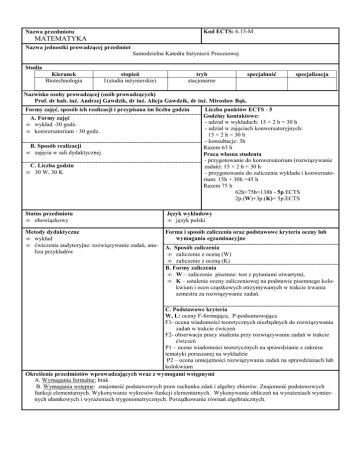 Kod ECTS: 6.15-M Nazwa przedmiotu MATEMATYKA Nazwa jednostki prowadzącej przedmiot Samodzielna Katedra Inżynierii Procesowej Studia Kierunek Biotechnologia stopień I (studia inżynierskie) tryb stacjonarne specjalność specjalizacja Nazwisko osoby prowadzącej (osób prowadzących) Prof. dr hab. inż. Andrzej Gawdzik, dr inż. Alicja Gawdzik, dr inż. Mirosław Bąk. Formy zajęć, sposób ich realizacji i przypisana im liczba godzin A. Formy zajęć • wykład -30 godz. • konwersatorium - 30 godz. B. Sposób realizacji • zajęcia w sali dydaktycznej C. Liczba godzin • 30 W, 30 K Liczba punktów ECTS - 5 Godziny kontaktowe: - udział w wykładach: 15 × 2 h = 30 h - udział w zajęciach konwersatoryjnych: 15 × 2 h = 30 h - konsultacje: 3h Razem 63 h Praca własna studenta - przygotowanie do konwersatorium (rozwiązywanie zadań): 15 × 2 h = 30 h - przygotowanie do zaliczenia wykładu i konwersatorium: 15h + 30h =45 h Razem 75 h 62h+75h=138h - 5p ECTS 2p.(W)+3p.(K)= 5p.ECTS Status przedmiotu • obowiązkowy Język wykładowy • język polski Metody dydaktyczne • wykład • ćwiczenia audytoryjne: rozwiązywanie zadań, analiza przykładów Forma i sposób zaliczenia oraz podstawowe kryteria oceny lub wymagania egzaminacyjne A. Sposób zaliczenia • zaliczenie z oceną (W) • zaliczenie z oceną (K) B. Formy zaliczenia • W – zaliczenie pisemne: test z pytaniami otwartymi, • K – ustalenie oceny zaliczeniowej na podstawie pisemnego kolokwium i ocen cząstkowych otrzymywanych w trakcie trwania semestru za rozwiązywanie zadań. C. Podstawowe kryteria W, L: oceny F-formująca, P-podsumowująca F1- ocena wiadomości teoretycznych niezbędnych do rozwiązywania zadań w trakcie ćwiczeń F2- obserwacja pracy studenta przy rozwiązywaniu zadań w trakcie ćwiczeń P1 – ocena wiadomości teoretycznych na sprawdzianie z zakresu tematyki poruszanej na wykładzie P2 – ocena umiejętności rozwiązywania zadań na sprawdzianach lub kolokwium Określenie przedmiotów wprowadzających wraz z wymogami wstępnymi A. Wymagania formalne: brak B. Wymagania wstępne: znajomość podstawowych praw rachunku zdań i algebry zbiorów. Znajomość podstawowych funkcji elementarnych. Wykonywanie wykresów funkcji elementarnych. Wykonywanie obliczeń na wyrażeniach wymiernych ułamkowych i wyrażeniach trygonometrycznych. Porządkowanie równań algebraicznych. Cele przedmiotu − Zapoznanie z podstawowymi pojęciami i oznaczeniami stosowanymi w matematyce wyższej − Zapoznanie z elementarnymi twierdzeniami i ich wykorzystaniem w zakresie algebry liniowej oraz rachunku wektorowego. − Zapoznanie z twierdzeniami i ich wykorzystaniem w zakresie metod analitycznych matematyki wyższej funkcji jednej zmiennej. − Wykształcenie elementarnych umiejętności obliczeniowych niezbędnych do rozwiązywania równań i układów równań liniowych. − Wykształcenie elementarnych umiejętności obliczeniowych niezbędnych przy wykorzystaniu narzędzi matematycznych w rachunku różniczkowym . − Zapoznanie z kombinatorycznymi podstawami rachunku prawdopodobieństwa. Treści programowe A. Wykład: Podstawowe pojęcia i symbole. Relacje, odwzorowania i funkcje. Funkcje rzeczywiste jednej zmiennej i ich własności. Wyrażenia wymierne i wielomiany. Liczby zespolone i działania na liczbach zespolonych. Algebraiczne rozwiązywanie równań. Elementy geometrii przestrzeni, podstawy rachunku wektorowego. Przestrzenie liniowe, macierze i wyznaczniki. Układy równań liniowych. Zbieżność w przestrzeni metrycznej, ciągi i szeregi liczbowe. Rachunek różniczkowy funkcji jednej zmiennej. Ekstrema funkcji. Szereg Taylora. Elementy kombinatoryki. Kombinatoryczne podstawy rachunku prawdopodobieństwa. B. Ćwiczenia – tematyka rozwiązywanych zadań: Funkcje rzeczywiste jednej zmiennej i ich własności. Wyrażeń wymierne i wielomiany. Liczby zespolone i działania na liczbach zespolonych. Algebraiczne rozwiązywanie równań. Przestrzenie liniowe, wektory, macierze i wyznaczniki. Układy równań liniowych. Zbieżność w przestrzeni metrycznej, ciągi i szeregi liczbowe. Rachunek różniczkowy funkcji jednej zmiennej. Technika różniczkowania. Znajdowanie minimów i maksimów funkcji. Rozwinięcie funkcji w szereg potęgowy. Elementy kombinatoryki. Kombinatoryczne podstawy rachunku prawdopodobieństwa. Wykaz literatury A. Literatura wymagana do ostatecznego zaliczenia zajęć (zdania egzaminu): • Bronsztejn, Siemiendiajew; Matematyka. Poradnik encyklopedyczny. PWN, 1990; • Krysicki W., Włodarski L., Analiza matematyczna w zadaniach, cz. I, PWN, W-wa 2002; • Pietraszko J., Matematyka – teoria, przykłady, zadania, Ofic.Wyd.Polit.Wroc. W-w 1997; B. Literatura uzupełniająca • Brzostek M., Zb. zad. z matematyki dla biol., Wyd. Uniw. Warsz. 2008 • Wrzostek D., Matematyka dla biologów, wyd. Uniw. Warsz., W-wa 2008; • Żakowski W., Decewicz G: Matematyka cz. I, WNT W-wa 2000. Efekty kształcenia Wiedza W 1- student zna definicje, twierdzenia i przykłady w zakresie tematyki realizowanej na wykładzie. Umiejętności U1- student posiadł umiejętność logicznego myślenia i wykonywania działań na zbiorach przy rozwiązywaniu zadań. U2- student potrafi zastosować posiadaną wiedzę do rozwiązywania równań i nierówności oraz typowych zadań obliczeniowych. U3- student potrafi wyznaczać układy równań liniowych oraz je rozwiązywać i analizować. U4- student posiadł umiejętność formułowania zagadnień analitycznych przy pomocy symboli matematycznych U5- student posiadł umiejętność rozwiązywania zadań z zakresu analizy matematycznej funkcji jednej zmiennej. U6 - student potrafi zastosowań klasyczną definicję prawdopodobieństwa przy rozwiązywaniu zadań. Kompetencje społeczne (postawy) K1 - Wyeliminowanie werbalnego sposobu zdobywania i przekazywania wiedzy. K2 - Umiejętność samodzielnego i precyzyjnego myślenia. Kontakt E-mail: [email protected] ; te