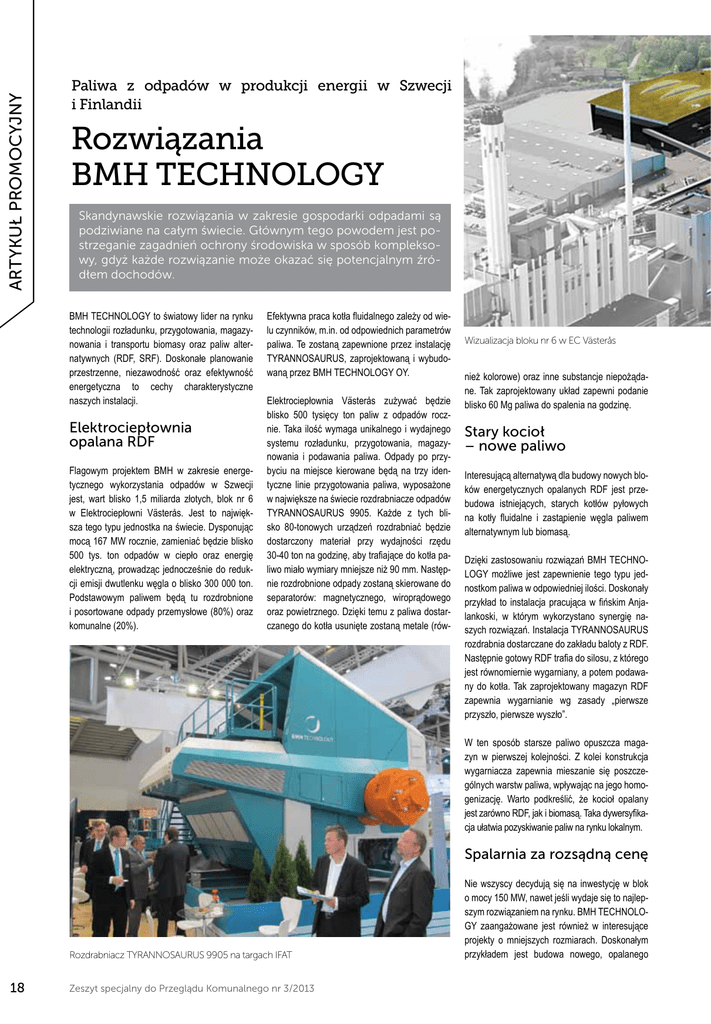 ARTYKUŁ PROMOCYJNY Paliwa z odpadów w produkcji energii w Szwecji i Finlandii Rozwiązania BMH TECHNOLOGY Skandynawskie rozwiązania w zakresie gospodarki odpadami są podziwiane na całym świecie. Głównym tego powodem jest postrzeganie zagadnień ochrony środowiska w sposób kompleksowy, gdyż każde rozwiązanie może okazać się potencjalnym źródłem dochodów. BMH TECHNOLOGY to światowy lider na rynku technologii rozładunku, przygotowania, magazynowania i transportu biomasy oraz paliw alternatywnych (RDF, SRF). Doskonałe planowanie przestrzenne, niezawodność oraz efektywność energetyczna to cechy charakterystyczne naszych instalacji. Elektrociepłownia opalana RDF Flagowym projektem BMH w zakresie energetycznego wykorzystania odpadów w Szwecji jest, wart blisko 1,5 miliarda złotych, blok nr 6 w Elektrociepłowni Västerås. Jest to największa tego typu jednostka na świecie. Dysponując mocą 167 MW rocznie, zamieniać będzie blisko 500 tys. ton odpadów w ciepło oraz energię elektryczną, prowadząc jednocześnie do redukcji emisji dwutlenku węgla o blisko 300 000 ton. Podstawowym paliwem będą tu rozdrobnione i posortowane odpady przemysłowe (80%) oraz komunalne (20%). Efektywna praca kotła fluidalnego zależy od wielu czynników, m.in. od odpowiednich parametrów paliwa. Te zostaną zapewnione przez instalację TYRANNOSAURUS, zaprojektowaną i wybudowaną przez BMH TECHNOLOGY OY. Elektrociepłownia Västerås zużywać będzie blisko 500 tysięcy ton paliw z odpadów rocznie. Taka ilość wymaga unikalnego i wydajnego systemu rozładunku, przygotowania, magazynowania i podawania paliwa. Odpady po przybyciu na miejsce kierowane będą na trzy identyczne linie przygotowania paliwa, wyposażone w największe na świecie rozdrabniacze odpadów TYRANNOSAURUS 9905. Każde z tych blisko 80-tonowych urządzeń rozdrabniać będzie dostarczony materiał przy wydajności rzędu 30-40 ton na godzinę, aby trafiające do kotła paliwo miało wymiary mniejsze niż 90 mm. Następnie rozdrobnione odpady zostaną skierowane do separatorów: magnetycznego, wiroprądowego oraz powietrznego. Dzięki temu z paliwa dostarczanego do kotła usunięte zostaną metale (rów- Wizualizacja bloku nr 6 w EC Västerås nież kolorowe) oraz inne substancje niepożądane. Tak zaprojektowany układ zapewni podanie blisko 60 Mg paliwa do spalenia na godzinę. Stary kocioł – nowe paliwo Interesującą alternatywą dla budowy nowych bloków energetycznych opalanych RDF jest przebudowa istniejących, starych kotłów pyłowych na kotły fluidalne i zastąpienie węgla paliwem alternatywnym lub biomasą. Dzięki zastosowaniu rozwiązań BMH TECHNOLOGY możliwe jest zapewnienie tego typu jednostkom paliwa w odpowiedniej ilości. Doskonały przykład to instalacja pracująca w fińskim Anjalankoski, w którym wykorzystano synergię naszych rozwiązań. Instalacja TYRANNOSAURUS rozdrabnia dostarczane do zakładu baloty z RDF. Następnie gotowy RDF trafia do silosu, z którego jest równomiernie wygarniany, a potem podawany do kotła. Tak zaprojektowany magazyn RDF zapewnia wygarnianie wg zasady „pierwsze przyszło, pierwsze wyszło”. W ten sposób starsze paliwo opuszcza magazyn w pierwszej kolejności. Z kolei konstrukcja wygarniacza zapewnia mieszanie się poszczególnych warstw paliwa, wpływając na jego homogenizację. Warto podkreślić, że kocioł opalany jest zarówno RDF, jak i biomasą. Taka dywersyfikacja ułatwia pozyskiwanie paliw na rynku lokalnym. Spalarnia za rozsądną cenę Rozdrabniacz TYRANNOSAURUS 9905 na targach IFAT 18 Zeszyt specjalny do Przeglądu Komunalnego nr 3/2013 Nie wszyscy decydują się na inwestycję w blok o mocy 150 MW, nawet jeśli wydaje się to najlepszym rozwiązaniem na rynku. BMH TECHNOLOGY zaangażowane jest również w interesujące projekty o mniejszych rozmiarach. Doskonałym przykładem jest budowa nowego, opalanego ARTYKUŁ PROMOCYJNY biomasą oraz paliwem alternatywnym, kotła o mocy 20 MWt i 5 MWe w miejscowości Stegholm w Szwecji. Układ przygotowania paliwa, w którego skład wchodzą zautomatyzowany magazyn podręczny, rozdrabniacz TYRANNOSAURUS 9905 oraz separator magnetyczny, zamieniać będzie blisko 100 000 ton odpadów rocznie w wysokiej jakości RDF z dyspozycyjnością gwarantującą nieprzerwaną pracę kotła. Koszt całego bloku to ok. 150 milionów złotych, co w porównaniu z kosztami obecnie budowanych w Polsce zakładów termicznego przekształcania odpadów bez wątpienia jest ceną konkurencyjną. RDF w polskiej energetyce Budowa elektrociepłowni opalanych paliwami alternatywnymi to interesująca propozycja dla rodzącej się właśnie w Polsce branży termicznego przekształcania odpadów. Zakaz składowania odpadów komunalnych wiązać się będzie z koniecznością budowy większej ilości ITPOK-ów. Z kolei rozbudowa regionalnych in- Silos na paliwa alternatywne, Ostrołęka, Polska stalacji przetwarzania odpadów komunalnych będzie oznaczać w przyszłości mniejszą ilość zmieszanych odpadów komunalnych dostępnych do spalenia przy jednoczesnym wydzielaniu frakcji palnych (10-15% strumienia), które można efektywniej wykorzystać w elektrociepłowniach opalanych RDF. Skonstruowany w ten sposób system postępowania z odpadami wydaje się korespondować z hierarchią postępowania określoną w dyrektywie ramowej o odpadach, eliminując tym samym potencjalny konflikt interesów pomiędzy ITPOK-ami a RIPOK-ami. Konflikt ten można już zaobserwować w Niemczech, gdzie nadwyżka mocy w spalarniach doprowadziła do importu odpadów do termicznego przekształcenia oraz redukcji bodźców do zwiększenia wskaźników recyklingu. Mimo że potencjalni inwestorzy w energetyce wciąż niechętnie spoglądają na odpady oraz inwestycje typu waste-to-energy, szczególnie z uwagi na wysoki koszt instalacji oczyszczania spalin, zbliżająca się wielkimi krokami implementacja dyrektywy w sprawie emisji przemysłowych m