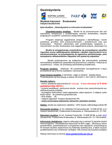 Geoinżynieria Wydział Inżynierii Środowiska Instytut Geotechniki tytuł studiów: „Geoinżynieria w ochronie środowiska” Charakterystyka studiów: Studia te są przeznaczone dla osób z w zawodowo związanych z problematyką ochrony środowiska, inżynierii śro pragnących uzupełnić i poszerzyć swoją wiedzę. Program obejmuje zagadnienia związane z identyfikacją i monitoringie powietrza, gruntów, wód powierzchniowych i podziemnych oraz szeroki w środowiska. Ważnym elementem jest problematyka związana z wpływ inżynierskich na stan środowiska oraz zagadnienia prawne, dotyczące ochrony Studia te przygotowują uczestników do prowadzenia weryfikacji for raportów oceny oddziaływania obiektów i działań inżynierskich na środow zainteresowanym na przystąpienie do egzaminu państwowego, potwierdz zarządzania składowiskiem odpadów lub spalarnią odpadów. Studia przeznaczone są wyłącznie dla pracowników przedsiębiorstw samodzielną działalność gospodarczą [pracownicy urzędów i instytucji publiczn uczestniczyć - chyba, że prowadzą samodzielną działalność]. Program studiów: obejmuje 30 przedmiotów szczegółowych o łącznej licz prowadzone są w formie wykładów i seminariów. Czas trwania studiów: 2 semestry, zajęć w ramach każdej edycji. Przewidywane są trzy edycje w latach 2010/2011, 2011/2012 i 2012/2013. Zasady naboru: - termin składania dokumentów [III edycja]: II tura rekrutacji od 3 września października 2012 r. - kryteria kwalifikacji: ukończone studia wyższe oraz uwarunkowania wynikając dofinansowania projektu, - wymagane dokumenty: karta zgłoszenia, odpis dyplomu, 2 zdjęcia, potwierdze kopia wpisu do ewidencji gospodarczej, - limit miejsc: 25, - miejsce zgłoszeń: Instytut Geotechniki PK, - osoby przyjmujące zgłoszenia: kierownik i sekretarz studiów. Opłaty: studia są częściowo odpłatne - 20% kosztu całkowitego [około 800 zł] Kierownik studiów: dr inż. Elżbieta Chrzanowska [tel. 12 628 20 82, e-mail: ec Instytut Geotechniki, Politechnika Krakowska ul. Warszawska 24, 31-155 Krakó Sekretarz studiów: dr inż. Andrzej Frybes [tel. 12 628 28 98, e-mail: afrybes@p Geotechniki, Politechnika Krakowska ul. Warszawska 24, 31-155 Kraków Informacje dodatkowe: zajęcia odbywają się w ramach 9 zjazdów [soboty - nie harmonogramu. Obowiązkowa obecnośd na 80% zajęć.. Słuchaczy obowiązuje przedmiotów, przewidzianych w programie oraz napisanie i prezentacja pracy ko W ramach studiów zapewnione są materiały dydaktyczne, a także wyżywienie u posiłek/dzień] oraz możliwość noclegów. Nie zwraca się kosztów przejazdu. Więcej informacji na stronie www.geotechnika.pk.edu.pl Do pobrania Do pobrania Karta Zgłoszenia © Wydział Inżynierii Środowiska http://www.wis.pk.edu.pl/