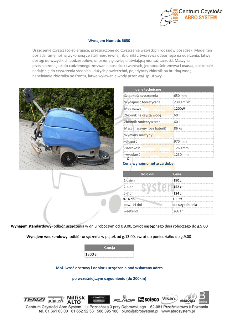 Wynajem Numatic 6650 Urządzenie czyszcząco-zbierające, przeznaczone do czyszczenia wszystkich rodzajów posadzek. Model ten posiada ramę nośną wykonaną ze stali nierdzewnej, zbiorniki z tworzywa odpornego na uderzenia, łatwy dostęp do wszystkich podzespołów, unoszoną głowicę ułatwiającą montaż szczotki. Maszyna przeznaczona jest do codziennego zmywania posadzek twardych, jednocześnie zmywa i osusza, doskonale nadaje się do czyszczenia średnich i dużych powierzchni, pojedynczy zbiornik na brudną wodę, napełnianie zbiornika od frontu, łatwe wylewanie wody przez wąż spustowy. dane techniczne . Szerokość czyszczenia 650 mm Wydajność teoretyczna 2300 m²/h Moc ssawy 1200W Zbiornik na czystą wodę 60 l Zbiornik zanieczyszczeń 60 l Masa maszyny (bez baterii) 86 kg Wymiary maszyny: -długość 970 mm -szerokość 1260 mm -wysokość 1230 mm C Cena wynajmu netto za dobę: Ilość dni Cena 1 dzień 190 zł 2-4 dni 152 zł 5-7 dni 8-14 dni pow. 14 dni 124 zł 105 zł do uzgodnienia weekend 266 zł Wynajem standardowy- odbiór urządzenia w dniu roboczym od g.9.00, zwrot następnego dnia roboczego do g.9.00 Wynajem weekendowy- odbiór urządzenia w piątek od g.13.00, zwrot do poniedziałku do g.9.00 Kaucja 1500 zł Możliwość dostawy i odbioru urządzenia pod wskazany adres po wcześniejszym uzgodnieniu (do 200km)