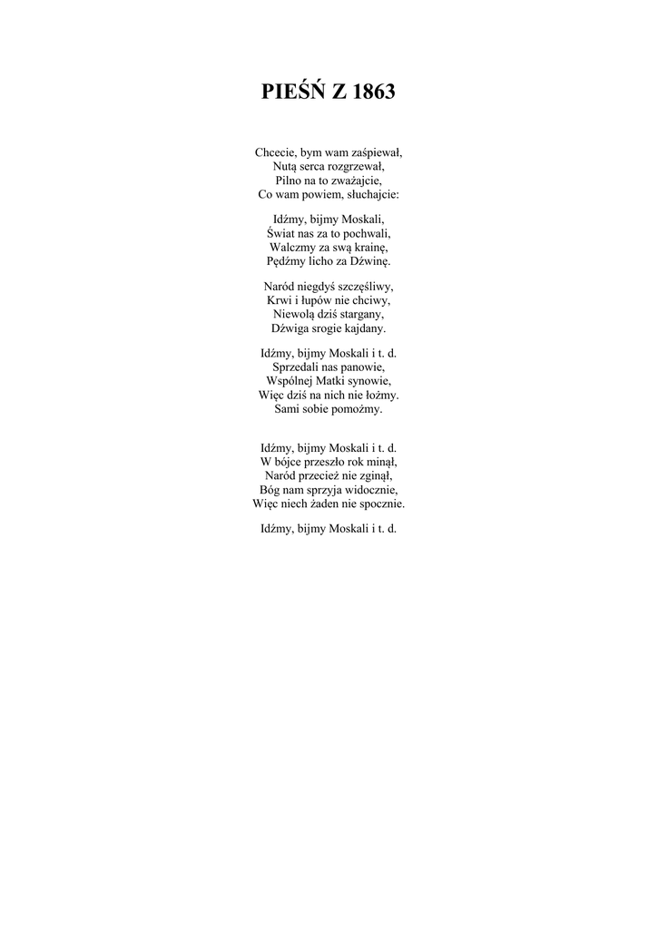 PIEŚŃ Z 1863 Chcecie, bym wam zaśpiewał, Nutą serca rozgrzewał, Pilno na to zważajcie, Co wam powiem, słuchajcie: Idźmy, bijmy Moskali, Świat nas za to pochwali, Walczmy za swą krainę, Pędźmy licho za Dźwinę. Naród niegdyś szczęśliwy, Krwi i łupów nie chciwy, Niewolą dziś stargany, Dźwiga srogie kajdany. Idźmy, bijmy Moskali i t. d. Sprzedali nas panowie, Wspólnej Matki synowie, Więc dziś na nich nie łożmy. Sami sobie pomożmy. Idźmy, bijmy Moskali i t. d. W bójce przeszło rok minął, Naród przecież nie zginął, Bóg nam sprzyja widocznie, Więc niech żaden nie spocznie. Idźmy, bijmy Moskali i t. d.