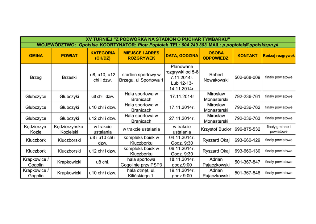 XV TURNIEJ "Z PODWÓRKA NA STADION O PUCHAR TYMBARKU" WOJEWÓDZTWO: Opolskie KOORTYNATOR: Piotr Popiołek TEL: 604 249 303 MAIL: [email protected] GMINA POWIAT KATEGORIA (CH/DZ) Brzeg Brzeski u8, u10, u12 chł i dzw. Głubczyce Głubczyki u8 chł i dzw. Głubczyce Głubczyki u10 chł i dzw. Głubczyce Głubczyki u12 chł i dzw. KędzierzynKoźle KędzierzyńskoKozielski Kluczbork Kluczborski w trakcie ustalania u8 i u10 chł i dzw. Kluczbork Kluczborski u12 chł i dzw. Krapkowicki u8 chł. Krapkowicki u10 chł i dzw. Krapkowice / Gogolin Krapkowice / Gogolin MIEJSCE I ADRES ROZGRYWEK DATA, GODZINA OSOBA ODPOWIEDZ. Planowane rozgrywki od 5-6stadion sportowy w Robert 7.11.2014r. Brzegu, ul Sportowa 1 Nowakowski Lub 12-1314.11.2014r. Hala sportowa w Mirosław 17.11.2014r Branicach Monasterski Hala sportowa w Mirosław 17.11.2014r. Branicach Monasterski Hala sportowa w Mirosław 27.11.2014r. Branicach Monasterski w trakcie w trakcie ustalania Krzystof Bucior ustalania kompleks boisk w 04.11.2014r. Ryszard Okaj Kluczborku Godz. 9:30 kompleks boisk w 06.11.2014r. Ryszard Okaj Kluczborku Godz. 9:30 hala sportowa 18.11.2014r. Adrian Gogolinie przy PSP3 godz.9:00 Pajączkowski hala otmęt, ul. 19.11.2014r. Adrian Kilińskiego 1, godz.9:00 Pajączkowski KONTAKT Rodzaj rozgrywek 502-668-009 finały powiatowe 792-236-761 finały powiatowe 792-236-762 finały powiatowe 792-236-763 finały powiatowe 696-875-532 finały gminne i powiatowe 693-660-129 finały powiatowe 693-660-130 finały powiatowe 501-367-847 finały powiatowe 501-367-848 finały powiatowe kompleks boisk w Gogolinie, w razie u12 chł i dzw. niepogody hala gogolin kompleks boisk typu u12 chł. Orlik w Namysłowie u8,u10, chł. i kompleks boisk typu dzw. Orlik w Namysłowie u-10 i u-12 Nysa - boisko sp nr 10 chł.. ul.11 listopada u-10 i u-12 Paczków - Orlik chł.. u-10 i u-12 Łambinowice - Orlik chł.. u-10 i u-12 Skoroszyce chł.. u-10 i u-12 Głuchołazy Orlik chł.. u-8, u-10, u12 w trakcie ustalania dzw Krapkowice / Gogolin Krapkowicki Namysłów Namysłowski Namysłów Namysłowski Nysa Nyski Paczków Nyski Łambinowice Nyski Skoroszyce Nyski Głuchołazy Nyski Nysa Nyski Praszka Oleski u8,u10,u12 chł i dzw. Olesno Opolski 5.11.2014r. godz. 9:30 4.11.2014r. 5.11.2014r. Adrian Pajączkowski Bogdan Kowalczyk Bogdan Kowalczyk 501-367-849 finały powiatowe 607-057-220 finały powiatowe 607-057-221 finały powiatowe 5.11.2014r. Robert Bułka 795-129-169 finały gminne i powiatowe 31.10.2014r. Robert Bułka 795-129-170 Finał Gminny 03.10.2014r. Godz. 10:00 Robert Bułka 795-129-171 Finał Gminny 5.11.2014r. Robert Bułka 795-129-172 Finał Gminny 31.10.2014r. Robert Bułka 795-129-173 Finał Gminny w trakcie ustalania Robert Bułka 795-129-174 Finał Powiatowy boisko typu Orlik Praszka 30.10.2014r. Godz. 10:00 Lukasz Cieśla - finały gminne a następnie powiatowe Oleski u10, u12 chł i dzw. hala szkoly podstawowej nr 2 w Olesnie 30.10.2014r. Godz. 10:00 Andrzej Świerc 697-125-025 finały gminne a następnie powiatowe Opolski u8,u10,u12 chł i dzw. Kompleks boisk przy WOSM Prószków w trakcie ustalania Łukasz Wicher 608-691-073 finały gminne a następnie powiatowe Opole Opole Opole Opole Opole Opole Prudnik Prudnicki Prudnik Prudnicki Strzelce Opolskie Strzelce Opolskie Strzelce Opolskie Strzelecki Strzelecki Hala sportowa 26.11.2014r. Dobrzeń wielki / u-8 chł Data może uleć Piotr Popiołek 604-249-303 Komprachcice zmianie miejsce może uleć zmianie Kompleks boisk przy 19.11.2014r. WOSM Prószków / Data może uleć u10 chł. Piotr Popiołek 604-249-304 miejsce może uleć zmianie zmianie Kompleks boisk przy 20.11.2014r. WOSM Prószków / u12 chł i dzw. Data może uleć Piotr Popiołek 604-249-304 miejsce może uleć zmianie zmianie boisko typu Orlik 5.11.2014r u12 chł i dzw. Adam Zmarzlik 511-693-541 Prudnik - ul. godz. 9:30 Kościuszki boisko typu Orlik 6.11.2014r. u10 chł. I dzw. Adam Zmarzlik 511-693-542 Prudnik - Orlik Park godz 9:30 Stadion sportowy w 4.11.2014r. u10,u12 chł. Maciej Kułak 501-482-525 Strzelcach Op. Godz. 10:00 Hala sportowa 18.11.2014r. u10 chł Maciej Kułak 501-482-526 Kolonowskie godz.10:00 finał powiatowy finał powiatowy finał powiatowy finał powiatowy finał powiatowy finał gminny finał powiatowy Strzelecki u12 chł. Stadion sportowy w Strzelcach Op. 14.11.2014r. Godz. 10:00 Maciej Kułak 501-482-527 finał powiatowy Strzelce Opolskie Strzelecki u10, u12 dzw. Jemielnica - Orlik 6.11.2014r. Godz. 10:00 Maciej Kułak 501-482-528 finał powiatowy Strzelce Opolskie Strzelecki u8 chł. Jemielnica - hala sportowa 5.12.2014r. 10:00 Maciej Kułak 501-482-529 finał powiatowy