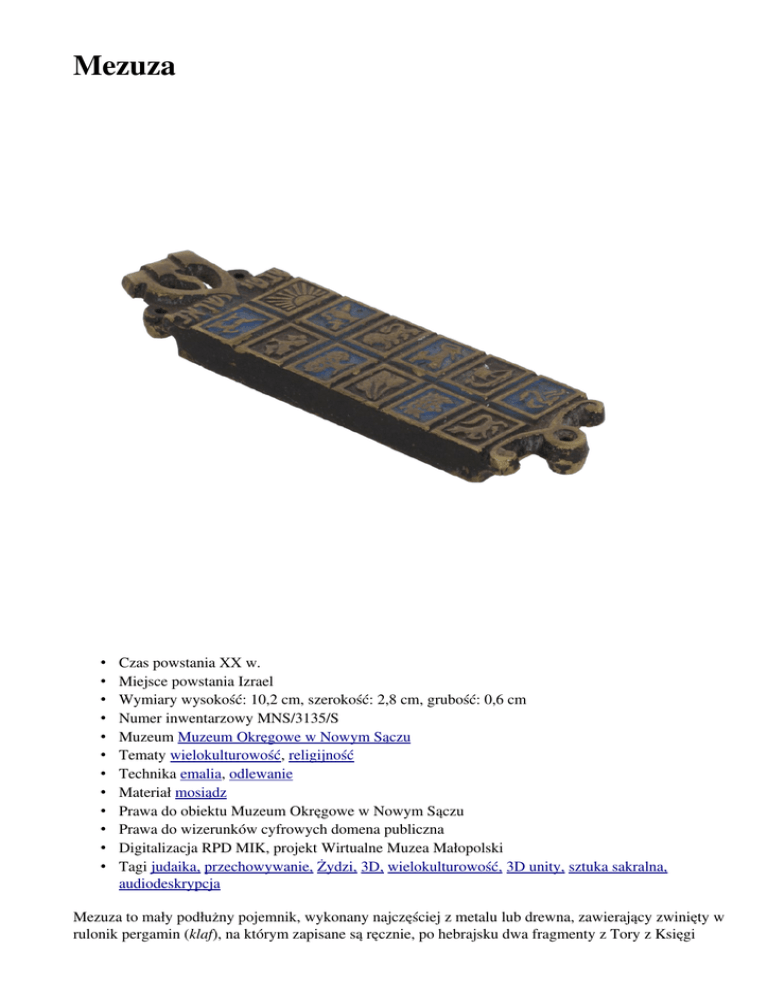 Mezuza • • • • • • • • • • • • Czas powstania XX w. Miejsce powstania Izrael Wymiary wysokość: 10,2 cm, szerokość: 2,8 cm, grubość: 0,6 cm Numer inwentarzowy MNS/3135/S Muzeum Muzeum Okręgowe w Nowym Sączu Tematy wielokulturowość, religijność Technika emalia, odlewanie Materiał mosiądz Prawa do obiektu Muzeum Okręgowe w Nowym Sączu Prawa do wizerunków cyfrowych domena publiczna Digitalizacja RPD MIK, projekt Wirtualne Muzea Małopolski Tagi judaika, przechowywanie, Żydzi, 3D, wielokulturowość, 3D unity, sztuka sakralna, audiodeskrypcja Mezuza to mały podłużny pojemnik, wykonany najczęściej z metalu lub drewna, zawierający zwinięty w rulonik pergamin (klaf), na którym zapisane są ręcznie, po hebrajsku dwa fragmenty z Tory z Księgi Powtórzonego Prawa. Pergamin zwijany jest od lewej strony do prawej, tak aby przy rozwijaniu tekst można było czytać od początku. Mezuzę przymocowuje się na framudze drzwi po prawej stronie, ukośnie, tak aby górna część skierowana była ku drzwiom. Najczęściej przybijano ją w momencie wprowadzenia się do domu lub nie później niż w ciągu 29 dni od zamieszkania. Funkcją mezuzy było przypominanie pobożnym żydom wchodzącym do swojego mieszkania o tym, jak powinni zachowywać się w domu wobec swoich najbliższych i jak wypełniać przykazania dotyczące relacji pomiędzy nimi a Bogiem, wychodzącym z domu zaś o wymaganiach, jakie Tora stawia im wobec ludzi i świata. Co jakiś czas sprawdza się, czy zapisane pergaminy wewnątrz mezuzy nie zostały w żaden sposób uszkodzone, w wypadku mezuz w domach czyni się to dwa razy na siedem lat, natomiast w miejscach publicznych raz na pięćdziesiąt lat. Mezuza znajdująca się w zbiorach sądeckiego muzeum ma interesującą dekorację. Przód obiektu podzielony jest na 12 prostokątnych pól, ułożonych w dwóch kolumnach. W nich, na naprzemiennie ułożonych niebieskich i brązowych, emaliowanych tłach, obwiedzionych ramką, umieszczone są wypukłe symbole dwunastu plemion izraelskich. Plemiona te wywodziły się od dwunastu synów Jakuba, którzy podzielili między siebie ziemię Izraela. Ich symbolami są: jeleń, wschodzące słońce, namioty, dzban z mieczem, drzewo, lew, wiosła, osiołek, owoc winorośli, okręt, lis i wąż. Dołem mezuza zakończona jest skręconą wicią z wolutkami na końcach i dziurką na gwóźdź pośrodku. U góry natomiast znajduje się hebrajski napis oraz litera szin, po bokach której umieszczone są dwa otworki na gwoździe. Do mezuzy dołączone są 3 fragmenty hebrajskiego tekstu na pergaminie. Mezuzę do zbiorów muzeum podarował w 1987 roku Albin Kac, były mieszkaniec Nowego Sącza żydowskiego pochodzenia, obecnie żyjący w Izraelu. Opracowanie: Edyta RossPazdyk (Muzeum Okręgowe w Nowym Sączu), © wszystkie prawa zastrzeżone „(...) i napiszesz je na bramach i na odrzwiach domu twego” Wedle żydowskiego prawa religijnego, niezwłocznie po wprowadzeniu się do nowego domu czy mieszkania (do wynajętego — najpóźniej w ciągu 29 dni) po prawej stronie drzwi wejściowych (na 2/3 wysokości framugi) powinno się umieścić mezuzę, nachylając ją lekko w lewo ku wnętrzu mieszkania i przybijając trwale gwoździami. Jeszcze dziś można gdzieniegdzie odnaleźć ukośny ślad po jej obecności na odrzwiach domów, które nie tak dawno zamieszkiwali polscy Żydzi. Jaka jest funkcja tego podłużnego pojemnika, często przepięknie zdobionego, wykonanego zwykle z metalu, ale też z drewna lub szkła? Otóż wewnątrz mezuzy znajduje się zwitek pergaminu (klaf, zwijany od lewej do prawej strony, aby można go było zacząć czytać już podczas rozwijania) z wypisanymi ręcznie dwoma fragmentami z Księgi Powtórzonego Prawa. Zwyczaj umieszczania jej na framudze drzwi wejściowych wyjaśnia już pierwszy z umieszczonych w mezuzie fragmentów: „Słuchaj, Izraelu! Haszem Bóg nasz, Haszem jest Jedyny. Będziesz miłował Haszem — Boga twego, z całego serca swego i z całej duszy swojej i z całej siły swojej. Niechaj słowa te, które Ja ci dziś nakazuję, będą w twoim sercu. Będziesz je wpajał twoim dzieciom i będziesz o nich mówił, przebywając w swoim domu, idąc drogą, kładąc się i wstając. I przywiążesz je jako znak do swojej ręki, i będą między twoimi oczyma, i napiszesz je na bramach i na odrzwiach domu twego” (6: 4—9). Traktowanie mezuzy jako amuletu chroniącego domostwo przed złymi duchami pochodzi z wierzeń ludowych i jest błędne. Nakaz jej umieszczania wiąże się ściśle z przypominaniem o obecności Boga i jego przykazaniach. Pobożny Żyd, przekraczając próg domu, dotyka jej dwoma palcami prawej ręki, które następnie przykłada do ust. Gest ten wyraża miłość i szacunek do Boga oraz całej tradycji religijnej, do której przynależność mezuza podkreśla. Jej nazwa pochodzi od hebrajskiego słowa מזוזה (odrzwia). Większość mezuzot (liczba mnoga od słowa „mezuza”), również i ta eksponowana na naszym portalu, jest opatrzonych literą szin ש, czyli pierwszą literą słowa Szaddai, stanowiącego jedno z Imion Boga. Hebrajskie El Szaddai oznacza „Bóg Wszechmogący”. Opracowanie: Kinga Kołodziejska (Redakcja WMM), CCBY 3.0 PL Tagi: judaika, Muzeum Okręgowe w Nowym Sączu