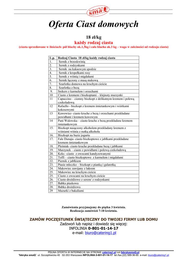 _____________________________________________________________________________________ _____________________________________________________________________________________ Oferta Ciast domowych 18 zł/kg każdy rodzaj ciasta (ciasta sprzedawane w ilościach: pół blachy ok.1,5kg i cała blacha ok.3 kg – waga w zależności od rodzaju ciasta) L.p. 1. 2. 3. 4. 5. 6. 7. 8. 9. 10 11 12 13 14 15. 16. 17. 18. 19. 20. 21. 22. 23. 24. 25. 25. 26. 27. 28. 29 Rodzaj Ciasta 18 zł/kg każdy rodzaj ciasta Sernik z brzoskwinią Sernik z rodzynkami Sernik na kakaowym spodzie Sernik z kropelkami rosy Sernik z wiśnią i migdałami Sernik łączony z masą makową Szarlotka domowa na kruchym cieście Szarlotka z bezą Snikers z karmelem i orzechami Ciasto z kremem i biszkoptami – klejnoty murzynki Capuccino – ciemny biszkopt z delikatnym kremem i polewą czekoladową Rafaello - biszkopt z kremem śmietankowym i wiórkami kokosowymi Kawowiec- ciasto kruche z bezą i orzechami przekładane powidłami i kremem kawowym Pani Walewska – ciasto kruche z bezą przekładane kremem śmietankowym Biszkopt nasączony alkoholem przekładany kremem z wiśniami wiśnia z nutką alkoholu Biszkopt na bazie jogurtu Fale Dunaju- ciasto biszkoptowe z jabłkami przekładane kremem śmietankowym Pleśniak- ciasto kruche przekładane bezą i jabłkami Murzynek – ciasto z powidłami i polewą czekoladową Keks –ciasto z owocami kandyzowanymi Toffi – ciasto biszkoptowe z karmelem i migdałami Piernik z jabłkiem Ptasie mleczko – biszkopt z pianką i galaretką Makowiec zawijany z lukrem Makowiec na kruchym cieście Ciasto z owocami na kruchym cieście Ciasto drożdżowe z serem/ z rodzynkami Babka piaskowa Babka drożdżowa Mazurki z bakaliami Zamówienia przyjmujemy do piątku 3 kwietnia. Realizacja zamówień 7-10 kwietnia. ZAMÓW POCZĘSTUNEK ŚWIĄTECZNY DO TWOJEJ FIRMY LUB DOMU Zadzwoń lub napisz i dowiedz się więcej: INFOLINIA 0-801-01-14-17 e-mail: [email protected] PEŁNA OFERTA W INTERNECIE NA STRONIE catering1.pl lub fabrykasmaQ.pl “fabryka smaQ” ul. Szczęśliwicka 40 02-353 Warszawa INFOLINIA 0-801-01-14-17 tel./fax.(22) 589-36-95 e-mail: [email protected]