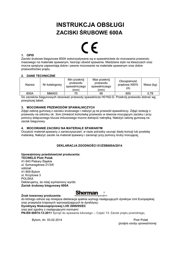 INSTRUKCJA OBSŁUGI ZACISKI ŚRUBOWE 600A 1. OPIS Zaciski śrubowe biegunowe 600A wykorzystywane są w spawalnictwie do mocowania przewodu masowego na materiale spawanym, tworząc obwód spawania. Miedziane styki na kleszczach oraz mocna sprężyna zapewniają dobre i pewne mocowanie na materiale spawanym oraz dobre przewodnictwo prądu. 2. DANE TECHNICZNE Min przekrój Max przekrój Obciążalność przewodu przewodu Nazwa Nr katalogowy prądowa X60% Masa (kg) spawalniczego spawalniczego (A) (mm) (mm) 600A MMA03 70 95 600 0,78 Do zacisków biegunowych stosować przewody spawalnicze H01N2-D. Przekrój przewodu dobrać wg powyższej tabeli. 3. MOCOWANIE PRZEWODÓW SPAWALNICZYCH Zdjąć osłonę gumową z zacisku śrubowego i nałożyć ją na przewód spawalniczy. Zdjąć izolację z przewodu na odcinku ok. 3cm.Umieścić końcówkę przewodu w otworze mocującym zacisku i przy pomocy dołączonego klucza imbusowego mocno dokręcić nakrętką. Nałożyć osłonę gumową na zacisk biegunowy. 4. MOCOWANIE ZACISKU NA MATERIALE SPAWANYM Oczyścić materiał spawany z zanieczyszczeń, w razie potrzeby usunąć ślady korozji lub powłokę malarską. Nałożyć zacisk na materiał spawany i zacisnąć przy pomocy śruby mocującej, DEKLARACJA ZGODNOŚCI 01/ZSB600A/2014 Upoważniony przedstawiciel producenta: TECWELD Piotr Polak 41-943 Piekary Śląskie ul. Szmaragdowa 21/3/6 oddział: 41-909 Bytom ul. Krzyżowa 3 POLSKA Deklarujemy, że niżej wymieniony wyrób: Zacisk śrubowy biegunowy 600A Znak towarowy producenta: do którego odnosi się niniejsza deklaracja spełnia wymogi następujących dyrektyw Unii Europejskiej oraz przepisów krajowych wprowadzających te dyrektywy: Dyrektywy Niskonapięciowej LVD 2006/95/EC oraz jest zgodny z następującymi normami: PN-EN 60974-13:2011 Sprzęt do spawania łukowego -- Część 13: Zacisk prądu powrotnego, Bytom, dn. 03.02.2014 Piotr Polak (podpis osoby upoważnionej