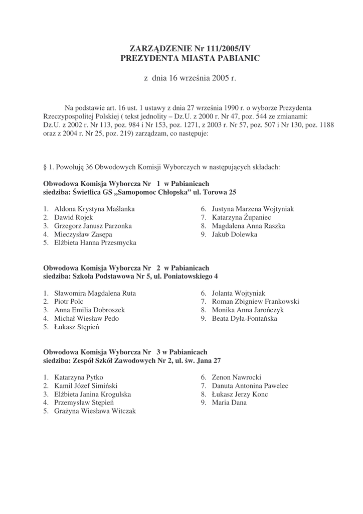 ZARZ DZENIE Nr 111/2005/IV PREZYDENTA MIASTA PABIANIC z dnia 16 wrze nia 2005 r. Na podstawie art. 16 ust. 1 ustawy z dnia 27 wrze nia 1990 r. o wyborze Prezydenta Rzeczypospolitej Polskiej ( tekst jednolity – Dz.U. z 2000 r. Nr 47, poz. 544 ze zmianami: Dz.U. z 2002 r. Nr 113, poz. 984 i Nr 153, poz. 1271, z 2003 r. Nr 57, poz. 507 i Nr 130, poz. 1188 oraz z 2004 r. Nr 25, poz. 219) zarz dzam, co nast puje: § 1. Powołuj 36 Obwodowych Komisji Wyborczych w nast puj cych składach: Obwodowa Komisja Wyborcza Nr 1 w Pabianicach siedziba: wietlica GS „Samopomoc Chłopska” ul. Torowa 25 1. 2. 3. 4. 5. Aldona Krystyna Ma lanka Dawid Rojek Grzegorz Janusz Parzonka Mieczysław Zas pa El bieta Hanna Przesmycka 6. 7. 8. 9. Justyna Marzena Wojtyniak Katarzyna upaniec Magdalena Anna Raszka Jakub Dolewka Obwodowa Komisja Wyborcza Nr 2 w Pabianicach siedziba: Szkoła Podstawowa Nr 5, ul. Poniatowskiego 4 1. 2. 3. 4. 5. Sławomira Magdalena Ruta Piotr Polc Anna Emilia Dobroszek Michał Wiesław Pedo Łukasz St pie 6. 7. 8. 9. Jolanta Wojtyniak Roman Zbigniew Frankowski Monika Anna Jaro czyk Beata Dyła-Fonta ska Obwodowa Komisja Wyborcza Nr 3 w Pabianicach siedziba: Zespół Szkół Zawodowych Nr 2, ul. w. Jana 27 1. 2. 3. 4. 5. Katarzyna Pytko Kamil Józef Simi ski El bieta Janina Krogulska Przemysław St pie Gra yna Wiesława Witczak 6. 7. 8. 9. Zenon Nawrocki Danuta Antonina Pawelec Łukasz Jerzy Konc Maria Dana Obwodowa Komisja Wyborcza Nr 4 w Pabianicach siedziba: Szkoła Podstawowa Nr 3, ul. Mokra 28/34 1. 2. 3. 4. 5. Agnieszka Anna Felcenloben Agnieszka Weronika Majer Łukasz Mariusz Misiak Sebastian Marcin Adamkiewicz Krzysztof Roman Jabłkiewicz 6. 7. 8. 9. Halina Bo ena Rokuszewska Małgorzata Maria Godula Michał Kr ciarz Krystyna Kucharek Obwodowa Komisja Wyborcza Nr 5 w Pabianicach siedziba: Młodzie owy Dom Kultury, ul. Pułaskiego 3 1. 2. 3. 4. 5. Jolanta Małgorzata Górka Katarzyna Janina Roszak Danuta Hanna Gnatkowska Małgorzata Barbara Biegajło Tomasz Badziak 6. 7. 8. 9. Agnieszka Anna Kowalska Sylwia Milena Bara Jarosław Gonera Katarzyna Gotkiewicz Obwodowa Komisja Wyborcza Nr 6 w Pabianicach siedziba: Zespół Szkół Nr 3, ul. Gda ska 5 1. 2. 3. 4. 5. Mieczysław Sławomir Sobótkowski Julita Ewa Arlt Izabela Beata Kaflak Julita Marlena Kaczmarek Grzegorz Nowak 6. 7. 8. 9. Artur Andrzej Zdziarski Grzegorz Stefan wiok Izabela Małgorzata Kosecka Małgorzata Legend Obwodowa Komisja Wyborcza Nr 7 w Pabianicach siedziba: Przedszkole Miejskie Nr 6, ul. Warszawska 53 1. 2. 3. 4. 5. Marcin Radosław Piechowski Irena Marianna Kapu ci ska Aleksandra Marta Gilewicz Jerzy Edward Owczarek Jakub Zbigniew K pi ski 6. 7. 8. 9. Aneta Iwona Kurczewska Barbara Alfreda D brówka Damian Krzysztof Gorzela ski Piotr Błaszczyk Obwodowa Komisja Wyborcza Nr 8 w Pabianicach siedziba: Szkoła Podstawowa Nr 17, ul. Warszawska 6 1. 2. 3. 4. 5. El bieta Strukowska Alicja Bujacz Marianna Stanisława Sajda Waldemar Rafał Ł dka Krystyna Maria Olszewska 6. 7. 8. 9. Aneta Klaudia Bro yna Dorota Izabela Nawrocka Łukasz Paweł Prusisz Mirosława D browska Obwodowa Komisja Wyborcza Nr 9 w Pabianicach siedziba: I Liceum Ogólnokształc ce, ul. Moniuszki 132 1. 2. 3. 4. 5. Waldemar Flajszer Grzegorz Maciej Makocho Julita Krzywa Magdalena Rybarczyk Gniewomir Narcyz Szyma ski 6. 7. 8. 9. Bogumił Zbigniew Mund Krystyna Jurek-Chodasewicz Piotr Ambroziak Edyta Fila Obwodowa Komisja Wyborcza Nr 10 w Pabianicach siedziba: Dom Pomocy Społecznej, ul. Łaska 86 1. 2. 3. 4. 5. Julita Dziuba Mariusz Piotr Kuleta Tomasz Krzysztof Fr ch Grzegorz Wełna Andrzej Bronisław Szulc 6. 7. 8. 9. Mirosława Anna Wo niakowska Tomasz Marian Grzegorzewski Magdalena Prusisz Marek Tyran Obwodowa Komisja Wyborcza Nr 11 w Pabianicach siedziba: Przedszkole Miejskie Nr 14, ul. Odrodzenia 10 1. 2. 3. 4. 5. Janina Irena Florczak Anna Sałaci ska Teresa Marzena Moli ska Karolina Anna B kowicz Czesław Danka 6. 7. 8. 9. Maria Teresa Rodriguez-Moya Katarzyna Anna Wdowiak Magdalena Tokarczyk Katarzyna Jurek Obwodowa Komisja Wyborcza Nr 12 w Pabianicach siedziba: SP ZOZ Przychodnia Rejonowa Nr 1, ul. Wile ska 61 a 1. 2. 3. 4. 5. Urszula Maria K dzierska Sławomir Sałaci ski Manuela Bachanek Kamil Witold Dro d owski Barbara Izabela Olejniczak 6. 7. 8. 9. Marcin Kolanek Joanna Kolasa Adam Jerzy Mizler Izabela Bujnowicz Obwodowa Komisja Wyborcza Nr 13 w Pabianicach siedziba: Przedszkole Miejskie Nr 12, ul. niadeckiego 6a 1. 2. 3. 4. 5. Robert Sylwester Gorzela Julita Renata Sałaci ska Łaba Krystyna D bek Marzena Barbara Trojanowska Anna Izabela Juszkiewicz 6. 7. 8. 9. Katarzyna Anna Bal Arkadiusz Bolesław Packi Jerzy Mirosław Olejnik Bogusława Kobyszewska Obwodowa Komisja Wyborcza Nr 14 w Pabianicach siedziba: Szkoła Podstawowa Nr 14, ul. Ostatnia 15a 1. 2. 3. 4. 5. Tadeusz Szymon G s Renata Kuleta Magdalena Anna pionek Mariusz Ratajczyk Anna Jadwiga Usaczew 6. 7. 8. 9. Anna Katarzyna Bieniada Magdalena Stanisława Werstak Zbigniew Włodzimierz Bal Iwona Marusik Obwodowa Komisja Wyborcza Nr 15 w Pabianicach siedziba: Gimnazjum Nr 1, ul. Tkacka 15 1. 2. 3. 4. 5. Aleksandra Maria Wójcik Michał Sebastian Olejniczak Urszula Szulc Przemysław Grodzki Kamila Anna Gajzler 6. 7. 8. 9. Danuta Janina St pniak Tomasz Adam Fuks Krystyna Koper-Zbrzeska Beata Nowak Obwodowa Komisja Wyborcza Nr 16 w Pabianicach siedziba: Przedszkole Miejskie Nr 2, ul. Cicha 26 1. 2. 3. 4. 5. Anna Małgorzata Bujnowicz Roman Wojciech Kosmowski Renata Kalinowska Edyta Małgorzata Jabło ska Michał Konrad Biskupski 6. 7. 8. 9. Gra yna Krystyna Cichosz Monika Szylberg Alina Michalina Motylewska Agnieszka Ławniczak Obwodowa Komisja Wyborcza Nr 17 w Pabianicach siedziba: Przedszkole Miejskie Nr 5, ul. Zamkowa 48/50 1. 2. 3. 4. 5. Rafał Adam Słupski Paweł Wiktor B czyk Agnieszka Barbara niady Jan Franciszek Grodzki Katarzyna Sikorska 6. 7. 8. 9. Beata Lidia Poros Katarzyna Magdalena Grabarz Jolanta Krawczyk Maria Ryba Obwodowa Komisja Wyborcza Nr 18 w Pabianicach siedz