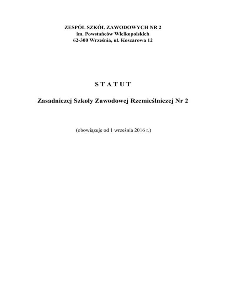 ZESPÓŁ SZKÓŁ ZAWODOWYCH NR 2 im. Powstańców Wielkopolskich 62-300 Września, ul. Koszarowa 12 STATUT Zasadniczej Szkoły Zawodowej Rzemieślniczej Nr 2 (obowiązuje od 1 września 2016 r.) Statut Zasadniczej Szkoły Zawodowej Rzemieślniczej Nr 2 2 Statut Zasadniczej Szkoły Zawodowej Rzemieślniczej Nr 2 ROZDZIAŁ Ι Postanowienia ogólne §1 1. Zasadnicza Szkoła Zawodowa Rzemieślnicza Nr 2, zwana dalej Szkołą Zasadniczą, jest szkołą publiczną szkołą ponadgimnazjalną. 2. Szkoła nosi nazwę: Zasadnicza Szkoła Zawodowa Rzemieślnicza Nr 2 w Zespole Szkół Zawodowych Nr 2 im. Powstańców Wielkopolskich. 3. Zasadnicza Szkoła Zawodowa Rzemieślnicza Nr 2 wchodzi w skład Zespołu Szkół Zawodowych Nr 2 im. Powstańców Wielkopolskich we Wrześni (zwanego dalej Zespołem) przy ul. Koszarowej 12. 4. Siedziba szkoły mieści się we Wrześni przy ul. Koszarowa 12. 5. Czas trwania nauki w Zasadnicza Szkoła Zawodowa Rzemieślnicza Nr 2, wynosi 3 lata. ROZDZIAŁ ΙI Cele i zadania szkoły §2 1. Szkoła Zasadnicza jest szkołą zawodową organizowaną na podbudowie gimnazjum. W trzyletnim cyklu szkoła kształci i wychowuje uczniów zgodnie z celami i zadaniami określonymi w Ustawie o Systemie Oświaty i niniejszym Statutem, uwzględniając ich indywidualny rozwój. 2. Szkoła Zasadnicza realizuje w szczególności następujące cele i zadania: 1) umożliwia zdobycie wiedzy i umiejętności niezbędnych do uzyskania świadectwa ukończenia szkoły 2) przygotowuje uczniów do zdobycia wybranego zawodu i zdania egzaminu potwierdzającego kwalifikacje w zawodzie (zasady organizowania i przeprowadzania egzaminów zawodowych określają szczegółowo odrębne przepisy), 3) przygotowuje uczniów do dalszego kształcenia, a także do podjęcia pracy zawodowej, 4) kształtuje środowisko wychowawcze sprzyjające realizowaniu celów i zasad określonych w ustawie, 5) sprawuje opiekę nad uczniami odpowiednio do ich potrzeb oraz możliwości szkoły, 6) organizuje zajęcia wpływające na rozwijanie umiejętności i uzdolnień uczniów. 3. Szkoła realizuje cele i zadania wynikające z programu wychowawczego i programu profilaktyki, a w szczególności: 1) szkoła zapewnia uczniowi optymalne warunki wszechstronnego rozwoju intelektualnego i emocjonalnego, 2) szkoła kształtuje właściwe postawy poprzez propagowanie uniwersalnych wartości etycznych, patriotycznych i estetycznych, 3) szkoła zapewnia opiekę nad uczniami szczególnie uzdolnionymi; stwarza warunki dla realizacji indywidualnych programów nauczania, 4) szkoła upowszechnia wiedzę ekologiczną oraz kształtuje postawy proekologiczne, 3 Statut Zasadniczej Szkoły Zawodowej Rzemieślniczej Nr 2 4. 5. 6. 7. 5) szkoła przygotowuje uczniów do aktywnego życia w społeczeństwie zintegrowanej Europy, 6) szkoła wspiera rodziców w procesie wychowawczym dziecka. Szkoła sprawuje opiekę nad uczniami przebywającymi w szkole podczas zajęć obowiązkowych i pozalekcyjnych oraz na wszystkich zajęciach poza szkołą organizowanych przez szkołę. Szkoła prowadzi wszechstronną działalność profilaktyczną, udziela uczniom pomocy psychologicznej i pedagogicznej współdziałając z kompetentnymi instytucjami i organizacjami, pedagogiem szkolnym oraz poprzez stałą opiekę wychowawcy klasy. Nauczyciele prowadzący zajęcia w danym oddziale tworzą klasowy zespół nauczycielski, którego zadaniem jest w szczególności ustalenie dla danego oddziału zestawu programów nauczania oraz rozwiązywanie problemów dydaktycznych i wychowawczych klasy oraz pojedynczych uczniów. Dyrektor Szkoły może tworzyć zespoły wychowawcze, zespoły przedmiotowe lub inne zespoły problemowo-zadaniowe. Pracą zespołu kieruje przewodniczący powoływany przez Dyrektora na wniosek członków zespołu. Szczegółowe zadania zespołów zawarte są w odrębnych przepisach. §3 Statutowe cele i zadania realizuje Dyrektor Szkoły, nauczyciele wraz z uczniami w procesie działalności lekcyjnej, pozalekcyjnej i pozaszkolnej, we współpracy z rodzicami, organizacjami i instytucjami społecznymi, gospodarczymi i kulturalnymi regionu. §4 Szkoła może prowadzić działalność innowacyjną i eksperymentalną w oparciu o odrębne przepisy. §5 Uczniowie są oceniani zgodnie z Regulaminem Wewnątrzszkolnego Systemu Oceniania (WSO) – (załącznik nr 6) . §6 Zadania opiekuńcze szkoły 1. Szkoła określa sposób wykonywania zadań opiekuńczych odpowiednio do wieku uczniów uwzględniając obowiązujące przepisy bezpieczeństwa i higieny poprzez: 1) stworzenie w szkole warunków zapewniających uczniom bezpieczeństwo, ochronę przed przemocą, agresją i przenikaniem na teren szkoły osób niepożądanych przez uruchomienie systemu monitoringu, 4 Statut Zasadniczej Szkoły Zawodowej Rzemieślniczej Nr 2 2) opiekę nad uczniami podczas zajęć objętych ramowym planem nauczania i dodatkowych w szkole sprawuje nauczyciel prowadzący zajęcia, 3) w trakcie wycieczek szkolnych, wyjazdów uczniów na konkursy, olimpiady itd. oraz zajęć poza szkołą opiekę nad uczniami sprawuje nauczyciel organizujący lub wychowawca klasy wraz z opiekunami. Ilość opiekunów regulują odrębne przepisy, 4) opiekę nad uczniami w czasie przerw szkolnych sprawują nauczyciele zgodnie z planem dyżurów ustalonych przez dyrekcję na dany rok szkolny. Podczas pełnienia dyżuru nauczyciel powinien znajdować się w wyznaczonym mu rejonie szkoły, 5) szkoła w miarę możliwości zapewnia opiekę uczniom, którzy z powodów warunków rodzinnych lub losowych wymagają szczególnej formy opieki. §7 1. Zakres i sposób wykonywania zadań wychowawczych szkoły: 1) Diagnozowanie: a) rozpoznawanie elementów fizycznych i psychicznych ucznia determinujących jego rozwój, b) rozpoznawanie elementów zbiorowości uczniów jako grupy społecznej, c) rozpoznawanie elementów środowiska rodzinnego, rówieśniczego i lokalnego, mających wpływ na rozwój ucznia; 2) Planowanie