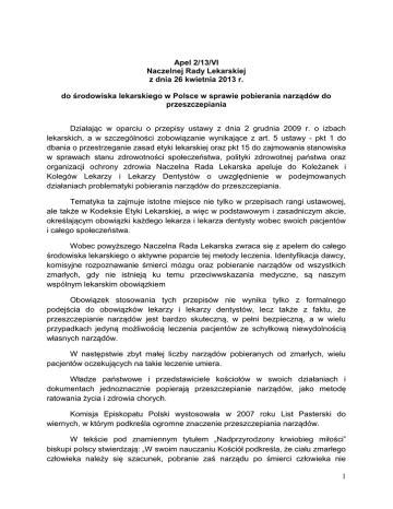Apel 2/13/VI Naczelnej Rady Lekarskiej z dnia 26 kwietnia 2013 r. do środowiska lekarskiego w Polsce w sprawie pobierania narządów do przeszczepiania Działając w oparciu o przepisy ustawy z dnia 2 grudnia 2009 r. o izbach lekarskich, a w szczególności zobowiązanie wynikające z art. 5 ustawy - pkt 1 do dbania o przestrzeganie zasad etyki lekarskiej oraz pkt 15 do zajmowania stanowiska w sprawach stanu zdrowotności społeczeństwa, polityki zdrowotnej państwa oraz organizacji ochrony zdrowia Naczelna Rada Lekarska apeluje do Koleżanek i Kolegów Lekarzy i Lekarzy Dentystów o uwzględnienie w podejmowanych działaniach problematyki pobierania narządów do przeszczepiania. Tematyka ta zajmuje istotne miejsce nie tylko w przepisach rangi ustawowej, ale także w Kodeksie Etyki Lekarskiej, a więc w podstawowym i zasadniczym akcie, określającym obowiązki każdego lekarza i lekarza dentysty wobec swoich pacjentów i całego społeczeństwa. Wobec powyższego Naczelna Rada Lekarska zwraca się z apelem do całego środowiska lekarskiego o aktywne poparcie tej metody leczenia. Identyfikacja dawcy, komisyjne rozpoznawanie śmierci mózgu oraz pobieranie narządów od wszystkich zmarłych, gdy nie istnieją ku temu przeciwwskazania medyczne, są naszym wspólnym lekarskim obowiązkiem Obowiązek stosowania tych przepisów nie wynika tylko z formalnego podejścia do obowiązków lekarzy i lekarzy dentystów, lecz także z faktu, że przeszczepianie narządów jest bardzo skuteczną, w pełni bezpieczną, a w wielu przypadkach jedyną możliwością leczenia pacjentów ze schyłkową niewydolnością własnych narządów. W następstwie zbyt małej liczby narządów pobieranych od zmarłych, wielu pacjentów oczekujących na takie leczenie umiera. Władze państwowe i przedstawiciele kościołów w swoich działaniach i dokumentach jednoznacznie popierają przeszczepianie narządów, jako metodę ratowania życia i zdrowia chorych. Komisja Episkopatu Polski wystosowała w 2007 roku List Pasterski do wiernych, w którym podkreśla ogromne znaczenie przeszczepiania narządów. W tekście pod znamiennym tytułem „Nadprzyrodzony krwiobieg miłości” biskupi polscy stwierdzają: „W swoim nauczaniu Kościół podkreśla, że ciału zmarłego człowieka należy się szacunek, pobranie zaś narządu po śmierci człowieka nie 1 narusza jego godności ani żadnych praw osoby ludzkiej. Według aktualnego stanu wiedzy medycznej, podstawą do stwierdzenia śmierci człowieka jest ustanie wszelkiej aktywności mózgowej.” Potwierdza to akceptację z punktu widzenia moralnego i etycznego przyjętych przez środowisko medyczne kryteriów śmierci człowieka w oparciu o stwierdzanie śmierci mózgu. Także władze państwowe przywiązują dużą wagę do kwestii jak najszerszego stosowania metody leczniczej polegającej na przeszczepianiu tkanek i narządów. W 2008 roku Sejm RP wystosował Apel do społeczeństwa oraz terenowych władz administracji państwowej i samorządowej wszystkich szczebli o akceptację tej metody leczenia, a w 2010 roku Rząd RP ustanowił Narodowy Program Rozwoju Medycyny Transplantacyjnej na lata 2011-2020. Naczelna Rada Lekarska podkreśla, że wszystkie ostatnio przeprowadzane badania opinii społecznej wskazują na znaczną poprawę akceptacji przeszczepiania narządów pobieranych od dawców zmarłych. Liczba osób, od których po śmierci możliwe byłoby pobranie narządów, jednak znacznie przekracza liczbę rzeczywistych pobrań. Oznacza to, że lekarze zbyt rzadko rozważają możliwość pobrania narządów po śmierci pacjenta. Według danych, w ponad połowie szpitali w Polsce, w których możliwe byłoby pobieranie narządów, nie jest zgłaszana taka możliwość i nie dochodzi do pobierania, co odbiera szansę na skuteczne leczenie osobom oczekującym na przeszczepienie narządu. Naczelna Rada Lekarska uważa, że umożliwienie pobierania narządów od zmarłych w celu przeszczepu jest niezwykle ważnym zadaniem dla realizacji potrzeb zdrowotnych społeczeństwa, wymagającym wsparcia i zaangażowania wielu koleżanek i kolegów lekarzy. 2