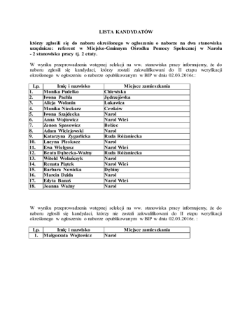 LISTA KANDYDATÓW którzy zgłosili się do naboru określonego w ogłoszeniu o naborze na dwa stanowiska urzędnicze: referent w Miejsko-Gminnym Ośrodku Pomocy Społecznej w Narolu - 2 stanowiska pracy tj. 2 etaty. W wyniku przeprowadzenia wstępnej selekcji na ww. stanowiska pracy informujemy, że do naboru zgłosili się kandydaci, którzy zostali zakwalifikowani do II etapu weryfikacji określonego w ogłoszeniu o naborze opublikowanym w BIP w dniu 02.03.2016r.: Lp. 1. 2. 3. 4. 5. 6. 7. 8. 9. 10. 11. 12. 13. 14. 15. 16. 17. 18. Imię i nazwisko Monika Pudełko Iwona Pachla Alicja Wolanin Monika Nieckarz Iwona Szajdecka Anna Wojtowicz Zenon Spasowicz Adam Wiciejowski Katarzyna Zygarlicka Lucyna Pleskacz Ewa Wielgosz Beata Dąbecka-Ważny Witold Wolańczyk Renata Piątek Barbara Nowicka Marcin Dzida Edyta Banaś Joanna Ważny Miejsce zamieszkania Chlewiska Jędrzejówka Łukawica Cewków Narol Narol Wieś Bełżec Narol Ruda Różaniecka Narol Narol Wieś Ruda Różaniecka Narol Narol Wieś Dębiny Narol Narol Wieś Narol W wyniku przeprowadzenia wstępnej selekcji na ww. stanowiska pracy informujemy, że do naboru zgłosili się kandydaci, którzy nie zostali zakwalifikowani do II etapu weryfikacji określonego w ogłoszeniu o naborze opublikowanym w BIP w dniu 02.03.2016r. : Lp. Imię i nazwisko 1. Małgorzata Wojtowicz Miejsce zamieszkania Narol