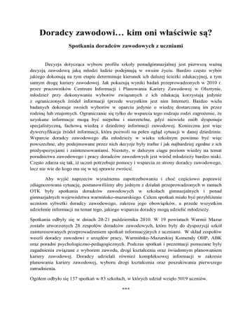 Doradcy zawodowi… kim oni właściwie są? Spotkania doradców zawodowych z uczniami Decyzja dotycząca wyboru profilu szkoły ponadgimnazjalnej jest pierwszą ważną decyzją zawodową jaką młodzi ludzie podejmują w swoim życiu. Bardzo często wybór jakiego dokonują na tym etapie determinuje kierunek ich dalszej ścieżki edukacyjnej, a tym samym drogę kariery zawodowej. Jak pokazują wyniki badań przeprowadzonych w 2010 r. przez pracowników Centrum Informacji i Planowania Kariery Zawodowej w Olsztynie, młodzież przy dokonywaniu wyborów związanych z ich edukacją korzystają jedynie z ograniczonych źródeł informacji (przede wszystkim jest nim Internet). Bardzo wielu badanych dokonuje swoich wyborów w oparciu jedynie o wiedzę dostarczaną im przez rodzinę lub znajomych. Ograniczanie się tylko do wsparcia tego rodzaju rodzi zagrożenie, że uzyskane informacje mogą być niepełne i nierzetelne, gdyż niewiele osób dysponuje specjalistyczną, fachową wiedzą z dziedziny informacji zawodowej. Konieczna jest więc dywersyfikacja źródeł informacji, która pozwoli na pełen ogląd sytuacji w danej dziedzinie. Wsparcie doradcy zawodowego dla młodzieży w wieku szkolnym powinno być więc powszechne, aby podejmowane przez nich decyzje były trafne i jak najbardziej zgodne z ich predyspozycjami i zainteresowaniami. Niestety, w dalszym ciągu poziom wiedzy na temat poradnictwa zawodowego i pracy doradców zawodowych jest wśród młodzieży bardzo niski. Często zdarza się tak, iż uczeń potrzebuje pomocy i wsparcia ze strony doradcy zawodowego, lecz nie wie do kogo ma się w tej sprawie zwrócić. Aby wyjść naprzeciw wyraźnemu zapotrzebowaniu i choć częściowo poprawić zdiagnozowana sytuację, postanowiliśmy aby jednym z działań przeprowadzonych w ramach OTK były spotkania doradców zawodowych w szkołach gimnazjalnych i ponad gimnazjalnych województwa warmińsko-mazurskiego. Celem spotkań miało być przybliżenie uczniom sylwetki doradcy zawodowego, zakresu jego obowiązków, a przede wszystkim udzielenie informacji na temat tego, jakiego wsparcia doradcy mogą udzielić młodzieży. Spotkania odbyły się w dniach 20-21 października 2010. W 19 powiatach Warmii Mazur zostało utworzonych 28 zespołów doradców zawodowych, które były do dyspozycji szkół zainteresowanych przeprowadzeniem spotkań informacyjnych z uczniami. W skład zespołów weszli doradcy zawodowi z urzędów pracy, Warmińsko-Mazurskiej Komendy OHP, ABK oraz poradni psychologiczno-pedagogicznych. Podczas spotkań i prezentacji poruszane były zagadnienia związane z wyborem zawodu, drogi kształcenia oraz świadomym planowaniem kariery zawodowej. Doradcy udzielali również kompleksowej informacji w zakresie planowania kariery zawodowej, wyboru drogi kształcenia oraz poszukiwania pierwszego zatrudnienia. Ogółem odbyło się 137 spotkań w 83 szkołach, w których udział wzięło 5019 uczniów. *** „Planowanie i rozwój kariery zawodowej człowieka jest procesem rozpoczynającym się we wczesnym dzieciństwie i trwającym przez całe życie” – cytat ten przewija się w wielu wypowiedziach doradców zawodowych. Jednak aby móc realizować zawartą w nim ideę, niezbędne jest zaszczepienie jej u najmłodszych – uczniów gimnazjów i szkół ponadgimnazjalnych. Wsparcie doradców zawodowych jest niezbędne, aby już na tym etapie życia byli oni w stanie podejmować swoje decyzje edukacyjne świadomie, w oparciu o rzetelną wiedzę i trafną diagnozę potencjału. Duże zainteresowanie spotkaniami ze strony szkół, a przede wszystkim ze strony młodzieży pokazują, iż inicjatywa była zdecydowanie trafiona. Uczniowie chętnie uczestniczyli w spotkaniach, zadawali mnóstwo pytań, byli chętni do dyskusji. Pozostaje mieć nadzieje, iż zdobyta wiedza nie zostanie przez nich zapomniana i w razie jakichkolwiek problemów, będą już dokładnie wiedzieć do kogo zwrócić się o pomoc. Marek Zbytniewski Centrum Informacji i Planowania Kariery Zawodowej w Olsztynie Wojewódzki Urząd Pracy w Olsztynie