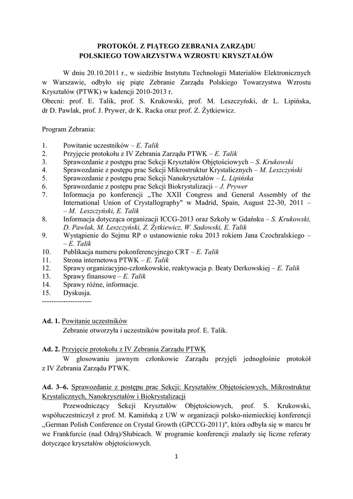 PROTOKÓŁ Z PIĄTEGO ZEBRANIA ZARZĄDU POLSKIEGO TOWARZYSTWA WZROSTU KRYSZTAŁÓW W dniu 20.10.2011 r., w siedzibie Instytutu Technologii Materiałów Elektronicznych w Warszawie, odbyło się piąte Zebranie Zarządu Polskiego Towarzystwa Wzrostu Kryształów (PTWK) w kadencji 2010-2013 r. Obecni: prof. E. Talik, prof. S. Krukowski, prof. M. Leszczyński, dr L. Lipińska, dr D. Pawlak, prof. J. Prywer, dr K. Racka oraz prof. Z. Żytkiewicz. Program Zebrania: Powitanie uczestników – E. Talik Przyjęcie protokołu z IV Zebrania Zarządu PTWK – E. Talik Sprawozdanie z postępu prac Sekcji Kryształów Objętościowych – S. Krukowski Sprawozdanie z postępu prac Sekcji Mikrostruktur Krystalicznych – M. Leszczyński Sprawozdanie z postępu prac Sekcji Nanokryształów – L. Lipińska Sprawozdanie z postępu prac Sekcji Biokrystalizacji – J. Prywer Informacja po konferencji ,,The XXII Congress and General Assembly of the International Union of Crystallography" w Madrid, Spain, August 22-30, 2011 – – M. Leszczyński, E. Talik 8. Informacja dotycząca organizacji ICCG-2013 oraz Szkoły w Gdańsku – S. Krukowski, D. Pawlak, M. Leszczyński, Z. Żytkiewicz, W. Sadowski, E. Talik 9. Wystąpienie do Sejmu RP o ustanowienie roku 2013 rokiem Jana Czochralskiego – – E. Talik 10. Publikacja numeru pokonferencyjnego CRT – E. Talik 11. Strona internetowa PTWK – E. Talik 12. Sprawy organizacyjno-członkowskie, reaktywacja p. Beaty Derkowskiej – E. Talik 13. Sprawy finansowe – E. Talik 14. Sprawy różne, informacje. 15. Dyskusja. --------------------1. 2. 3. 4. 5. 6. 7. Ad. 1. Powitanie uczestników Zebranie otworzyła i uczestników powitała prof. E. Talik. Ad. 2. Przyjęcie protokołu z IV Zebrania Zarządu PTWK W głosowaniu jawnym członkowie Zarządu przyjęli jednogłośnie protokół z IV Zebrania Zarządu PTWK. Ad. 3–6. Sprawozdanie z postępu prac Sekcji: Kryształów Objętościowych, Mikrostruktur Krystalicznych, Nanokryształów i Biokrystalizacji Przewodniczący Sekcji Kryształów Objętościowych, prof. S. Krukowski, współuczestniczył z prof. M. Kamińską z UW w organizacji polsko-niemieckiej konferencji ,,German Polish Conference on Crystal Growth (GPCCG-2011)", która odbyła się w marcu br we Frankfurcie (nad Odrą)/Słubicach. W programie konferencji znalazły się liczne referaty dotyczące kryształów objętościowych. 1 Przewodniczący Sekcji Mikrostruktur Krystalicznych, prof. M. Leszczyński, poinformował o pracach mających na celu uzupełnienie informacji odnośnie Sekcji Mikrostruktur Krystalicznych na stronie internetowej PTWK. Przewodnicząca Sekcji Nanokryształów, dr L. Lipińska, poinformowała o tym, że czynnie włączyła się w propagowanie nanotechnologii. Dr L. Lipińska wygłosiła wykład na temat jonowych baterii litowych, na polsko-niemieckim spotkaniu (z Instytutem Nanotechnologii w Karlsruhe), w ramach sesji „NANOTECHNOLOGIA-PL”. Sesja ta została przeprowadzona przy okazji międzynarodowej konferencji ,,EMRS Fall Meeting" we wrześniu br. na Politechnice Warszawskiej. Ponadto, dr L. Lipińska poinformowała o spotkaniach Warszawskiej Nano-Sieci, które odbywają się co miesiąc w Unipressie. Na jednym z takich spotkań dr L. Lipińska wygłosiła wykład na temat różnych metod chemicznych i elektrochemicznych wytwarzania materiałów nanokrystalicznych. Przewodnicząca Sekcji Biokrystalizacji, prof. J. Prywer, przypomniała o tym, że w ,,Postępach Fizyki” pojawi się jej artykuł, mający na celu propagowanie Sekcji Biokrystalizacji. Prof. E. Talik zwróciła się do przewodniczących wszystkich sekcji z prośbą o przesłanie spisów publikacji adekwatnych do poszczególnych sekcji, celem ich umieszczenia na stronie PTWK. Ad. 7. Informacja po konferencji XXII Congress and General Assembly of the International Union of Crystallography w Madrid, Spain, August 22-30, 2011 Prof. E. Talik podziękowała prof. M. Leszczyńskiemu za współpracę przy organizacji mikrosympozjum krystalograficznego, które odbyło się podczas konferencji ,,XXII Congress and General Assembly of the International Union of Crystallography” w sierpniu br. w Madrycie, oraz poinformowała o podziękowaniu, otrzymanym od Międzynarodowej Unii Krystalografii, za zorganizowanie tego mikrosympozjum. W mikrosympozjum wzięło udział około 70 uczestników. Jego tematyka dotyczyła półprzewodników szerokopasmowych i innych materiałów stosowanych w optoelektronice, takich jak: GaN, InGaN, AlGaN, Yb:KLu(WO4)2, czy też LiNbO3 z domieszką: Mg, Fe, Zn lub Hf. Sprawozdanie z mikrosympozjum zostało przekazane do archiwum PTWK. Ad. 8. Informacja dotycząca organizacji ICCGE-2013 oraz Szkoły w Gdańsku Prof. S. Krukowski przekazał główne informacje odnośnie organizacji konferencji ,,ICCGE-2013". Powołany został Komitet Lokalny, któremu przewodniczy prof. R. Stępniewski z Zakładu Fizyki Ciała Stałego UW. Profesor R. Stępniewski wraz z prof. S. Krukowskim odbyli rozmowy z Jej Magnificencją Rektorem Uniwersytetu Warszawskiego, prof. Katarzyną Chałasińską-Macukow, w celu negocjacji ceny wynajmu sal konferencyjnych na UW. W trakcie rozmów zatwierdzono udział Uniwersytetu Warszawskiego, jako współorganizatora konferencji. Pozwoliło to uzyskać obniżoną stawkę wynajmu sali Audytorium Maximum (na ok. 900 osób) oraz kilku innych sal, między innymi - sal w budynku Starej Biblioteki UW. W budynku tym planuje się zorganizowanie wystawy przemysłowej oraz sesji plakatowych. 2 Prof. Z. Żytkiewicz poinformował o tym, że w porozumieniu z niemieckimi współorganizatorami konferencji ,,ICCGE-2013" zostały już wstępnie ustalone nazwiska osób przewodniczących sesjom ogólnym i tematycznym konferencji. W dalszym etapie, w porozumieniu stron polsko-niemieckiej oraz Międzynarodowej Unii Krystalografii, zostaną wybrane nazwiska osób współprzewodniczących poszczególnym sesjom. Sprawa pozyskania funduszy na organizację ko