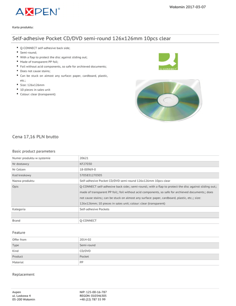 Wołomin 2017-03-07 Karta produktu: Self-adhesive Pocket CD/DVD semi-round 126x126mm 10pcs clear Q-CONNECT self-adhesive back side; Semi-round; With a flap to protect the disc against sliding out; Made of transparent PP foil; Foil without acid components, so safe for archieved documents; Does not cause stains; Can be stuck on almost any surface: paper, cardboard, plastic, etc.; Size: 126x126mm 10 pieces in sales unit Colour: clear (transparent) Cena 17,16 PLN brutto Basic product parameters Numer produktu w systemie 20621 Nr dostawcy KF27030 Nr Celcen 18-00969-0 Kod kreskowy 5705831270305 Nazwa produktu Self-adhesive Pocket CD/DVD semi-round 126x126mm 10pcs clear Opis Q-CONNECT self-adhesive back side;; semi-round;; with a flap to protect the disc against sliding out;; made of transparent PP foil;; foil without acid components, so safe for archieved documents;; does not cause stains;; can be stuck on almost any surface: paper, cardboard, plastic, etc.;; size: 126x126mm; 10 pieces in sales unit; colour: clear (transparent) Kategoria Self-adhesive Pockets Brand Q-CONNECT Feature Offer from 2014-02 Type Semi-round Kind CD/DVD Product Pocket Material PP Replacement Axpen ul. Laskowa 4 05-200 Wołomin NIP: 125-00-16-787 REGON: 010346305 +48 (22) 787 55 99 Wołomin 2017-03-07 Karta katalogowa produktu cd. Self-adhesive Pocket CD/DVD semi-round 126x126mm 10pcs clear Replacement P14109 Procurement vocabulary CPV 30199410-7 Papier samoprzylepny Certifications New product Standard Hit Standard Colour Colour Transparent Pozostałe zdjęcia produktu Serdecznie zapraszamy do współpracy Axpen zespół. Axpen ul. Laskowa 4 05-200 Wołomin NIP: 125-00-16-787 REGON: 010346305 +48 (22) 787 55 99