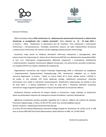 Szanowni Państwo, Zbliża się kolejna edycja XXIII seminarium nt. „Wykonywanie postanowień Konwencji o zakazie broni chemicznej, w szczególności rola i zadania przemysłu”, które odbędzie się 21 - 23 maja 2014 r. w Krynicy – Zdrój. Wydarzenie to skierowane jest do instytucji i firm związanych z przemysłem chemicznym i farmaceutycznym. Tematyka seminarium dotyczy nie tylko implementacji Konwencji o zakazie broni chemicznej, ale również szeroko pojętego bezpieczeństwa chemicznego. Uczestnicy mają szanse na zdobycie aktualnych informacji związanych z wymaganiami, jakie stawia przed nimi Organizacja ds. Zakazu Broni Chemicznej (OPCW) oraz Ministerstwo Gospodarki (MG), w tym m.in. dotyczących przygotowywania deklaracji związanych z prowadzoną działalnością z wykorzystaniem związków chemicznych objętych Konwencją i ich prekursorów, procedur przyjmowania inspekcji OPCW oraz wyboru obiektów do inspekcji itp. Organizatorem seminarium jest Instytut Przemysłu Organicznego (IPO) w Warszawie we współpracy z Departamentem Bezpieczeństwa Gospodarczego MG. Seminarium odbędzie się w Hotelu „Karczma Regionalna” w Krynicy – Zdrój, ul. Czarny Potok 26 A. Koszt udziału wynosi 1.550,00 zł. od osoby, w tym podatek VAT (cena obejmuje noclegi, całodzienne wyżywienie, materiały seminaryjne oraz udział w imprezach towarzyszących). Świadczenia rozpoczynają się kolacją w dniu 20 maja 2014 r., a kończą śniadaniem w dniu 23 maja 2014 r. Powyższą należność uczestnicy seminarium mogą uregulować gotówką na miejscu lub przelewem po otrzymaniu faktury. Zachęcamy Państwa serdecznie do wzięcia udziału w seminarium, mając nadzieję, że wydarzenie okaże się doskonałym miejscem do nawiązania nowych kontaktów i wymiany doświadczeń. Zgłoszenia uczestnictwa prosimy przesyłać najpóźniej do 5 maja br., (faksem lub mailem) do Instytutu Przemysłu Organicznego, nr faksu: 22 811 07 99, email: [email protected] Sprawy związane z organizacją seminarium koordynują: ze strony IPO Pan Maciej Śliwakowski, Kierownik Stałego Zespołu ds. Konwencji, Tel. 22 811 12 31 w. 400 oraz ze strony DBG MG Pani Emilia Klimaszewska, Radca Ministra w DBG, tel. 22 693 58 60. Serdecznie zapraszamy.
