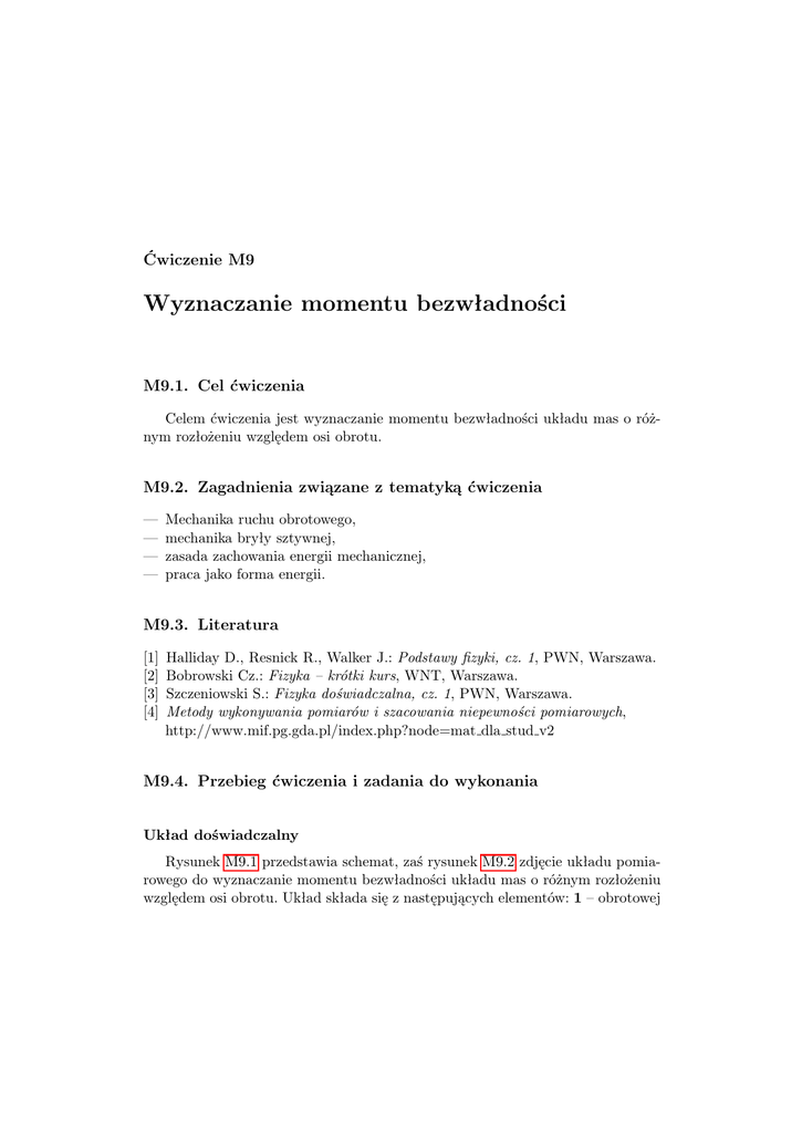 Ćwiczenie M9 Wyznaczanie momentu bezwładności M9.1. Cel ćwiczenia Celem ćwiczenia jest wyznaczanie momentu bezwładności układu mas o różnym rozłożeniu względem osi obrotu. M9.2. Zagadnienia związane z tematyką ćwiczenia — — — — Mechanika ruchu obrotowego, mechanika bryły sztywnej, zasada zachowania energii mechanicznej, praca jako forma energii. M9.3. Literatura [1] [2] [3] [4] Halliday D., Resnick R., Walker J.: Podstawy fizyki, cz. 1, PWN, Warszawa. Bobrowski Cz.: Fizyka – krótki kurs, WNT, Warszawa. Szczeniowski S.: Fizyka doświadczalna, cz. 1, PWN, Warszawa. Metody wykonywania pomiarów i szacowania niepewności pomiarowych, http://www.mif.pg.gda.pl/index.php?node=mat dla stud v2 M9.4. Przebieg ćwiczenia i zadania do wykonania Układ doświadczalny Rysunek M9.1 przedstawia schemat, zaś rysunek M9.2 zdjęcie układu pomiarowego do wyznaczanie momentu bezwładności układu mas o różnym rozłożeniu względem osi obrotu. Układ składa się z następujących elementów: 1 – obrotowej 164 Ćwiczenie M9 rury ułożyskowanej w połowie długości (X), 2, 3 – masywnych dysków (M) o konstrukcji umożliwiającej ich przemieszczanie wzdłuż rury, 4 – odważnika (m) o masie 0,5 kg zawieszonego na nici przerzuconej przez bloczek, 5 – umieszczonej na osi rury szpuli (S) do nawijania nici, 6 – podziałki milimetrowej do pomiaru przemieszczenia odważnika, 7 – masywnej konstrukcji wsporczej, zespolonej ze ścianą laboratorium. Rysunek M9.1. Schemat układu pomiarowego W urządzeniu przygotowanym do pomiarów na szpulę (S) nawinięty jest sznurek obciążony masą m. W miarę opadania masy, szpula wraz z badanym układem (rura i masy dysków) zostaje wprawiona w ruch obrotowy. Po przebyciu drogi h1 , masa osiąga najniższe położenie. Rura uzyskuje wówczas największą prędkość kątową ω i zaczyna nawijać sznurek, podnosząc masę m, tym razem na wysokość h2 . Na skutek siły oporów ruchu T , h2 < h1 . Korzystając z zasady zachowania energii, możemy zapisać następujące równanie: mgh1 = Iω 2 mv 2 + + T h1 , 2 2 (M9.1) w którym T reprezentuje wszystkie opory ruchu układu. Ponieważ energia kinetyczna masy m jest znikomo mała w porównaniu z innymi członami równania 165 Wyznaczanie momentu bezwładności Rysunek M9.2. Zdjęcie układu pomiarowego (M9.1), więc - nie popełniając istotnego błędu - możemy przyjąć mv 2 /2 ≈ 0. Zamiast (M9.1) dostajemy wówczas: mgh1 = Iω 2 + T h1 . 2 (M9.2) Podniesienie masy m na wysokość h2 opisuje również zasada zachowania energii: Iω 2 = mgh2 + T h2 . 2 (M9.3) 166 Ćwiczenie M9 Eliminując z równań (M9.2) i (M9.3) T , otrzymujemy: I = 4mg h1 1h2 1 . h1 + 1h2 ω 2 (M9.4) Aby znaleźć ω, mierzymy czas t oraz określamy liczbę n obrotów badanego układu podczas opadania masy m z wysokości h1 . Ponieważ ruch ten jest jednostajnie przyspieszony, możemy zapisać, że: 2πn . t (M9.5) mg h1 h2 t2 , 8π 2 hsr n2 (M9.6) ω = 2ωsr = 2 Ostatecznie mamy: I= gdzie hsr = h1 + h2 . 2 (M9.7) Zadania do wykonania M9.1. Wyznaczyć moment bezwładności I0 nieobciążonej rury. M9.2. Znaleźć moment bezwładności IM dwóch ciężarków o masach M odległych o R od osi obrotu. W tym celu wyznaczyć moment bezwładności IC poziomej rury obciążonej ciężarkami M i obliczyć IM = IC − I0 . Pomiar wykonać dla dwóch różnych wartości R. M9.3. Obliczyć niepewności pomiaru wyznaczonego momentu bezwładności ∆IM . M9.4. Wyznaczyć wartości teoretycznie IM dla obu wartości R z zależności IM = 2M R2 i porównać je ze zmierzoną wartością IM (zadanie M9.2). M9.5. Rachunek niepewności Niepewności wyznaczenia h, t i n należy oszacować w trakcie wykonywania pomiarów zgodnie z zasadami szacowania niepewności dla pomiarów bezpośrednich. Względną niepewność w oznaczaniu masy m przyjąć równą 0,01 (1%). Niepewność pomiarów momentu bezwładności nieobciążonego pręta I0 oraz pręta obciążonego IC obliczamy jako niepewność wielkości złożonej.