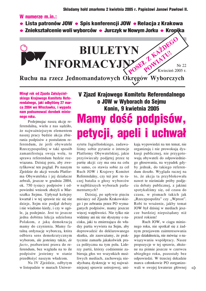 Sk³adamy ho³d zmar³emu 2 kwietnia 2005 r. Papie¿owi Janowi Paw³owi II. W numerze m.in.: Lista patronów JOW Spis konferencji JOW Relacja z Krakowa Zniekszta³cenie woli wyborców Jurczyk w Nowym Jorku Kronika O G E D ¯ ! A U K Z IAT Nr 22 E£ OW S Kwiecieñ 2005 r. PO P Ruchu na rzecz Jednomandatowych Okrêgów Wyborczych BIULETYN INFORMACYJNY Min¹³ rok od Zjazdu Za³o¿ycielskiego Krajowego Komitetu Referendalnego, jaki odbyliœmy 27 marca 2004 we W³oc³awku, i wypada nam podsumowaæ dorobek minionego roku. Podejmuj¹c nasz¹ akcjê referendaln¹, wielu z nas s¹dzi³o, ¿e najwa¿niejszym elementem naszej pracy bêdzie akcja zbierania podpisów z postulatem referendum, ¿e jeœli obywatele Rzeczypospolitej w taki sposób zamanifestuj¹ swoj¹ wolê, to sprawa referendum bêdzie rozwi¹zana. Dzisiaj pora, aby zweryfikowaæ ten pogl¹d. Po naszym ZjeŸdzie do akcji wesz³a Platforma Obywatelska i jej dzia³acze zebrali, jeszcze w grudniu 2004, ok. 750 tysiêcy podpisów i odpowiedni wniosek z³o¿yli u Marsza³ka Sejmu. Up³yn¹³ kolejny kwarta³ i w tej sprawie nic siê nie dzieje, Sejm nie podj¹³ debaty i nie wiadomo kiedy, i czy w ogóle, j¹ podejmie. Jest to jeszcze jedna dobitna lekcja udzielona Polakom, z jak¹ demokracj¹ mamy do czynienia. Mamy fataln¹ ordynacjê wyborcz¹, która odbiera sens demokratycznym wyborom, ale jesteœmy tak¿e, de facto, pozbawieni prawa do referendum, bez wzglêdu na to ile podpisów jesteœmy w stanie przed³o¿yæ naszym w³adcom. Na IV ZjeŸdzie, odbytym w listopadzie w murach Uniwer- V Zjazd Krajowego Komitetu Referendalnego o JOW w Wyborach do Sejmu Konin, 9 kwietnia 2005 Mamy doœæ podpisów, petycji, apeli i uchwa³ sytetu Jagielloñskiego, zadawaliœmy sobie pytanie o intencje Platformy Obywatelskiej, jakie przyœwieca³y podjêtej przez tê partiê akcji: czy ma ona na celu to samo, co stawia sobie za cel Ruch JOW i Krajowy Komitet Referendalny, czy te¿ jest to raczej batalia o g³osy wyborców w najbli¿szych wyborach parlamentarnych? Dzisiaj, po up³ywie piêciu miesiêcy od Zjazdu Krakowskiego i po zebraniu przez PO wymaganych podpisów, mamy jeszcze wiêcej w¹tpliwoœci. Nie tylko nie widzimy ani nic nie s³yszymy o nacisku, jaki ta zmierzaj¹ca do w³adzy partia wywiera na Sejm, aby doprowadziæ do deklarowanego skutku, ale zauwa¿amy, ¿e praktycznie zamar³a jakakolwiek praca polityczna na tym polu. Liderzy partii, którzy codziennie zabieraj¹ g³os we wszystkich mo¿liwych mediach, zachowuj¹ nies³ychan¹ dyskrecjê w tej najwa¿niejszej sprawie ustrojowej, uni- kaj¹ wypowiedzi na ten temat, nie organizuj¹ i nie prowokuj¹ dyskusji publicznej, nie przygotowuj¹ obywateli do odpowiedniego g³osowania, na wypadek gdyby jednak, do takiego referendum dosz³o. Wygl¹da raczej na to, ¿e akcja ta przyblokowa³a nawet te nieœmia³e próby podjêcia debaty publicznej, z jakimi spotykaliœmy siê, od czasu do czasu, w pismach takich jak „Rzeczpospolita” czy „Wprost”. Robi to wra¿enie, jakby temat JOW by³ dzisiaj w mediach jeszcze bardziej niepo¿¹dany ni¿ przed rokiem! Ruch JOW, w ci¹gu minionego roku, nie spotka³ siê z ¿adnym przejawem zainteresowania jego dzia³alnoœci¹, nie mówi¹c o nawi¹zywaniu wspó³pracy. Nasze propozycje w tej sprawie, z³o¿one na piœmie jeszcze w czerwcu ubieg³ego roku, pozosta³y bez odpowiedzi. W trzeciej dekadzie marca cz³onkowie PO zorganizowali w swojej kwaterze g³ównej Kronika Ruchu od IV Krajowego Zjazdu KKR w Krakowie do V Zjazdu KRR w Koninie 9 listopada 2004, Warszawa. Zawi¹za³ siê Œrodowiskowy Komitet Referendalny na rzecz JOW „Operor”. 9 listopada 2004, £owicz. Na zaproszenie Stowarzyszenia „Ziemi £owickiej”, Jerzy Przystawa i W³odzimierz Urbañczak goœcili w Domu Nauczyciela, na spotkaniu z samorz¹dowcami, nauczycielami, przedstawicielami partii politycznych, a tak¿e dziennikarzami lokalnej prasy i radia. Po spotkaniu rozmawiali z burmistrzem £owicza Ryszardem Budza³kiem (Honorowym Patronem Ruchu) i jego zastêpcami. Z³o¿yli te¿ wizytê JE Biskupowi-Seniorowi £owickiemu, ks. dr Alojzemu Orszulikowi, przedstawiaj¹c cele i zadania Ruchu. 10 listopada 2004, £owicz. Jerzy Przystawa i W³odzimierz Urbañczak omawiali ró¿ne aspekty dzia³añ na rzecz JOW z wiceburmistrzem £owicza Maciejem Moñk¹. 12 listopada 2004, Kraków. Na Uniwersytecie Jagielloñskim odby³ siê IV Zjazd Krajowego Komitetu Referendalnego o JOW (relacja J. Sanockiego – str. 8). 12 listopada 2004. Kraków. W „Kronice Krakowskiej”, ma³opolskim programie regionalnym TVP3, przedstawiono relacjê ze Zjazdu Krakowskiego. Poinformowano o idei 460 jednomandatowych okrêgów, cytowano: prof. Tomasza G¹sowskiego, prof. Jerzego Przystawê, Janusza Sanockiego. Redaktor „Kroniki” Dariusz Bohatkiewicz w podsumowaniu powiedzia³: Zmiana ordynacji wyborczej w naszym kraju wydaje siê nie tyle potrzebna, co niezbêdna, szczególnie po obserwacji ostatnich wydarzeñ na polskiej scenie politycznej. A takim ruchom, jak Inicjatywa na rzecz Jednomandatowych Okrêgów Wyborczych nale¿y tylko przyklasn¹æ i kibicowaæ – szczególnie dlatego, ¿e na pewno osoby te nie znajd¹ poparcia wœród wiêkszoœci polskich parlamentarzystów. 12 listopada 2004, Czerwonka, woj. mazowieckie. Rada Gminy w Czerwonce podjê³a uchwa³ê w sprawie poparcia projektu zmiany ordynacji wyborczej do Sejmu i Senatu RP. 16 listopada 2004, Kietrz. Z inicjatywy burmistrza m. Kietrza p. Józefa Mateli powo³ano nowy komitet referendalny. 18 listopada 2004, Arlington, USA. Zmar³a wielka, ofiarna, Polka, Alina Kozio³-Starczewska-Byrska, która od ponad 25 lat ze wszystkich si³ dzia³a³a i wspomaga³a Polaków walcz¹cych w Kraju o woln¹, suwerenn¹ i niepodleg³¹ Polskê. Razem z mê¿em, Zbigniewem Byrskim, znanym publicyst¹ „Kultury”, na najró¿niejsze sposoby ofiarnie wspierali ludzi zaanga¿owanych w podziemny ruch „Solidarnoœci”, w „Solidarnoœæ Walcz¹c¹”, a potem, od s