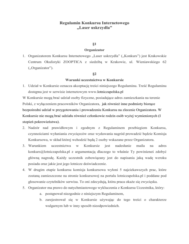 Regulamin Konkursu Internetowego „Laser uskrzydla” §1 Organizator 1. Organizatorem Konkursu Internetowego „Laser uskrzydla” („Konkurs”) jest Krakowskie Centrum Okulistyki ZOOPTICA z siedzibą w Krakowie, ul. Wieniawskiego 62 („Organizator”). §2 Warunki uczestnictwa w Konkursie 1. Udział w Konkursie oznacza akceptację treści niniejszego Regulaminu. Treść Regulaminu dostępna jest w serwisie internetowym www.lotniczapolska.pl W Konkursie mogą brać udział osoby fizyczne, posiadające adres zamieszkania na terenie Polski, z wyłączeniem pracowników Organizatora, jak równieŜ inne podmioty biorące bezpośredni udział w przygotowaniu i prowadzeniu Konkursu na zlecenie Organizatora. W Konkursie nie mogą brać udziału równieŜ członkowie rodzin osób wyŜej wymienionych (I stopień pokrewieństwa). 2. Nadzór nad prawidłowym i zgodnym z Regulaminem przebiegiem Konkursu, czynnościami wyłaniania zwycięzców oraz wydawania nagród prowadzić będzie Komisja Konkursowa, w skład której wchodzić będą 2 osoby wskazane przez Organizatora. 3. Warunkiem uczestnictwa w Konkursie jest nadesłanie maila na adres [email protected] z argumentacją dlaczego to właśnie Ty powinieneś zdobyć główną nagrodę. KaŜdy uczestnik zobowiązany jest do napisania jaką wadę wzroku posiada oraz jakie jest jego lotnicze doświadczenie. 4. W drugim etapie konkursu komisja konkursowa wyłoni 5 najciekawszych prac, które zostaną zamieszczone na stronie konkursowej na portalu lotniczapolska.pl i poddane pod głosowanie czytelników serwisu. To oni zdecydują, która praca okaŜe się zwycięska. 5. Organizator ma prawo do natychmiastowego wykluczenia z Konkursu Uczestnika, który: a. postępował niezgodnie z niniejszym Regulaminem, b. zarejestrował się w Konkursie uŜywając do tego treści o charakterze wulgarnym lub w inny sposób nieodpowiednich. §3 Czas trwania Konkursu 1. Konkurs trwa w dniach 14.06.2010 – 14.07.2010. 2. Ostatnim dniem przyjmowania zgłoszeń jest 14.07.2010 r. (godz. 23:59:59). 3. Głosowanie Internautów odbędzie się w terminie 15-28 lipca 4. Rozstrzygnięcie Konkursu nastąpi w dniu 02.08.2010 r. §4 Nagrody 1. Nagrodzone zostanie 5 osób. W Konkursie przewidziano nagrody – zabieg i zniŜki na zabiegi w Krakowskim Centrum Okulistycznym Zooptica. Nagroda za 1 miejsce – laserowa korekcja wzroku w Krakowskim Centrum Okulistycznym Zooptica. Nagroda za 2-5 miejsce – 30% zniŜki na zabieg laserowy w Krakowskim Centrum Okulistycznym Zooptica. 2. Po wyłonieniu zwycięzcy Organizator skontaktuje się za pomocą poczty e-mail z laureatem w celu uzgodnienia szczegółów odbioru nagrody. 3. Nagroda nie podlega wymianie na inną lub na ekwiwalent pienięŜny. Uczestnicy nie mają prawa zastrzeŜenia szczególnych właściwości nagród. 4. Decyzje Komisji są ostateczne. §5 Wyłączenia Organizator nie ponosi odpowiedzialności za połączenia i funkcjonowanie sprzętu telefonicznego, usługi pocztowe i kurierskie lub za działalność osób trzecich. Organizator nie ponosi odpowiedzialności za niepoprawne działanie aplikacji wynikające z przyczyn niezaleŜnych od niego, a w szczególności za brak dostępu do sieci Internet, zakłóceń w działaniu sieci szkieletowej, niezapisanie zgłoszenia w Konkursie w www.lotniczapolska.pl oraz niemoŜności połączenia się z serwisem lub jego częścią. serwisie