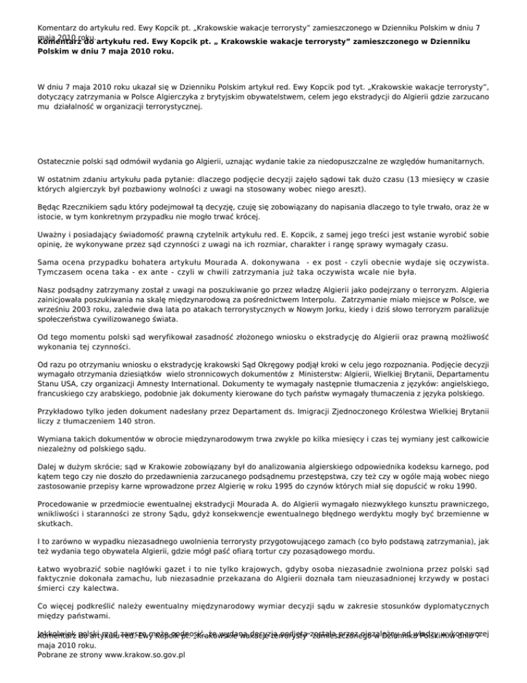 Komentarz do artykułu red. Ewy Kopcik pt. „Krakowskie wakacje terrorysty” zamieszczonego w Dzienniku Polskim w dniu 7 maja 2010 roku. Komentarz do artykułu red. Ewy Kopcik pt. „ Krakowskie wakacje terrorysty” zamieszczonego w Dzienniku Polskim w dniu 7 maja 2010 roku. W dniu 7 maja 2010 roku ukazał się w Dzienniku Polskim artykuł red. Ewy Kopcik pod tyt. „Krakowskie wakacje terrorysty”, dotyczący zatrzymania w Polsce Algierczyka z brytyjskim obywatelstwem, celem jego ekstradycji do Algierii gdzie zarzucano mu działalność w organizacji terrorystycznej. Ostatecznie polski sąd odmówił wydania go Algierii, uznając wydanie takie za niedopuszczalne ze względów humanitarnych. W ostatnim zdaniu artykułu pada pytanie: dlaczego podjęcie decyzji zajęło sądowi tak dużo czasu (13 miesięcy w czasie których algierczyk był pozbawiony wolności z uwagi na stosowany wobec niego areszt). Będąc Rzecznikiem sądu który podejmował tą decyzję, czuję się zobowiązany do napisania dlaczego to tyle trwało, oraz że w istocie, w tym konkretnym przypadku nie mogło trwać krócej. Uważny i posiadający świadomość prawną czytelnik artykułu red. E. Kopcik, z samej jego treści jest wstanie wyrobić sobie opinię, że wykonywane przez sąd czynności z uwagi na ich rozmiar, charakter i rangę sprawy wymagały czasu. Sama ocena przypadku bohatera artykułu Mourada A. dokonywana - ex post - czyli obecnie wydaje się oczywista. Tymczasem ocena taka - ex ante - czyli w chwili zatrzymania już taka oczywista wcale nie była. Nasz podsądny zatrzymany został z uwagi na poszukiwanie go przez władzę Algierii jako podejrzany o terroryzm. Algieria zainicjowała poszukiwania na skalę międzynarodową za pośrednictwem Interpolu. Zatrzymanie miało miejsce w Polsce, we wrześniu 2003 roku, zaledwie dwa lata po atakach terrorystycznych w Nowym Jorku, kiedy i dziś słowo terroryzm paraliżuje społeczeństwa cywilizowanego świata. Od tego momentu polski sąd weryfikował zasadność złożonego wniosku o ekstradycję do Algierii oraz prawną możliwość wykonania tej czynności. Od razu po otrzymaniu wniosku o ekstradycję krakowski Sąd Okręgowy podjął kroki w celu jego rozpoznania. Podjęcie decyzji wymagało otrzymania dziesiątków wielo stronnicowych dokumentów z Ministerstw: Algierii, Wielkiej Brytanii, Departamentu Stanu USA, czy organizacji Amnesty International. Dokumenty te wymagały następnie tłumaczenia z języków: angielskiego, francuskiego czy arabskiego, podobnie jak dokumenty kierowane do tych państw wymagały tłumaczenia z języka polskiego. Przykładowo tylko jeden dokument nadesłany przez Departament ds. Imigracji Zjednoczonego Królestwa Wielkiej Brytanii liczy z tłumaczeniem 140 stron. Wymiana takich dokumentów w obrocie międzynarodowym trwa zwykle po kilka miesięcy i czas tej wymiany jest całkowicie niezależny od polskiego sądu. Dalej w dużym skrócie; sąd w Krakowie zobowiązany był do analizowania algierskiego odpowiednika kodeksu karnego, pod kątem tego czy nie doszło do przedawnienia zarzucanego podsądnemu przestępstwa, czy też czy w ogóle mają wobec niego zastosowanie przepisy karne wprowadzone przez Algierię w roku 1995 do czynów których miał się dopuścić w roku 1990. Procedowanie w przedmiocie ewentualnej ekstradycji Mourada A. do Algierii wymagało niezwykłego kunsztu prawniczego, wnikliwości i staranności ze strony Sądu, gdyż konsekwencje ewentualnego błędnego werdyktu mogły być brzemienne w skutkach. I to zarówno w wypadku niezasadnego uwolnienia terrorysty przygotowującego zamach (co było podstawą zatrzymania), jak też wydania tego obywatela Algierii, gdzie mógł paść ofiarą tortur czy pozasądowego mordu. Łatwo wyobrazić sobie nagłówki gazet i to nie tylko krajowych, gdyby osoba niezasadnie zwolniona przez polski sąd faktycznie dokonała zamachu, lub niezasadnie przekazana do Algierii doznała tam nieuzasadnionej krzywdy w postaci śmierci czy kalectwa. Co więcej podkreślić należy ewentualny międzynarodowy wymiar decyzji sądu w zakresie stosunków dyplomatycznych między państwami. Jakkolwiek rząd zawsze może podnosić, że wydana decyzja podjęta została przez niezależny od władzy wykonawczej Komentarz polski do artykułu red. Ewy Kopcik pt. „Krakowskie wakacje terrorysty” zamieszczonego w Dzienniku Polskim w dniu 7 maja 2010 roku. Pobrane ze strony www.krakow.so.gov.pl Komentarz do artykułu red. Ewy Kopcik pt. „Krakowskie wakacje terrorysty” zamieszczonego w Dzienniku Polskim w dniu 7 maja 2010 roku. sąd, to łatwo wyobrazić sobie można krytyczne noty władzy wykonawczej Wielkiej Brytanii czy Republiki Algierii gdyby decyzja taka była powierzchowna i niedostatecznie uzasadniona. Na marginesie dostrzec należy, iż obecnie od września 2009 roku oczekuje na ekstradycję z jednego z krajów Europy do Stanów Zjednoczonych pewien wybitny reżyser. Mimo że ewentualna decyzja w tej materii, z uwagi na potencjalne zagrożenie ze strony osoby której dotyczy, ma zdecydowanie mniejszy wymiar społeczny od omawianego polskiego przykładu, jak też wydaje się prostsza prawnie i ma się między państwami o najwyższych standardach prawnych (USA - Szwajcaria), to cały czas nie zapadła. W kontekście tego co przedstawiono powyżej sugestia o przewlekłości postępowania, w przedmiocie ekstradycji, przed polskim sądem nie wydaje się trafna. Rzecznik Prasowy Sądu Okręgowego w Krakowie SSO Rafał Lisak Komentarz do artykułu red. Ewy Kopcik pt. „Krakowskie wakacje terrorysty” zamieszczonego w Dzienniku Polskim w dniu 7 maja 2010 roku. Pobrane ze strony www.krakow.so.gov.pl Komentarz do artykułu red. Ewy Kopcik pt. „Krakowskie wakacje terrorysty” zamieszczonego w Dzienniku Polskim w dniu 7 maja 2010 roku. Komentarz do artykułu red. Ewy Kopcik pt. „Krakowskie wakacje terrorysty” zamieszczonego w Dzienniku Polskim w dniu 7 maja 2010 roku. Pobrane ze stro