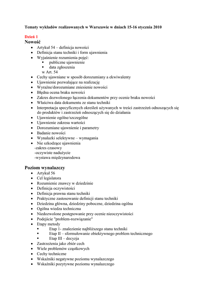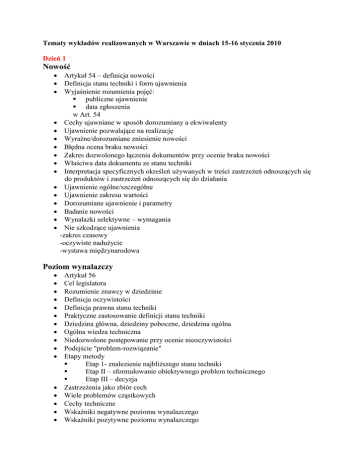 Tematy wykładów realizowanych w Warszawie w dniach 15-16 stycznia 2010 Dzień 1 Nowość Artykuł 54 – definicja nowości Definicja stanu techniki i form ujawnienia Wyjaśnienie rozumienia pojęć: publiczne ujawnienie data zgłoszenia w Art. 54 Cechy ujawniane w sposób dorozumiany a ekwiwalenty Ujawnienie pozwalające na realizację Wyraźne/dorozumiane zniesienie nowości Błędna ocena braku nowości Zakres dozwolonego łączenia dokumentów przy ocenie braku nowości Właściwa data dokumentu ze stanu techniki Interpretacja specyficznych określeń używanych w treści zastrzeżeń odnoszących się do produktów i zastrzeżeń odnoszących się do działania Ujawnienie ogólne/szczególne Ujawnienie zakresu wartości Dorozumiane ujawnienie i parametry Badanie nowości Wynalazki selektywne – wymagania Nie szkodzące ujawnienia -zakres czasowy -oczywiste nadużycie -wystawa międzynarodowa Poziom wynalazczy Artykuł 56 Cel legislatora Rozumienie znawcy w dziedzinie Definicja oczywistości Definicja prawna stanu techniki Praktyczne zastosowanie definicji stanu techniki Dziedzina główna, dziedziny poboczne, dziedzina ogólna Ogólna wiedza techniczna Niedozwolone postępowanie przy ocenie nieoczywistości Podejście "problem-rozwiązanie" Etapy metody Etap 1- znalezienie najbliższego stanu techniki Etap II – sformułowanie obiektywnego problem technicznego Etap III – decyzja Zastrzeżenia jako zbiór cech Wiele problemów cząstkowych Cechy techniczne Wskaźniki negatywne poziomu wynalazczego Wskaźniki pozytywne poziomu wynalazczego Dzień 2 Jasność, zrozumiałość zastrzeżeń: Art 84 Kategorie i typy zastrzeżeń Jasny – co to oznacza Jasność a nowość Cechy strukturalne a funkcjonalne „Zawierający” a „składający się” Brakująca cecha istotna „Około”, „w przybliżeniu” Pojęcia względne Wynalazki zdefiniowane przez parametry Definicja poprzez osiągany rezultat Niespójność opisu i brak poparcia Źródła trudności z Art. 84 Forma zastrzeżeń Wyrażenia w nawiasach w zastrzeżeniach Wyczerpujące ujawnienie a jasność zastrzeżenia Jasność zastrzeżeń w procedurze sprzeciwowej Przedmiot dodany: Definicja przedmiotu dodanego Przykłady poprawek niedopuszczalnych zgodnie z Art 123(2) Odniesienie do zastosowania Art 123(2) Inne przypadki niedozwolonych zmian Rozszerzenie cech z zastrzeżeń Cechy z dokumentu powoływanego Test na istotność cechy Uogólnienie pośrednie Zmiana postawionego problemu technicznego Zmodyfikowany test na nowość Zgłoszenia wydzielone a przedmiot dodany Poprawianie błędów R139 Poprawianie błędów przy zgłoszeniu R56