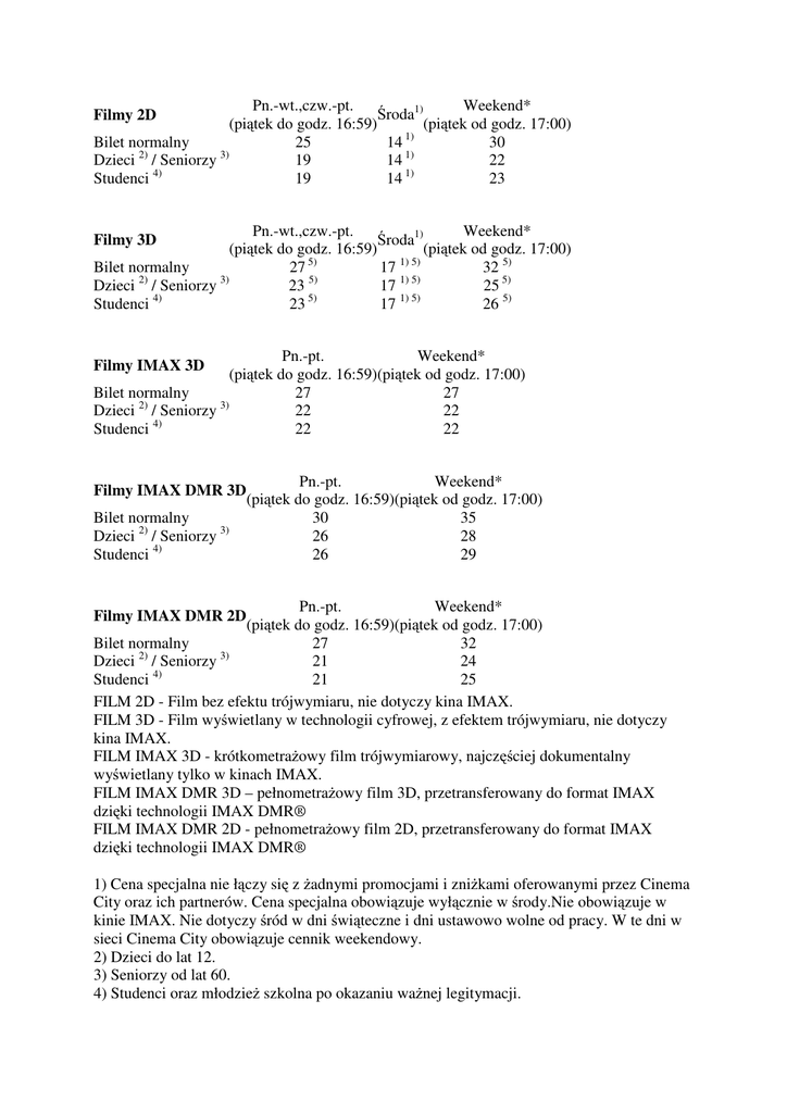 Pn.-wt.,czw.-pt. Weekend* Środa1) (piątek od godz. 17:00) (piątek do godz. 16:59) Bilet normalny 25 14 1) 30 2) 3) 1) Dzieci / Seniorzy 19 14 22 Studenci 4) 19 14 1) 23 Filmy 2D Pn.-wt.,czw.-pt. Weekend* Środa1) (piątek do godz. 16:59) (piątek od godz. 17:00) Bilet normalny 27 5) 17 1) 5) 32 5) 2) 3) 5) 1) 5) Dzieci / Seniorzy 23 17 25 5) Studenci 4) 23 5) 17 1) 5) 26 5) Filmy 3D Pn.-pt. Weekend* (piątek do godz. 16:59)(piątek od godz. 17:00) Bilet normalny 27 27 Dzieci 2) / Seniorzy 3) 22 22 4) Studenci 22 22 Filmy IMAX 3D Filmy IMAX DMR 3D Bilet normalny Dzieci 2) / Seniorzy 3) Studenci 4) Pn.-pt. Weekend* (piątek do godz. 16:59)(piątek od godz. 17:00) 30 35 26 28 26 29 Weekend* Pn.-pt. (piątek do godz. 16:59)(piątek od godz. 17:00) Bilet normalny 27 32 2) 3) Dzieci / Seniorzy 21 24 Studenci 4) 21 25 FILM 2D - Film bez efektu trójwymiaru, nie dotyczy kina IMAX. FILM 3D - Film wyświetlany w technologii cyfrowej, z efektem trójwymiaru, nie dotyczy kina IMAX. FILM IMAX 3D - krótkometrażowy film trójwymiarowy, najczęściej dokumentalny wyświetlany tylko w kinach IMAX. FILM IMAX DMR 3D – pełnometrażowy film 3D, przetransferowany do format IMAX dzięki technologii IMAX DMR® FILM IMAX DMR 2D - pełnometrażowy film 2D, przetransferowany do format IMAX dzięki technologii IMAX DMR® Filmy IMAX DMR 2D 1) Cena specjalna nie łączy się z żadnymi promocjami i zniżkami oferowanymi przez Cinema City oraz ich partnerów. Cena specjalna obowiązuje wyłącznie w środy.Nie obowiązuje w kinie IMAX. Nie dotyczy śród w dni świąteczne i dni ustawowo wolne od pracy. W te dni w sieci Cinema City obowiązuje cennik weekendowy. 2) Dzieci do lat 12. 3) Seniorzy od lat 60. 4) Studenci oraz młodzież szkolna po okazaniu ważnej legitymacji. 5) W przypadku filmów 3D doliczana jest opłata 3 zł, która zostanie dodana do Państwa biletu. W zamian otrzymają Państwo okulary do oglądania filmów 3D. Zachęcamy do zabrania tych okularów ze sobą po seansie. Można ich użyć przy kolejnej wizycie w naszym kinie a opłata ta nie będzie doliczana. * Ceny weekendowe obowiązują również w dni świąteczne i dni ustawowo wolne od pracy. Wszystkie ceny podano w PLN i zawierają one podatek VAT. UWAGA (nie dotyczy kina IMAX): Do obejrzenia filmu 3D niezbędne są specjalne okulary 3D – do nabycia w kasach kina. Cena biletu nie zawiera opłaty 3D. Jest ona doliczana w trakcie zakupu biletu na seans, a okulary wręczane są na bramce prowadzącej do sal kinowych. Po obejrzeniu filmu nie wyrzucaj okularów. Zabierz je ze sobą na kolejny seans 3D, a nie będziesz ponosić opłaty 3D przy zakupie biletu na inne filmy w tej technologii. • Jeżeli Twoje okulary 3D ulegną zarysowaniu lub odbarwieniu postrzeganie efektu 3D może być utrudnione. W takim przypadku zaleca się zakupić nową parę okularów przy kolejnej wizycie w kinie. • Prosimy o sprawdzenie czy okulary 3D nie są uszkodzone lub zarysowane zaraz po otrzymaniu i otwarciu opakowania. Okulary używane lub zabrane do domu nie podlegają reklamacji. • Okulary 3D mogą nie działać w innym kinie niż to, w którym zostały zakupione. UWAGA (dotyczy tylko kina IMAX): W kinie IMAX na czas seansu, otrzymacie Państwo okulary przy wejściu na salę. Prosimy o ich zwrot obsłudze kina po zakończonym seansie. Akceptujemy następujące karty płatnicze i kredytowe: Visa, Visa Electron, Master Card, Master Card Electronic i Maestro.
