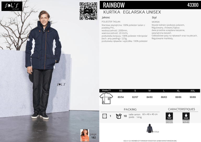 RAINBOW 43300 not found: KURTKA ŻEGLARSKA UNISEX Jakosc Styl POLIESTER TASLAN MORSKI Wysoki kołnierz podszyty polarem, Regulowany, chowany kaptur, dwie przednie ocieplane kieszenie, wewnętrzna kieszeń. Odblaskowe pasy na rękawach oraz na plecach, Regulowane mankiety, Warstwa zewnętrzna: 100% poliester taslan z powłoką PVC, wodoszczelność: 2000mm, wiatroszczelność: 20 l/m²/s, podszewka korpusu: 100% poliester mikropolar (tech. anty-peeling) / 225g, podszewka rękawów i wyściółka: 100% poliester Wielko?? XS S M L XL XXL 80/54 82/57 84/60 86/63 88/66 90/69 PACKING _____________________________________ 1 page CARACTERISTIQUES ____________________ taille carton: 60 x 40 x 40 cm 10 poids : 14 kg Night blue 182 SOL'S® IS A MEMBER OF FAIRWEAR FONDATION / WWW.FAIRWEAR.ORG