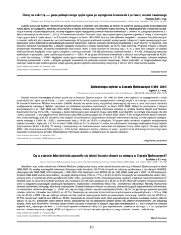 Chorzy na cukrzycę — grupa podwyższonego ryzyka zgonu po wystąpieniu krwawienia i perforacji wrzodu trawiennego Thomsen R.W. i wsp. Diabetes and 30-day mortality from peptic ulcer bleeding and perforation. A Danish population-based cohort study. Diabetes Care 2006; 29: 805 Autorzy duńskiego badania kohortowego opublikowanego w Diabetes Care dowodzą, że chorzy na cukrzycę stanowią grupę podwyższonego ryzyka zgonu po wystąpieniu perforacji lub krwawienia z wrzodu trawiennego. Niekorzystny wpływ cukrzycy na przebieg choroby wrzodowej wykazano już w jednej z wcześniejszych prac, w której względne ryzyko wystąpienia powikłań wrzodów trawiennych u chorych na cukrzycę oceniono na 3,1 (95-procentowy przedział ufności 1,2–4,3). W omawianym badaniu Thomsen i wsp. wykorzystali rejestry wypisów szpitalnych i bazy z informacjami dotyczącymi recept zrealizowanych w 3 duńskich okręgach w latach 1991–2003. Autorzy zidentyfikowali wszystkich pacjentów hospitalizowanych z powodu perforacji lub krwawienia z wrzodu trawiennego. W tej grupie analizowali częstość występowania cukrzycy i chorób towarzyszących oraz stosowanie leków potencjalnie uszkadzających przewód pokarmowy. Głównie oceniano 30-dniową śmiertelność u osób chorych na cukrzycę i bez cukrzycy. Spośród 7232 pacjentów, u których wystąpiło krwawienie z wrzodu trawiennego, aż 10,1% miało cukrzycę. W grupie chorych, u których występowało krwawienie, 30-dniowa śmiertelność była równa 16,6% u osób chorych na cukrzycę oraz 10,1% u osób bez cukrzycy. W analizie wieloczynnikowej względne ryzyko zgonu związane z cukrzycą wynosiło 1,40 (95-procentowy przedział ufności 1,15–1,70). Analogiczną zależność stwierdzono w przypadku osób z perforacją wrzodów (n = 2061). W tej grupie 30-dniowa śmiertelność u chorych na cukrzycę wynosiła aż 42,9%, a u osób bez cukrzycy — 24,0%. Względne ryzyko zgonu związane z cukrzycą oceniono na 1,51 (1,15–1,98). Podsumowując, cukrzyca zwiększa 30-dniową śmiertelność u osób, u których wystąpiło krwawienie lub preforacja wrzodu trawiennego. Warto podkreślić, że przeprowadzenie tego ważnego badania było możliwe głównie dzięki wysokiej jakości rejestrów dokumentacji medycznej, z których słyną kraje skandynawskie. Data ukazania się notatki: 25 kwietnia 2006 Opracowane na podstawie: Diabetes Care/kwiecień 2006 Krzysztof Kurek Epidemiologia otyłości w Stanach Zjednoczonych (1999–2004) Ogden C.L. i wsp. Prevalence of overweight and obesity in the United States, 1999–2004. JAMA 2006; 295: 1549 Otyłość stanowi narastający problem publiczny w Stanach Zjednoczonych. Od 1980 do 2002 roku częstość jej występowania u osób powyżej 20 roku życia podwoiła się. U dzieci i nastolatków (6–19 lat) częstość występowania nadwagi uległa w tym samym czasie potrojeniu. W Journal of American Medical Association (JAMA) ukazały się wyniki pracy oryginalnej zawierającej najnowsze dane dotyczące częstości występowania nadwagi i otyłości, uzyskane na podstawie pomiarów wykonanych w latach 2003–2004. Wskaźniki porównano z danymi pochodzącymi z lat 1999–2000 oraz 2001–2002. Podstawę analizy stanowiły informacje zebrane w ramach National Health and Nutrition Examination Survey (NHANES). Nadwagę u dzieci definiowano jako wskaźnik masy ciała (BMI) powyżej 95% percentyla właściwego dla płci i wieku badanych. U dorosłych otyłość definiowano jako BMI przekraczające 30. W latach 2003–2004 17,1% amerykańskich dzieci i nastolatków miało nadwagę, a 32,2% dorosłych było otyłych. W porównaniu z poprzednimi analizami odnotowano istotny wzrost częstości występowania nadwagi z 13,8% do 16,0% u dziewczynek oraz z 14,0% do 18,2% u chłopców. W grupie osób dorosłych częstość występowania otyłości wzrosła u mężczyzn z 27,5% w latach 1999–2000 do 31,1% obecnie. U kobiet nie odnotowano istotnego zwiększenia liczby otyłych (odpowiednio 33,4% i 33,2%). W żadnej z subpopulacji nie zaobserwowano natomiast zmniejszenia liczby osób otyłych. Skrajną otyłość (BMI ≥ 40) obserwowano u 2,8% mężczyzn i 6,9% kobiet. Wykazano istotne, zależne od wieku i pochodzenia etnicznego różnice dotyczące częstości występowania otyłości. Szczegółowe informacje zawarto w dołączonych do raportu tabelach. Data ukazania się notatki: 24 kwietnia 2006 Opracowane na podstawie: JAMA/5 kwietnia 2006 Magdalena Lipczyńska Czy w ostatnim dziesięcioleciu poprawiła się jakość leczenia chorych na cukrzycę w Stanach Zjednoczonych? Saaddine J.B. i wsp. Improvements in diabetes processes of care and intermediate outcomes: United States, 1988–2002. Ann. Intern. Med. 2006; 144: 465 Saaddine i wsp. na łamach Annals of Internal Medicine podjęli próbę oceny zmian jakości leczenia cukrzycy w Stanach Zjednoczonych w latach 1988–2002. Do analizy wykorzystali informacje dotyczące osób dorosłych (18–75 lat) chorych na cukrzycę, pochodzące z baz danych NHANES, obejmujące lata 1988–1994 (1024 badanych) i 1999–2002 (750 badanych) oraz BRFSS dla lat 1995 (3065 badanych) i 2002 (13 078 badanych). W latach 1988–2002 średnie stężenie HbA1c nie uległo istotnej zmianie (7,8% vs. 7,7%), z 24,5% do 20,6% zmniejszyła się natomiast liczba osób z HbA1c powyżej 9,0%, a z 34,25% do 47,0% wzrosła liczba osób z HbA1c wynoszącym 6–8%. Znaczącą poprawę uzyskano w zakresie parametrów lipidowych. Odsetek osób ze stężeniem cholesterolu frakcji LDL mniejszym niż 130 mg% zwiększył się z 42,4% do 64,2%. Również korzystne tendencje obserwowano w przypadku pozostałych składowych lipidogramu: triglicerydów, cholesterolu frakcji HDL i cholesterolu całkowitego. Niestety skuteczność leczenia nadciśnienia tętniczego istotnie się nie poprawiła. Odsetek badanych chorych na cukrzycę, charakteryzujących się prawidłowo kontrolowanymi wartościami ciśnienia tętniczego (<