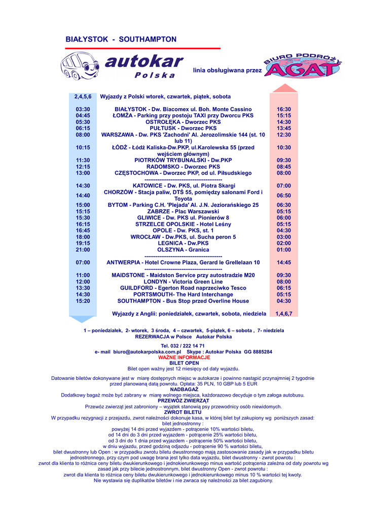 BIAŁYSTOK - SOUTHAMPTON linia obsługiwana przez 2,4,5,6 Wyjazdy z Polski wtorek, czwartek, piątek, sobota 03:30 04:45 05:30 06:15 08:00 BIAŁYSTOK - Dw. Biacomex ul. Boh. Monte Cassino ŁOMŻA - Parking przy postoju TAXI przy Dworcu PKS OSTROŁĘKA - Dworzec PKS PUŁTUSK - Dworzec PKS WARSZAWA - Dw. PKS 'Zachodni' Al. Jerozolimskie 144 (st. 10 lub 11) ŁÓDŹ - Łódź Kaliska-Dw.PKP, ul.Karolewska 55 (przed wejściem głównym) PIOTRKÓW TRYBUNALSKI - Dw.PKP RADOMSKO - Dworzec PKS CZĘSTOCHOWA - Dworzec PKP, od ul. Piłsudskiego -----------------------------------------KATOWICE - Dw. PKS, ul. Piotra Skargi CHORZÓW - Stacja paliw, DTŚ 55, pomiędzy salonami Ford i Toyota BYTOM - Parking C.H. 'Plejada' Al. J.N. Jeziorańskiego 25 ZABRZE - Plac Warszawski GLIWICE - Dw. PKS ul. Pionierów 8 STRZELCE OPOLSKIE - Hotel Leśny OPOLE - Dw. PKS, st. 1 WROCŁAW - Dw.PKS, ul. Sucha peron 5 LEGNICA - Dw.PKS OLSZYNA - Granica -----------------------------------------ANTWERPIA - Hotel Crowne Plaza, Gerard le Grellelaan 10 -----------------------------------------MAIDSTONE - Maidston Service przy autostradzie M20 LONDYN - Victoria Green Line GUILDFORD - Egerton Road naprzeciwko Tesco PORTSMOUTH- The Hard Interchange SOUTHAMPTON - Bus Stop przed Overline House 16:30 15:15 14:30 13:45 12:30 Wyjazdy z Anglii: poniedziałek, czwartek, sobota, niedziela 1,4,6,7 10:15 11:30 12:15 13:00 14:30 14:40 15:00 15:15 15:30 16:15 16:45 18:00 19:15 21:00 07:00 11:00 12:00 13:30 14:30 15:20 10:30 09:30 08:45 08:00 07:00 06:50 06:30 05:15 06:00 05:15 04:30 03:00 02:00 01:00 14:45 09:30 08:00 06:15 05:15 04:30 1 – poniedziałek, 2- wtorek, 3 środa, 4 – czwartek, 5-piątek, 6 – sobota , 7- niedziela REZERWACJA w Polsce Autokar Polska Tel. 032 / 222 14 71 e- mail [email protected] Skype : Autokar Polska GG 8885284 WAŻNE INFORMACJE BILET OPEN Bilet open ważny jest 12 miesięcy od daty wyjazdu. Datowanie biletów dokonywane jest w miarę dostępnych miejsc w autokarze i powinno nastąpić przynajmniej 2 tygodnie przed planowaną datą powrotu. Opłata: 35 PLN, 10 GBP lub 5 EUR NADBAGAŻ Dodatkowy bagaż może być zabrany w miarę wolnego miejsca, każdorazowo decyduje o tym załoga autobusu. PRZEWÓZ ZWIERZĄT Przewóz zwierząt jest zabroniony – wyjątek stanowią psy przewodnicy osób niewidomych. ZWROT BILETU W przypadku rezygnacji z przejazdu, zwrot należności dokonuje kasa, w której bilet był zakupiony wg poniższych zasad: bilet jednostronny : powyżej 14 dni przed wyjazdem - potrącenie 10% wartości biletu, od 14 dni do 3 dni przed wyjazdem - potrącenie 25% wartości biletu, od 3 dni do 1 dnia przed wyjazdem - potrącenie 50% wartości biletu, w dniu wyjazdu, przed godziną odjazdu - potrącenie 90 % wartości biletu, bilet dwustronny lub Open : w przypadku zwrotu biletu dwustronnego mają zastosowanie zasady jak w przypadku biletu jednostronnego, przy czym pod uwagę brana jest tylko data wyjazdu, bilet dwustronny - zwrot powrotu : zwrot dla klienta to różnica ceny biletu dwukierunkowego i jednokierunkowego minus wartość potrącenia zależna od daty powrotu wg zasad jak przy bilecie jednostronnym, bilet dwustronny Open - zwrot powrotu : zwrot dla klienta to różnica ceny biletu dwukierunkowego i jednokierunkowego minus 10 % wartości tej kwoty. Nie wystawia się duplikatów biletów i nie zwraca się należności za bilet zagubiony. Przy zwrotach biletów zakupionych przez moduł Euroticket www Oferent biletu / Autokar Polska /pobiera opłatę manipulacyjną w wysokości 10 % wartości biletu zgodnie z Regulaminem korzystania z modułu Euroticket www. Osoby nieletnie winny posiadać upoważnienie do przewozu osoby nieletniej /druk na stronie www.autokarpolska .com.pl w dziale dla agentów / Uwaga: Pasażer proszony jest o stawienie się 15 min przed planowanym odjazdem autokaru.