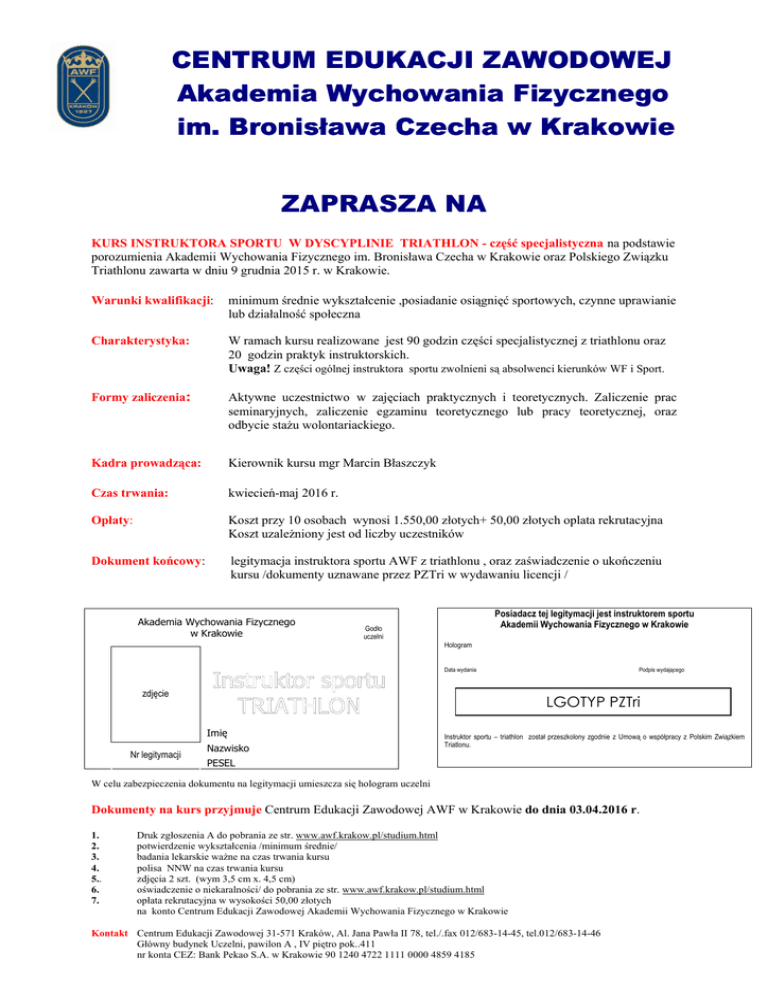 CENTRUM EDUKACJI ZAWODOWEJ Akademia Wychowania Fizycznego im. Bronisława Czecha w Krakowie ZAPRASZA NA KURS INSTRUKTORA SPORTU W DYSCYPLINIE TRIATHLON - część specjalistyczna na podstawie porozumienia Akademii Wychowania Fizycznego im. Bronisława Czecha w Krakowie oraz Polskiego Związku Triathlonu zawarta w dniu 9 grudnia 2015 r. w Krakowie. Warunki kwalifikacji: minimum średnie wykształcenie ,posiadanie osiągnięć sportowych, czynne uprawianie lub działalność społeczna Charakterystyka: W ramach kursu realizowane jest 90 godzin części specjalistycznej z triathlonu oraz 20 godzin praktyk instruktorskich. Uwaga! Z części ogólnej instruktora sportu zwolnieni są absolwenci kierunków WF i Sport. Formy zaliczenia: Aktywne uczestnictwo w zajęciach praktycznych i teoretycznych. Zaliczenie prac seminaryjnych, zaliczenie egzaminu teoretycznego lub pracy teoretycznej, oraz odbycie stażu wolontariackiego. Kadra prowadząca: Kierownik kursu mgr Marcin Błaszczyk Czas trwania: kwiecień-maj 2016 r. Opłaty: Koszt przy 10 osobach wynosi 1.550,00 złotych+ 50,00 złotych oplata rekrutacyjna Koszt uzależniony jest od liczby uczestników Dokument końcowy: legitymacja instruktora sportu AWF z triathlonu , oraz zaświadczenie o ukończeniu kursu /dokumenty uznawane przez PZTri w wydawaniu licencji / Akademia Wychowania Fizycznego w Krakowie Posiadacz tej legitymacji jest instruktorem sportu Akademii Wychowania Fizycznego w Krakowie Godło uczelni Hologram Data wydania zdjęcie LGOTYP PZTri Imię Nr legitymacji Podpis wydającego Nazwisko Instruktor sportu – triathlon został przeszkolony zgodnie z Umową o współpracy z Polskim Związkiem Triatlonu. PESEL W celu zabezpieczenia dokumentu na legitymacji umieszcza się hologram uczelni Dokumenty na kurs przyjmuje Centrum Edukacji Zawodowej AWF w Krakowie do dnia 03.04.2016 r. 1. 2. 3. 4. 5.. 6. 7. Druk zgłoszenia A do pobrania ze str. www.awf.krakow.pl/studium.html potwierdzenie wykształcenia /minimum średnie/ badania lekarskie ważne na czas trwania kursu polisa NNW na czas trwania kursu zdjęcia 2 szt. (wym 3,5 cm x. 4,5 cm) oświadczenie o niekaralności/ do pobrania ze str. www.awf.krakow.pl/studium.html opłata rekrutacyjna w wysokości 50,00 złotych na konto Centrum Edukacji Zawodowej Akademii Wychowania Fizycznego w Krakowie Kontakt Centrum Edukacji Zawodowej 31-571 Kraków, Al. Jana Pawła II 78, tel./.fax 012/683-14-45, tel.012/683-14-46 Główny budynek Uczelni, pawilon A , IV piętro pok..411 nr konta CEZ: Bank Pekao S.A. w Krakowie 90 1240 4722 1111 0000 4859 4185