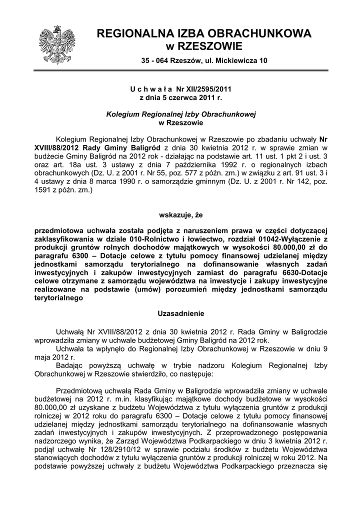 REGIONALNA IZBA OBRACHUNKOWA w RZESZOWIE ` 35 - 064 Rzeszów, ul. Mickiewicza 10 U c h w a ł a Nr XII/2595/2011 z dnia 5 czerwca 2011 r. Kolegium Regionalnej Izby Obrachunkowej w Rzeszowie Kolegium Regionalnej Izby Obrachunkowej w Rzeszowie po zbadaniu uchwały Nr XVIII/88/2012 Rady Gminy Baligród z dnia 30 kwietnia 2012 r. w sprawie zmian w budżecie Gminy Baligród na 2012 rok - działając na podstawie art. 11 ust. 1 pkt 2 i ust. 3 oraz art. 18a ust. 3 ustawy z dnia 7 października 1992 r. o regionalnych izbach obrachunkowych (Dz. U. z 2001 r. Nr 55, poz. 577 z późn. zm.) w związku z art. 91 ust. 3 i 4 ustawy z dnia 8 marca 1990 r. o samorządzie gminnym (Dz. U. z 2001 r. Nr 142, poz. 1591 z późn. zm.) wskazuje, że przedmiotowa uchwała została podjęta z naruszeniem prawa w części dotyczącej zaklasyfikowania w dziale 010-Rolnictwo i łowiectwo, rozdział 01042-Wyłączenie z produkcji gruntów rolnych dochodów majątkowych w wysokości 80.000,00 zł do paragrafu 6300 – Dotacje celowe z tytułu pomocy finansowej udzielanej między jednostkami samorządu terytorialnego na dofinansowanie własnych zadań inwestycyjnych i zakupów inwestycyjnych zamiast do paragrafu 6630-Dotacje celowe otrzymane z samorządu województwa na inwestycje i zakupy inwestycyjne realizowane na podstawie (umów) porozumień między jednostkami samorządu terytorialnego Uzasadnienie Uchwałą Nr XVIII/88/2012 z dnia 30 kwietnia 2012 r. Rada Gminy w Baligrodzie wprowadziła zmiany w uchwale budżetowej Gminy Baligród na 2012 rok. Uchwała ta wpłynęło do Regionalnej Izby Obrachunkowej w Rzeszowie w dniu 9 maja 2012 r. Badając powyższą uchwałę w trybie nadzoru Kolegium Regionalnej Izby Obrachunkowej w Rzeszowie stwierdziło, co następuje: Przedmiotową uchwałą Rada Gminy w Baligrodzie wprowadziła zmiany w uchwale budżetowej na 2012 r. m.in. klasyfikując majątkowe dochody budżetowe w wysokości 80.000,00 zł uzyskane z budżetu Województwa z tytułu wyłączenia gruntów z produkcji rolniczej w 2012 roku do paragrafu 6300 – Dotacje celowe z tytułu pomocy finansowej udzielanej między jednostkami samorządu terytorialnego na dofinansowanie własnych zadań inwestycyjnych i zakupów inwestycyjnych. Z przeprowadzonego postępowania nadzorczego wynika, że Zarząd Województwa Podkarpackiego w dniu 3 kwietnia 2012 r. podjął uchwałę Nr 128/2910/12 w sprawie podziału środków z budżetu Województwa stanowiących dochodów z tytułu wyłączenia gruntów z produkcji rolniczej w roku 2012. Na podstawie powyższej uchwały z budżetu Województwa Podkarpackiego przeznacza się środki stanowiące dochód z tytułu wyłączenia gruntów z produkcji rolniczej na dofinansowanie zadań z zakresu modernizacji-przebudowy dróg dojazdowych do gruntów rolnych. W związku z powyższym zaklasyfikowanie środków finansowych w kwocie 80.000,00 zł do paragrafu 6300 – Dotacje celowe z tytułu pomocy finansowej udzielanej między jednostkami samorządu terytorialnego na dofinansowanie własnych zadań inwestycyjnych i zakupów inwestycyjnych zamiast do paragrafu 6330 – Dotacje celowe otrzymane z samorządu województwa na inwestycje i zakupy inwestycyjne realizowane na podstawie (umów) porozumień między jednostkami samorządu terytorialnego w sposób nieistotny narusza postanowienia rozporządzenia Ministra Finansów z dnia 2 marca 2010 r. w sprawie szczegółowej klasyfikacji dochodów, wydatków, przychodów i rozchodów oraz środków pochodzących ze źródeł zagranicznych (Dz. U. Nr 38, poz. 207 z późn. zm.). W tym stanie rzeczy Kolegium Izby uchwaliło jak w sentencji. Rozstrzygnięcie niniejsze jest ostateczne.