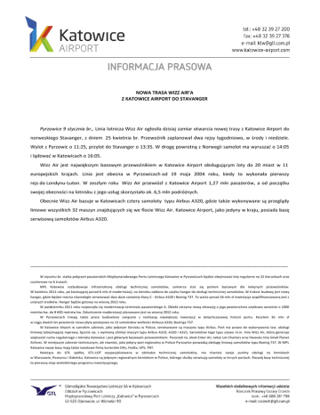 NOWA TRASA WIZZ AIR’A Z KATOWICE AIRPORT DO STAVANGER Pyrzowice 9 stycznia br., Linia lotnicza Wizz Air ogłosiła dzisiaj zamiar otwarcia nowej trasy z Katowice Airport do norweskiego Stavanger, z dniem 25 kwietnia br. Przewoźnik zaplanował dwa rejsy tygodniowo, w środy i niedziele. Wylot z Pyrzowic o 11:25, przylot do Stavanger o 13:35. W drogę powrotną z Norwegii samolot ma wyruszad o 14:05 i lądowad w Katowicach o 16:05. Wizz Air jest największym bazowym przewoźnikiem w Katowice Airport obsługującym loty do 20 miast w 11 europejskich krajach. Linia jest obecna w Pyrzowicach od 19 maja 2004 roku, kiedy to wykonała pierwszy rejs do Londynu-Luton. W zeszłym roku Wizz Air przewiózł z Katowice Airport 1,27 mln pasażerów, a od początku swojej obecności na lotnisku z jego usług skorzystało ok. 6,5 mln podróżnych. Obecnie Wizz Air bazuje w Katowicach cztery samoloty typu Airbus A320, gdzie także wykonywane są przeglądy liniowe wszystkich 32 maszyn znajdujących się we flocie Wizz Air. Katowice Airport, jako jedyny w kraju, posiada bazę serwisową samolotów Airbus A320. -----------------------------------------------------------------------------------------------------------------------------------------------------------------------------------W styczniu br. siatka połączeo pasażerskich Międzynarodowego Portu Lotniczego Katowice w Pyrzowicach będzie obejmowad loty regularne na 32 kierunkach oraz czarterowe na 6 trasach. MPL Katowice rozbudowuje infrastrukturę obsługi technicznej samolotów, zamierza stad się portem bazowym dla kolejnych przewoźników. W kwietniu 2011 roku, po kosztującej ponad 6 mln zł modernizacji, na lotnisku oddano do użytku hangar do obsługi technicznej samolotów. W trakcie budowy jest nowy hangar, gdzie będzie można równolegle serwisowad dwa duże samoloty klasy C - Airbus A320 i Boeing 737. Ta warta ponad 26 mln zł inwestycja współfinansowana jest z unijnych środków. Hangar będzie gotowy na wiosnę 2012 roku. W październiku 2011 roku rozpoczęła się modernizacja terminalu pasażerskiego A. Obiekt otrzyma nową elewację a jego powierzchnia użytkowa wzrośnie o 1000 metrów kw. do 8 600 metrów kw. Zakooczenie modernizacji planowane jest na wiosnę 2012 roku. W Pyrzowicach trwają także prace budowlane związane z realizacją największej inwestycji w dotychczasowej historii portu. Kosztem 81 mln zł w ciągu dwóch lat powstanie nowa płyta postojowa na 13 samolotów wielkości Airbusa A320, Boeinga 737. W Katowice Airport w szerokim zakresie, jako jedynym lotnisku w Polsce, serwisowane są maszyny typu Airbus. Port ma prawo do wykonywania tzw. obsługi liniowej (obejmującej naprawy, łącznie np. z wymianą silnika) maszyn typu Airbus A319, A320 i A321. Samolotów tego typu używa m.in. linia Wizz Air, która generuje większośd ruchu regularnego z lotniska Katowice i jest głównym bazowym przewoźnikiem. Pozostali to, obok Enter Air, także Lot Charters oraz litewska linia Small Planet Airlines. W mniejszym zakresie technicznym, ale również, jako jedyny port regionalny w Polsce Pyrzowice prowadzą obsługę liniową samolotów typu Boeing 737. W MPL Katowice swoje bazy mają także światowe firmy kurierskie DHL, FedEx, UPS, TNT. Należąca do GTL spółka, GTL-LOT wyspecjalizowana w obsłudze technicznej samolotów, ma również swoje punkty obsługi na lotniskach w Warszawie, Poznaniu i Gdaosku. Katowice są jedynym regionalnym lotniskiem w Polsce, którego służby serwisują samoloty w innych portach. Rozwój bazy technicznej to pierwszy etap wieloletniego programu inwestycyjnego.