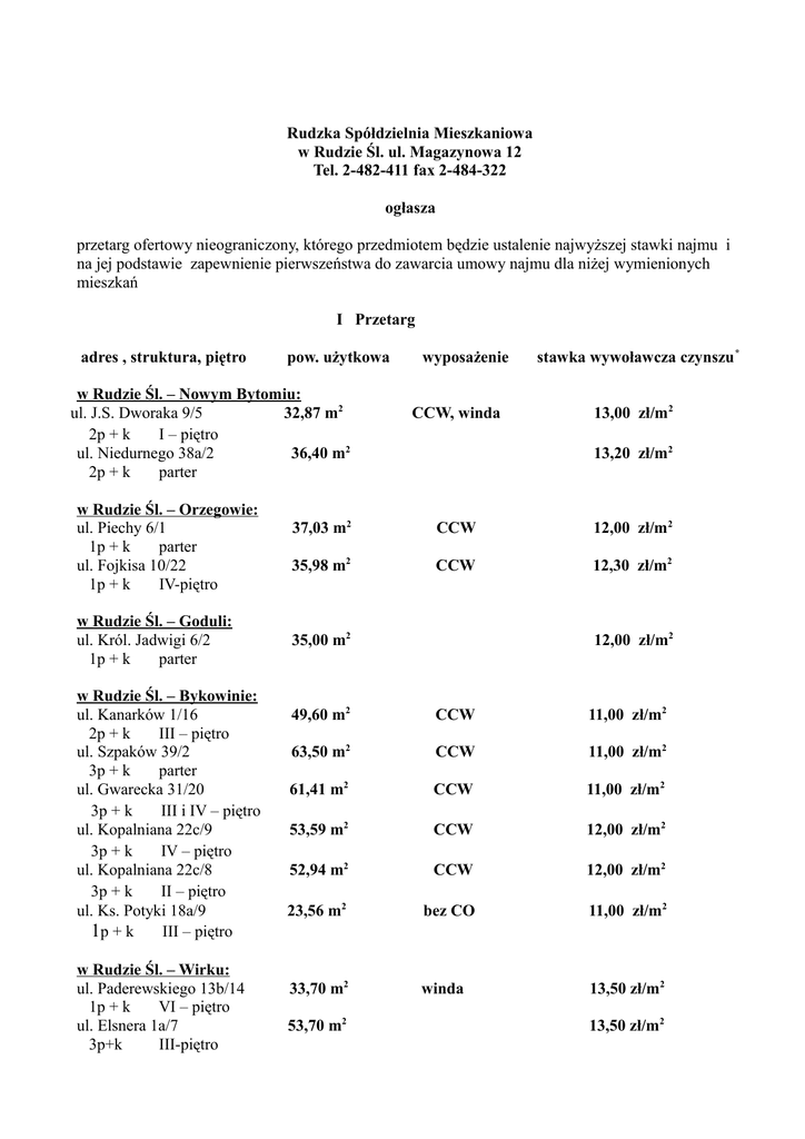 Rudzka Spółdzielnia Mieszkaniowa w Rudzie Śl. ul. Magazynowa 12 Tel. 2-482-411 fax 2-484-322 ogłasza przetarg ofertowy nieograniczony, którego przedmiotem będzie ustalenie najwyższej stawki najmu i na jej podstawie zapewnienie pierwszeństwa do zawarcia umowy najmu dla niżej wymienionych mieszkań I Przetarg adres , struktura, piętro pow. użytkowa w Rudzie Śl. – Nowym Bytomiu: ul. J.S. Dworaka 9/5 32,87 m2 2p + k I – piętro ul. Niedurnego 38a/2 36,40 m2 2p + k parter w Rudzie Śl. – Orzegowie: ul. Piechy 6/1 1p + k parter ul. Fojkisa 10/22 1p + k IV-piętro w Rudzie Śl. – Goduli: ul. Król. Jadwigi 6/2 1p + k parter w Rudzie Śl. – Bykowinie: ul. Kanarków 1/16 2p + k III – piętro ul. Szpaków 39/2 3p + k parter ul. Gwarecka 31/20 3p + k III i IV – piętro ul. Kopalniana 22c/9 3p + k IV – piętro ul. Kopalniana 22c/8 3p + k II – piętro ul. Ks. Potyki 18a/9 1p + k III – piętro w Rudzie Śl. – Wirku: ul. Paderewskiego 13b/14 1p + k VI – piętro ul. Elsnera 1a/7 3p+k III-piętro wyposażenie CCW, winda stawka wywoławcza czynszu * 13,00 zł/m2 13,20 zł/m2 37,03 m2 CCW 12,00 zł/m2 35,98 m2 CCW 12,30 zł/m2 35,00 m2 12,00 zł/m2 49,60 m2 CCW 11,00 zł/m2 63,50 m2 CCW 11,00 zł/m2 61,41 m2 CCW 11,00 zł/m2 53,59 m2 CCW 12,00 zł/m2 52,94 m2 CCW 12,00 zł/m2 23,56 m2 bez CO 11,00 zł/m2 33,70 m2 winda 13,50 zł/m2 53,70 m2 13,50 zł/m2 * oprócz czynszu najemcy są zobowiązani wnosić również opłaty niezależne tj. za energię cieplną (CO),zimną i ciepłą (CCW) wodę itp. Warunki uczestnictwa w przetargu: 1. Złożenie w Sekretariacie Rudzkiej Spółdzielni Mieszkaniowej – pokój 213 pisemnej oferty w zamkniętej kopercie z dopiskiem: „najem lokalu mieszkalnego przy ul. .................................” do dnia 04.11.2011r do godz. 13.30. Ofertę należy złożyć w odpowiedniej formie wg załączonego druku dostępnego w Registraturze Spółdzielni RSM 2. Wpłacenie wadium w wysokości 2.000,00 zł /dwatysiące PLN/ oraz 100,- zł + VAT tytułem opłaty przetargowej na każde mieszkanie, o które oferent się ubiega w kasie Spółdzielni do dnia 04.11.2011r do godz. 13.30 i dołączenie kserokopii wpłaty do oferty. Komisyjne otwarcie ofert nastąpi dnia 07.11.2011 r o godz. 11.00 przy udziale oferentów za okazaniem dowodu wpłaty wadium. Obecność nie jest obowiązkowa. Oferta winna zawierać proponowaną cenę co najmniej równą kwocie wyjściowej. O wyborze oferty zdecyduje najwyższa zaoferowana kwota na dane mieszkanie stanowiąca nadwyżkę ponad cenę wywoławczą. Remont mieszkania należy przeprowadzić we własnym zakresie i na własny koszt łącznie z ewentualną wymianą okien Wadium oferenta , którego oferta zostanie uznana za najkorzystniejszą zostanie przelane na poczet kaucji zabezpieczającej opłaty czynszowe. Przystępujący do przetargu traci wadium, jeżeli w terminie 30 dni od daty wygrania przetargu nie podpisze umowy i nie uzupełni kaucji do wysokości 6-miesięcznego czynszu wyliczonego w oparciu o zaoferowaną stawkę . W przypadku nie wygrania przetargu zwrot wadium nastąpi w terminie uzgodnionym z kasą Spółdzielni tel. 2482-411 wew. 206 nie póżniej niż 3 dni od pisemnego powiadomienia o wyniku przetargu. Oględzin mieszkań można dokonać w dniu 24.10.2011 r w godz. od 14.00 – 16.00 O wyniku przetargu oferenci zostaną powiadomieni pisemnie. Szczegółowych informacji udziela dział członkowsko-lokalowy Spółdzielni tel.2482-411 wew. 209. Spółdzielnia może odwołać przetarg bez podania przyczyn. Ruda Śląska, dnia 06.10.2011r.