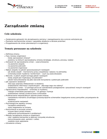 Zarządzanie zmianą Cele szkolenia ● ● ● Zwiększenie gotowości do akceptowania zamiany i zaangażowania się w proces wdrażania jej. Poznanie mechanizmów zmiany i sposobów działania w okresie przemian. Przygotowanie do zmian planowanych w organizacji. Tematy poruszane na szkoleniu ● ● Definicja zmiany. Fazy rozwoju organizacji: kiedy wprowadzać zmianę? poziomy na których wprowadzamy zmianę (strategia, struktura, procesy, ludzie) Gotowość do wprowadzania zmian – uwarunkowania: na poziomie zespołu na poziomie jednostki na poziomie organizacji Wpływ zespołu na jakość opracowywanych rozwiązań: jak działa zespół – mechanizmy pracy zespołowej i wpływu na jednostkę schematyczność myślenia i konformizm – czym są uwarunkowane Warunki, w jakich zespół wzmaga jakość rozwiązań: kiedy zespół jest mądrzejszy od jednostki? jakość komunikowania się jako warunek korzystania z potencjału jednostki Jak usprawnić działania? dwa typy poprawy efektywności w działaniu analizowanie informacji o dysfunkcjach – dlaczego tego nie robimy? katalizatory zmian – co pomaga porzucać standardowe postępowanie i poszukiwać nowych rozwiązań Ograniczenia indywidualne – schematy w myśleniu: rodzaje schematów poznawczych – ich geneza i funkcje podstawowe metody przekraczania schematów Przekraczanie indywidualnych oporów przed zmianą: nastawienia mentalne utrudniające przezwyciężanie schematów (negatywne oceny pomysłów; przywiązanie do hipotezy) przekraczanie nastawień Psychologiczne aspekty zmiany: narzędzia autoanalizy style reagowania na zmianę Komunikacja w procesie zmiany: krzywa oporu przed zmianą efektywne komunikowanie o problemach Metody zarządzania zmianą w organizacji: rola i zadania kierownika w obecnej i przyszłej strukturze; komunikowanie wizji, wartości i celów; osobiste style wpływania Utrwalanie zmiany: ❍ ❍ ● ❍ ❍ ❍ ● ❍ ❍ ● ❍ ❍ ● ❍ ❍ ❍ ● ❍ ❍ ● ❍ ❍ ● ❍ ❍ ● ❍ ❍ ● ❍ ❍ ❍ ● ❍ tworzenie procedur