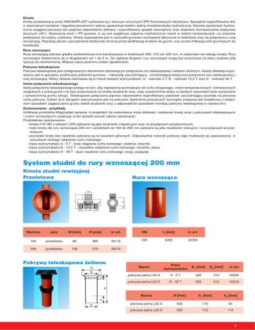 Kineta Kinety produkowane przez MAGNAPLAST wykonane są z tworzyw sztucznych (PP) formowanych wtryskowo. Specjalnie wyprofilowane dno o optymalnym kształcie i łagodnej powierzchni spływu gwarantuje bardzo dobrą charakterystykę hydrauliczną. Wysoka sprawność hydrauliczna osiągana jest poza tym poprzez odpowiednio dobrany i wyprofilowany spadek wewnętrzny oraz właściwe rozmieszczenie dopływów bocznych (45°). Wykonanie kinet z PP sprawia, iż są one wyjątkowo odporne mechanicznie nawet w niskich temperaturach, co znacznie podwyższa ich walory użytkowe. Kineta wyposażona jest w uszczelki gumowe montowane fabrycznie w kielichach oraz na połączeniu z rurą wznoszącą. Wysokiej jakości uszczelnienia doskonale chronią przed eksfiltracją ścieków do gruntu oraz przed infiltracją wód gruntowych do kanalizacji. Rura wznosząca Rurę wznoszącą stanowi gładka bezkielichowa rura kanalizacyjna w średnicach 200, 315 lub 400 mm, w zależności od rodzaju kinety. Rury wznoszące dostarczane są w długościach od 1 do 6 m. Do żądanej długości rury wznoszące mogą być przycinane na placu budowy piłą ręczną lub mechaniczną. Miejsce cięcia powinno zostać ogradowane. Pokrywa teleskopowa Pokrywa teleskopowa jest zintegrowanym elementem stanowiącym połączenie rury teleskopowej z włazem żeliwnym. Każdy teleskop wyposażony jest w specjalny, profilowany pierścień gumowy - manszetę uszczelniającą - umożliwiającą elastyczne połączenie rury teleskopowej z rurą wznoszącą. Włazy żeliwne oferowane są w trzech klasach wytrzymałości: A - nośność 5 T, B - nośność 12,5 T oraz D - nośność 40 T. Istota połączenia teleskopowego Istota połączenia teleskopowego polega na tym, aby naprężenia pochodzące od ruchu drogowego, zmian temperaturowych i klimatycznych związanych z pracą gruntu nie były przenoszone na kinetę studzienki oraz, żeby powierzchnia włazu w każdych warunkach była wyrównana z powierzchnią gruntu (drogi). Teleskopowe połączenie poprzez odpowiednio wyprofilowany pierścień uszczelniający pozwala na pionowe ruchy pokrywy. Całość tych obciążeń zatrzymywana jest na pokrywie. Spełnienie powyższych wymogów związane jest dodatkowo z właściwym sposobem zagęszczenia gruntu wokół studzienki oraz z odpowiednim sposobem montażu pokrywy teleskopowej w nawierzchni. Zastosowanie - przykłady Unifikacja produktów Magnaplast sprawia, iż projektant lub wykonawca może dobierać i zestawiać kinety wraz z pokrywami teleskopowymi i rurami wznoszącymi uzyskując w ten sposób szeroki zakres zastosowań. Przykładowe zastosowania: - kineta 315/160 z włazem L250 zalecane są jako studzienki inspekcyjne oraz na przyłączach przydomowych, - małe kinety dla rury wznoszącej 200 mm i przelotach od 160 do 200 mm zalecane są jako studzienki rewizyjne i na przyłączach przydomowych, - pozostałe kinety bez osadnika zalecane są na kanałach głównych. Odpowiednia nośność pokrywy daje możliwość jej zastosowania w warunkach różnego natężenia ruchu kołowego: - klasa wytrzymałości A - 5 T - brak natężenia ruchu kołowego: zieleńce, trawniki, - klasa wytrzymałości B - 12,5 T - niewielkie natężenie ruchu kołowego: chodniki, place, - klasa wytrzymałości D - 40 T - duże nasilenie ruchu kołowego: drogi, podjazdy. System studni do rury wznoszącej 200 mm Kineta studni rewizyjnej Przelotowa Rura wznosząca Wymiary opis M [mm] H [mm] nr art. DN L [mm] nr art. 160 przelotowa 80 360 32115 200 6000 32050 200 przelotowa 130 510 32210 Pokrywy teleskopowe żeliwne Nazwa Klasa wytrzymałości D1 [mm] D2 [mm] nr art. pokrywa pełna L63 A A-5T 330 210 32305 pokrywa pełna L63 D D - 40 T 330 210 32310 Nazwa H [mm] h1 [mm] h2 [mm] pokrywa pełna L63 A 500 170 65 pokrywa pełna L63 D 500 170 115 3 System studni do rury wznoszącej 315 mm Kineta studni rewizyjnej 3 dopływy Przelotowa całkowita wysokość studni min. max. [mm] [mm] Wymiary opis H [mm] 160 3 dopływy 560 650 200 3 dopływy 600 750 całkowita wysokość studni min. max. [mm] [mm] nr art. Wymiary opis H [mm] 1050 33110 160 przelotowa 430 550 1050 33115 1450 33210 200 przelotowa 450 650 1450 33215 nr art. Stożek betonowy z pokrywą Rury wznoszące DN L [mm] nr art. opis nr art. 315 1000 33010 stożek betonowy 33512 315 2000 33020 315 6000 33060 Manszeta Pokrywy teleskopowe żeliwne 4 opis typ pokrywa pełna L 250 pokrywa pełna pokrywa z kratką klasa wytrzymałości Nazwa nr art. 315/250 33610 H [mm] h1 [mm] h2 [mm] nr art. B - 12,5 T 450 170 90 33310 L 250 D - 40 T 450 170 110 33325 L 250 B - 12,5 T 450 170 90 33315 System studni do rury wznoszącej 400 mm Kineta studni rewizyjnej 3 dopływy Przelotowa h1 [mm] nr art. DN opis M [mm] H [mm] h1 [mm] nr art. 140 34115 160 przelotowa 120 550 120 34130 610 160 34210 200 przelotowa 90 500 170 34215 920 420 34220 250 przelotowa 170 920 420 34235 920 400 34310 315 przelotowa 240 920 400 34325 H [mm] h1 [mm] nr art. DN opis M [mm] H [mm] 160 3 dopływy 120 550 200 3 dopływy 140 250 3 dopływy 170 315 3 dopływy 240 Dopływ lewy Dopływ prawy DN opis M [mm] H [mm] 250 dopływ lewy 170 910 315 dopływ lewy 240 920 h1 [mm] nr art. DN opis M [mm] 440 34230 250 dopływ prawy 170 910 440 34225 400 34320 315 dopływ prawy 240 920 400 34315 5 Rury wznoszące Manszeta DN L [mm] nr art. Nazwa nr art. 400 1000 34010 400/315 34610 400 2000 34020 400 3000 34030 400 6000 34060 Pokrywy teleskopowe żeliwne Nazwa Klasa wytrzymałości H [mm] h1 [mm] h2 [mm] D1 [mm] D2 [mm] nr art. L300 A pełna A-5T 450 170 80 380/380 315 34405 L300 B pełna B - 12,5 T 450 170 80 380/380 315 34410 L300 B z kratką B - 12,5 T 450 170 80 380/380 315 34415 L65 D pełna D - 40 T 450 170 95 380/380 320 34425 L61 D z kratką* D - 40 T 450 170 100 380/380 320 34435 * wpust uliczny ściekowy Stożek betonowy z pokrywą 6 Uszczelki opis nr art. Nazwa nr art. stożek betonowy 34512 uszczelka in situ 110 mm 34615 uszczelka in situ 160 mm 34620 uszczelka i