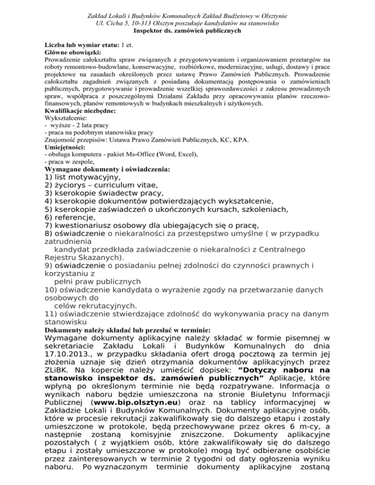Zakład Lokali i Budynków Komunalnych Zakład Budżetowy w Olsztynie Ul. Cicha 5, 10-313 Olsztyn poszukuje kandydatów na stanowisko Inspektor ds. zamówień publicznych Liczba lub wymiar etatu: 1 et. Główne obowiązki: Prowadzenie całokształtu spraw związanych z przygotowywaniem i organizowaniem przetargów na roboty remontowo-budowlane, konserwacyjne, rozbiórkowe, modernizacyjne, usługi, dostawy i prace projektowe na zasadach określonych przez ustawę Prawo Zamówień Publicznych. Prowadzenie całokształtu zagadnień związanych z posiadaną dokumentacją postępowania o zamówieniach publicznych, przygotowywanie i prowadzenie wszelkiej sprawozdawczości z zakresu prowadzonych spraw, współpraca z poszczególnymi Działami Zakładu przy opracowywaniu planów rzeczowofinansowych, planów remontowych w budynkach mieszkalnych i użytkowych. Kwalifikacje niezbędne: Wykształcenie: - wyższe - 2 lata pracy - praca na podobnym stanowisku pracy Znajomość przepisów: Ustawa Prawo Zamówień Publicznych, KC, KPA. Umiejętności: - obsługa komputera - pakiet Ms-Office (Word, Excel), - praca w zespole, Wymagane dokumenty i oświadczenia: 1) list motywacyjny, 2) życiorys – curriculum vitae, 3) kserokopie świadectw pracy, 4) kserokopie dokumentów potwierdzających wykształcenie, 5) kserokopie zaświadczeń o ukończonych kursach, szkoleniach, 6) referencje, 7) kwestionariusz osobowy dla ubiegających się o pracę, 8) oświadczenie o niekaralności za przestępstwo umyślne ( w przypadku zatrudnienia kandydat przedkłada zaświadczenie o niekaralności z Centralnego Rejestru Skazanych). 9) oświadczenie o posiadaniu pełnej zdolności do czynności prawnych i korzystaniu z pełni praw publicznych 10) oświadczenie kandydata o wyrażenie zgody na przetwarzanie danych osobowych do celów rekrutacyjnych. 11) oświadczenie stwierdzające zdolność do wykonywania pracy na danym stanowisku Dokumenty należy składać lub przesłać w terminie: Wymagane dokumenty aplikacyjne należy składać w formie pisemnej w sekretariacie Zakładu Lokali i Budynków Komunalnych do dnia 17.10.2013., w przypadku składania ofert drogą pocztową za termin jej złożenia uznaje się dzień otrzymania dokumentów aplikacyjnych przez ZLiBK. Na kopercie należy umieścić dopisek: ”Dotyczy naboru na stanowisko inspektor ds. zamówień publicznych” Aplikacje, które wpłyną po określonym terminie nie będą rozpatrywane. Informacja o wynikach naboru będzie umieszczona na stronie Biuletynu Informacji Publicznej (www.bip.olsztyn.eu) oraz na tablicy informacyjnej w Zakładzie Lokali i Budynków Komunalnych. Dokumenty aplikacyjne osób, które w procesie rekrutacji zakwalifikowały się do dalszego etapu i zostały umieszczone w protokole, będą przechowywane przez okres 6 m-cy, a następnie zostaną komisyjnie zniszczone. Dokumenty aplikacyjne pozostałych ( z wyjątkiem osób, które zakwalifikowały się do dalszego etapu i zostały umieszczone w protokole) mogą być odbierane osobiście przez zainteresowanych w terminie 2 tygodni od daty ogłoszenia wyniku naboru. Po wyznaczonym terminie dokumenty aplikacyjne zostaną komisyjnie zniszczone. Inne informacje: Kandydaci zakwalifikowani zostaną zaproszeni na rozmowę wstępną. Dodatkowe informacje: 533-36-26 wew. 27 Olsztyn, 04.10.2013r. Dyrektor Zbigniew Karpowicz