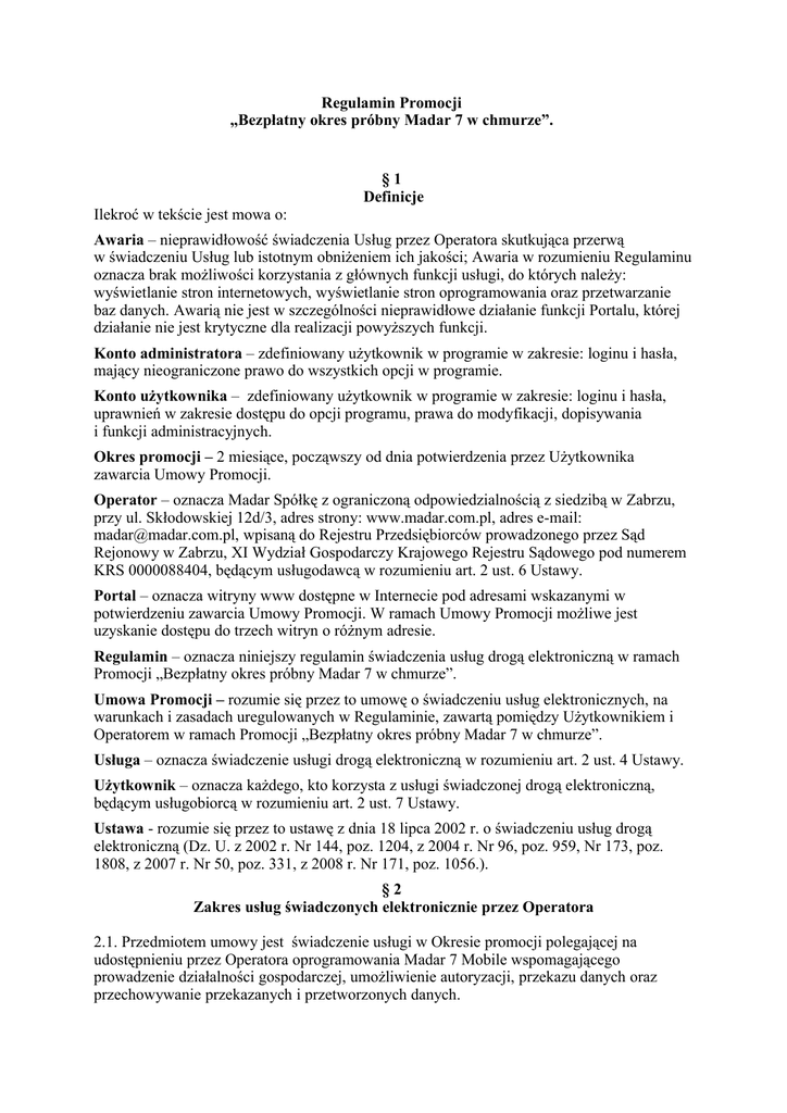 Regulamin Promocji „Bezpłatny okres próbny Madar 7 w chmurze”. §1 Definicje Ilekroć w tekście jest mowa o: Awaria – nieprawidłowość świadczenia Usług przez Operatora skutkująca przerwą w świadczeniu Usług lub istotnym obniżeniem ich jakości; Awaria w rozumieniu Regulaminu oznacza brak możliwości korzystania z głównych funkcji usługi, do których należy: wyświetlanie stron internetowych, wyświetlanie stron oprogramowania oraz przetwarzanie baz danych. Awarią nie jest w szczególności nieprawidłowe działanie funkcji Portalu, której działanie nie jest krytyczne dla realizacji powyższych funkcji. Konto administratora – zdefiniowany użytkownik w programie w zakresie: loginu i hasła, mający nieograniczone prawo do wszystkich opcji w programie. Konto użytkownika – zdefiniowany użytkownik w programie w zakresie: loginu i hasła, uprawnień w zakresie dostępu do opcji programu, prawa do modyfikacji, dopisywania i funkcji administracyjnych. Okres promocji – 2 miesiące, począwszy od dnia potwierdzenia przez Użytkownika zawarcia Umowy Promocji. Operator – oznacza Madar Spółkę z ograniczoną odpowiedzialnością z siedzibą w Zabrzu, przy ul. Skłodowskiej 12d/3, adres strony: www.madar.com.pl, adres e-mail: [email protected], wpisaną do Rejestru Przedsiębiorców prowadzonego przez Sąd Rejonowy w Zabrzu, XI Wydział Gospodarczy Krajowego Rejestru Sądowego pod numerem KRS 0000088404, będącym usługodawcą w rozumieniu art. 2 ust. 6 Ustawy. Portal – oznacza witryny www dostępne w Internecie pod adresami wskazanymi w potwierdzeniu zawarcia Umowy Promocji. W ramach Umowy Promocji możliwe jest uzyskanie dostępu do trzech witryn o różnym adresie. Regulamin – oznacza niniejszy regulamin świadczenia usług drogą elektroniczną w ramach Promocji „Bezpłatny okres próbny Madar 7 w chmurze”. Umowa Promocji – rozumie się przez to umowę o świadczeniu usług elektronicznych, na warunkach i zasadach uregulowanych w Regulaminie, zawartą pomiędzy Użytkownikiem i Operatorem w ramach Promocji „Bezpłatny okres próbny Madar 7 w chmurze”. Usługa – oznacza świadczenie usługi drogą elektroniczną w rozumieniu art. 2 ust. 4 Ustawy. Użytkownik – oznacza każdego, kto korzysta z usługi świadczonej drogą elektroniczną, będącym usługobiorcą w rozumieniu art. 2 ust. 7 Ustawy. Ustawa - rozumie się przez to ustawę z dnia 18 lipca 2002 r. o świadczeniu usług drogą elektroniczną (Dz. U. z 2002 r. Nr 144, poz. 1204, z 2004 r. Nr 96, poz. 959, Nr 173, poz. 1808, z 2007 r. Nr 50, poz. 331, z 2008 r. Nr 171, poz. 1056.). §2 Zakres usług świadczonych elektronicznie przez Operatora 2.1. Przedmiotem umowy jest świadczenie usługi w Okresie promocji polegającej na udostępnieniu przez Operatora oprogramowania Madar 7 Mobile wspomagającego prowadzenie działalności gospodarczej, umożliwienie autoryzacji, przekazu danych oraz przechowywanie przekazanych i przetworzonych danych. 2.2. Autoryzacja polega na potwierdzeniu, na podstawie wprowadzonego loginu i hasła, czy Użytkownik jest uprawniony do zalogowania w programie, a także do korzystania z żądanej opcji i funkcji w programie. 2.3. Na dane Konto użytkownika lub administratora może być zalogowany jednocześnie tylko jeden Użytkownik. §3 Odpłatność za wykonane usługi elektroniczne 3.1. W Okresie promocji nie jest pobierana opłata za Konta użytkownika oraz Konto administratora. §4 Warunki rozwiązania umowy 4. 1. Umowę niniejszą zawarto na Okres promocji. 4.2. Operator zastrzega sobie prawo do rozwiązania Umowy w trybie natychmiastowym, jeżeli Użytkownik: 4.2.1. Swoimi działaniami narusza bezpieczeństwo danych znajdujących się w Portalu lub podejmuje nieuprawnioną próbę dostępu do Portalu. 4.2.2. Dokonuje czynności niezgodnych z prawem. 4.2.3. Działa na szkodę operatora lub innych Użytkowników Portalu. 4.2.4.Wykorzystuje portal do rozpowszechniania treści obraźliwych i pornograficznych. 4.3. Rozwiązanie umowy jest równoznaczne z usunięciem konta w Portalu oraz skasowaniem danych Użytkownika. §5 Wymagania techniczne niezbędne do współpracy z systemem teleinformatycznym 5.1. Operator świadczy usługi poprzez Portal za pomocą sieci Internet. 5.2. Użytkownik zgadzając się na warunki Umowy akceptuje przechowywanie plików typu „cookies” na swoim komputerze. 5.3. Użytkownik w celu skorzystania z Usług musi posiadać na swoim komputerze poprawnie skonfigurowaną przeglądarkę internetową. Operator zaleca Użytkownikowi korzystanie z przeglądarek: Internet Explorer 8.0, Mozilla Firefox 4.0, Google Chrome - lub nowszych. 5.4. Do skorzystania z niektórych usług może być konieczne zainstalowanie programu czytającego pliki pdf oraz włączenie obsługę języka Javascript. §6 Zagrożenie lub naruszenia praw 6.1. Użytkownik zobowiązuje się do nie działania na szkodę Operatora. 6.2 Zabrania się dostarczania przez Użytkownika danych i treści o charakterze bezprawnym. 6.3. W przypadku gdy Użytkownik uzna, iż dane naruszają jego prawa, dobra osobiste, dobre obyczaje, uczucia, moralność, przekonania, zasady uczciwej konkurencji, know-how, tajemnice chronione prawem lub na podstawie zobowiązania, albo przekazywane są treści obraźliwe lub pornograficzne, powinien powiadomić Operatora o potencjalnym naruszeniu. §7 Odpowiedzialność Operatora, gwarancja jakości usług (SLA) 7.1. Operator podejmuje wszelkie starania, aby zapewnić prawidłowe funkcjonowanie Portalu pod względem technicznym. 7.2. Udostępniane przez Operatora w ramach Portalu aplikacje służą jedynie ułatwieniu prowadzenia działalności gospodarczej, w tym dokonywania rozliczeń podatkoworachunkowych, natomiast nie przejmują za nie odpowiedzialności. Odpowiedzialność, w szczególności wobec kontrahentów i organów państwowych, w tym organów podatkowych oraz ZUS ponosi Użytkownik jako przedsiębiorca. 7.3. Operator nie ponosi odpow