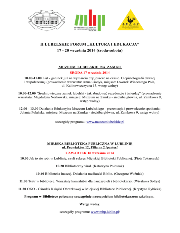 II LUBELSKIE FORUM „KULTURA I EDUKACJA” 17 - 20 września 2014 (środa-sobota) MUZEUM LUBELSKIE NA ZAMKU ŚRODA 17 września 2014 10.00-11.00 List - gatunek już na wymarciu czy jeszcze na czasie. O epistolografii dawnej i współczesnej (prowadzenie warsztatu: Anna Ciodyk, miejsce: Dworek Wincentego Pola, ul. Kalinowszczyzna 13, wstęp wolny) 10.00-12.00 "Średniowieczny zamek lubelski - jak zbudować rezydencję i twierdzę" (prowadzenie warsztatu: Magdalena Norkowska, miejsce: Muzeum na Zamku - siedziba główna, ul. Zamkowa 9, wstęp wolny) 12.00 - 13.00 Działania Edukacyjne Muzeum Lubelskiego - prezentacja i prowadzenie spotkania: Jolanta Polańska, miejsce: Muzeum na Zamku - siedziba główna, ul. Zamkowa 9, wstęp wolny) szczegóły programu: www.muzeumlubelskie.pl MIEJSKA BIBLIOTEKA PUBLICZNA W LUBLINIE ul. Peowiaków 12, Filia nr 2 /parter/ CZWARTEK 18 września 2014 10.00 Jak to się robi w Lublinie, czyli sukces Miejskiej Biblioteki Publicznej. (Piotr Tokarczuk) 10.20 Biblioteczny viral. (Katarzyna Poleszak) 10.40 Biblioteka inaczej. Działania mediateki Biblio. (Grzegorz Woźniak) 11.00 Teatr w bibliotece. Warsztaty kamishibai dla nauczycieli i bibliotekarzy. (Wiesława Sołtys) 11.20 OKO - Ośrodek Książki Obrazkowej w Miejskiej Bibliotece Publicznej. (Krystyna Rybicka) Program w Bibliotece polecamy szczególnie nauczycielom bibliotekarzom szkolnym. Wstęp wolny. szczegóły programu: www.mbp.lublin.pl/ TEATR ANDERSENA W LUBLINIE ul. Dominikańska 1 ŚRODA 17 września 2014 16.00-19.00 "Nakręć się na teatr" - reżyseria teatrów dziecięcych i młodzieżowych (prowadzenie warsztatów: Bogusław Byrski, koszt: 30zł) CZWARTEK 18 września 2014 16.00 -19.00 Metody dramowe w teatrze szkolnym (prowadzenie warsztatów: Magdalena Zylik, koszt: 30zł) PIĄTEK 19 września 2104 14.00 - 17.00 "Zły pan - ważne tematy w teatrze szkolnym" (prowadzenie warsztatów: Paulina Chreścionko, Małgorzata Adamczyk, koszt: 30zł) 17.00 "Zły pan" - premiera pedagogiczna spektaklu i spotkanie z twórcami. SOBOTA 20 września 2014 9.00 -14.00 Instruktorskie warsztaty teatralne (prowadzenie: Simone Thiis - Norwegia, koszt: 40zł) 9.00 - 14.00 "Tak, zróbmy to!" - instruktorskie warsztaty teatralne (prowadzenie: Monika Dąbrowska, koszt: 40zł) 17.00 "Zły pan - premiera prasowa szczegóły programu: www.teatrandersena.pl Wszystkie organizowane warsztaty i spotkania skierowane są do osób dorosłych (m.in nauczycieli, bibliotekarzy, studentów, animatorów kultury, instruktorów teatralnych). ZAPRASZAMY