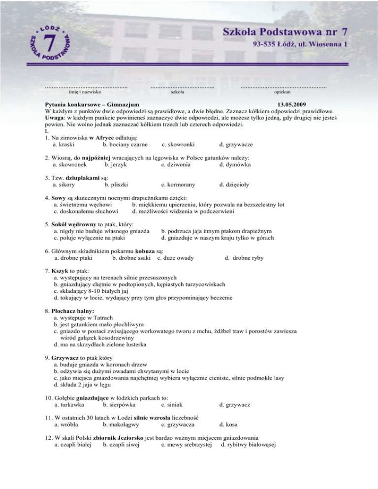 …………………………………………. imię i nazwisko ……………………………….. szkoła …………………………………………… opiekun Pytania konkursowe – Gimnazjum 13.05.2009 W kaŜdym z punktów dwie odpowiedzi są prawidłowe, a dwie błędne. Zaznacz kółkiem odpowiedzi prawidłowe. Uwaga: w kaŜdym punkcie powinieneś zaznaczyć dwie odpowiedzi, ale moŜesz tylko jedną, gdy drugiej nie jesteś pewien. Nie wolno jednak zaznaczać kółkiem trzech lub czterech odpowiedzi. I. 1. Na zimowiska w Afryce odlatują: a. kraski b. bociany czarne c. skowronki d. grzywacze 2. Wiosną, do najpóźniej wracających na lęgowiska w Polsce gatunków naleŜy: a. skowronek b. jerzyk c. dziwonia d. dymówka 3. Tzw. dziuplakami są: a. sikory b. pliszki c. kormorany d. dzięcioły 4. Sowy są skutecznymi nocnymi drapieŜnikami dzięki: a. świetnemu węchowi b. miękkiemu upierzeniu, który pozwala na bezszelestny lot c. doskonałemu słuchowi d. moŜliwości widzenia w podczerwieni 5. Sokół wędrowny to ptak, który: a. nigdy nie buduje własnego gniazda c. poluje wyłącznie na ptaki b. podrzuca jaja innym ptakom drapieŜnym d. gniazduje w naszym kraju tylko w górach 6. Głównym składnikiem pokarmu kobuza są: a. drobne ptaki b. drobne ssaki c. duŜe owady d. drobne ryby 7. Kszyk to ptak: a. występujący na terenach silnie przesuszonych b. gniazdujący chętnie w podtopionych, kępiastych turzycowiskach c. składający 8-10 białych jaj d. tokujący w locie, wydający przy tym głos przypominający beczenie 8. Płochacz halny: a. występuje w Tatrach b. jest gatunkiem mało płochliwym c. gniazdo w postaci zwisającego workowatego tworu z mchu, źdźbeł traw i porostów zawiesza wśród gałązek kosodrzewiny d. ma na skrzydłach zielone lusterka 9. Grzywacz to ptak który a. buduje gniazda w koronach drzew b. odŜywia się duŜymi owadami chwytanymi w locie c. jako miejsca gniazdowania najchętniej wybiera wyłącznie cieniste, silnie podmokłe lasy d. składa 2 jaja w lęgu 10. Gołębie gniazdujące w łódzkich parkach to: a. turkawka b. sierpówka c. siniak d. grzywacz 11. W ostatnich 30 latach w Łodzi silnie wzrosła liczebność a. wróbla b. makolągwy c. grzywacza d. kosa 12. W skali Polski zbiornik Jeziorsko jest bardzo waŜnym miejscem gniazdowania a. czapli białej b. czapli siwej c. mewy srebrzystej d. rybitwy białowąsej 13. Do najrzadszych lęgowych w Polsce (poniŜej 100 par) gatunków szponiastych (drapieŜnych) naleŜą: a. bielik b. rybołów c. krótkoszpon d. kobuz 14. Zagniazdownikami są: a. czernica b. kuropatwa c. wróbel d. jastrząb 15. Jaja o białej barwie skorupy składają: a. sowy b. gołębie c. krukowate d. kaczki 16. By skutecznie chronić ptaki typowe dla krajobrazu rolniczego naleŜy: a. powszechnie stosować oszczędzające paliwo maszyny rolnicze b. dbać o zróŜnicowanie siedliskowe terenów rolniczych c. rozwijać sieć dróg ułatwiających przemieszczanie się ludzi i maszyn d. minimalizować ilość stosowanych chemicznych środków ochrony roślin 17.Wśród zagroŜonych w skali światowej a gniazdujących w Polsce gatunków są: a. derkacz b. bielik c. ostrygojad d. Ŝołna 18. Dwa najliczniej w Polsce gniazdujące gatunki rybitw to: a. rybitwa rzeczna b. rybitwa czubata c. rybitwa czarna d. rybitwa białoczelna 19. Do tej samej rodziny naleŜą: a. łabędź niemy i krzyŜówka b. jerzyk i brzegówka c. jastrząb i sokół wędrowny d. słowik szary i kos 20. Wśród ptaków wróblowych do najczęstszych róŜnic między płciami naleŜy: a. odmienne ubarwienie upierzenia b. zróŜnicowanie kształtu dzioba c. odmienne ubarwienie tęczówki d. zwyczaj oznakowywania terytorium śpiewem II. Głosy ptaków: 1. 2. 3. 4. 5. …………………………………………………….. …………………………………………………….. …………………………………………………….. …………………………………………………….. …………………………………………………….. III. Co to za ptak? 1. 2. 3. 4. 5. 6. 7. 8. 9. 10. ………………………………………………….... ………………………………………………….... …………………………………………………… …………………………………………………… …………………………………………………… …………………………………………………… …………………………………………………… …………………………………………………… …………………………………………………… …………………………………………………… Klucz odpowiedzi VII Konkurs Wiedzy o Ptakach GIMNAZJUM 1. a 2. b 3. a 4. b 5. a 6. a 7. b 8. a 9. a 10. b b c d c c c d b d d II. Głosy ptaków 1. 2. 3. 4. 5. Pierwiosnek Czajka Kszyk PiegŜa Jerzyk III. Co to za ptak? 1. 2. 3. 4. 5. 6. 7. 8. 9. 10. PodróŜniczek Sroka Czapla siwa Dzięcioł duŜy Mandarynka Zausznik Czajka Muchołówka szara Myszołów zwyczajny Wróbel domowy 11. 12. 13. 14. 15. 16. 17. 18. 19. 20. c a b a a b a a a a d d c b b d b c d d
