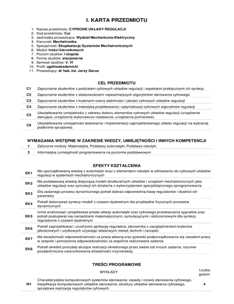 I. KARTA PRZEDMIOTU 1. 2. 3. 4. 5. 6. 7. 8. 9. 10. 11. Nazwa przedmiotu: CYFROWE UKŁADY REGULACJI Kod przedmiotu: Cur Jednostka prowadząca: Wydział Mechaniczno-Elektryczny Kierunek: Mechatronika Specjalność: Eksploatacja Systemów Mechatronicznych Moduł: treści kierunkowych Poziom studiów: I stopnia Forma studiów: stacjonarne Semestr studiów: V, VI Profil: ogólnoakademicki Prowadzący: dr hab. inż. Jerzy Garus CEL PRZEDMIOTU C1 Zapoznanie studentów z podziałem cyfrowych układów regulacji i aspektami praktycznymi ich syntezy. C2 Zapoznanie studentów z właściwościami najważniejszych algorytmówi sterowania cyfrowego C3 Zapoznanie studentów z kryteriami oceny stabilności i jakości cyfrowych układów regulacji C4 Zapoznanie studentów z metodyką projektowania i optymalizacji cyfrowych algorytmów regulacji C5 Ukształtowanie umiejetności z zakresu doboru elementów cyfrowych układów regulacji (urządzenie sterujące, urządzenia wykonawczo-nastawcze, urządzenia pomiarowe) C6 Ukształtowanie umiejętności testowania i implementacji zaprojektowanego układu regulacji na wybranej platformie sprzętowej WYMAGANIA WSTĘPNE W ZAKRESIE WIEDZY, UMIEJĘTNOŚCI I INNYCH KOMPETENCJI 1 Zaliczone moduły: Matematyka, Podstawy automatyki, Podstawy robotyki 2 Informatyka (umiejętność programowania na poziomie podstawowym EFEKTY KSZTAŁCENIA EK1 Ma uporządkowaną wiedzę z automatyki wraz z elementami robotyki w odniesieniu do cyfrowych układów regulacji w systemach mechatronicznych EK2 Ma podstawową wiedzę dotyczącą modeli strukturalnych układów i urządzeń mechatronicznych jako układów regulacji oraz symulacji ich działania z wykorzystaniem specjalistycznego oprogramowania EK3 Dla zadanego procesu dynamicznego potrafi dobrać odpowiednią klasę regulatorów i dostroić ich parametry EK4 Potrafi dokonywać syntezy modeli z czasem dyskretnym dla przykładów fizycznych procesów dynamicznych EK5 Umie analizować i projektować proste układy automatyki oraz cyfrowego przetwarzania sygnałów oraz potrafi posługiwać się narzędziami matematycznymi, symulacyjnymi i obliczeniowymi dla syntezy regulatorow z czasem dyskretnym EK6 Potrafi zaprojektować i uruchomić aplikację regulatora, sterownika z uwzględnieniem kryteriów jakościowych i użytkowych używając właściwych metod, technik i narzędzi EK7 Ma świadomość odpowiedzialności za pracę własną oraz gotowść podporządkowania się zasadom pracy w zespole i ponoszenia odpowiedzialności za wspólnie realizowane zadania EK8 Potrafi określić priorytety służące realizacji określonego przez siebie lub innych zadania, rozumie pozatechniczne uwarunkowania działalności inżynierskiej, TREŚCI PROGRAMOWE WYKŁADY W1 Charakterystyka komputerowych systemów sterowania: zasady i rozwój sterowania cyfrowego, klasyfikacja komputerowych układów sterowania, struktury układów sterowania cyfrowego, sprzętowa realizacja regulatorów cyfrowych. Liczba godzin 4 W2 Modele z czasem dyskretnym dla procesów i regulatorów. Próbkowanie i odtwarzanie sygnału, dyskretne modele liniowe i ich komponenty, metody dyskretyzacji równań stanu oparte o przekształcenie Z i aproksymację. Dobór i optymalizacja okresu próbkowania. Stabilność, sterowalność modeli liniowych z czasem dyskretnym. 4 W3 Cyfrowa realizacja algorytmów sterowania: Projektowanie dyskretne. Regulatory liniowe: uogólniony regulator liniowy, cyfrowe algorytmy PID, regulatory o skończonym czasie regulacji. Kryteria jakości. Dobór parametrów regulatorów liniowych: optymalizacja parametryczna regulatora PID, projektowanie cyfrowego regulatora od stanu, cyfrowe regulatory optymalne. 6 W4 Model ARMA i jego zastosowanie, dyskretne modele nieliniowe, modele procesów z opóźnieniem. 4 W5 Regulatory nieliniowe: efekty nasycenia. Linearyzujące sprzężenie zwrotne. Komputerowa realizacja układów sterowania cyfrowego: czas rzeczywisty w systemach sterowania cyfrowego. 4 W6 Metody opisu modeli liniowych z czasem dyskretnym: transmitancja, równania stanu, równania różnicowe. Przekształcanie pomiędzy poszczególnymi postaciami modeli dyskretnych. Przekształcenie Z. 4 W7 Problemy sterowania rozproszonego: struktury i modele matematyczne rozproszonych układów sterowania, podstawowe właściwości i parametry sieci komputerowych. 4 Razem 30 ĆWICZENIA Ć1 Wyznaczenie postaci obliczeniowych modeli regulatorów układu zamkniętego w oparciu o metody dyskretyzacji. Dobór okresu próbkowania dla układu regulacji. 2 Ć2 Metody opisu modeli liniowych z czasem dyskretnym: transmitancja, równania stanu, równania różnicowe. Przekształcanie pomiędzy poszczególnymi postaciami modeli dyskretnych. Przekształcenie Z. 2 Ć3 Wyznaczanie dyskretnych realizacji regulatorów PID i LQ. 2 Ć4 Obliczanie regulatora uogólnionego SISO. 2 Ć5 Modele dla procesow nieliniowych. 2 Razem 10 ZAJĘCIA LABORATORYJNE L1 Badanie odpowiedzi modeli z czasem dyskretnych na wymuszenia. Wpływ doboru okresu próbkowania na te odpowiedzi. Analiza pliku obliczeniowego w Matlab. 4 L2 Stabilność modeli z czasem dyskretnym. Sterowalność – obserwowalność. Wpływ okresu próbkowania. 6 L3 Dobór parametrów i analiza własności układów z regulatorami cyfrowymi. Implementacja regulatora w środowisku Matlab. 6 L4 Optymalizacja parametrów regulatorów. 4 Razem NARZĘDZIA DYDAKTYCZNE 1 Notebook z projektorem 2 Tablica i kolorowe pisaki 3 Stanowiska komputerowe z oprogramowaniem dydaktycznym 4 Stanowiska dydaktyczne laboratorium automatyki SPOSOBY OCENY 20 FORMUJĄCA F1 Sprawdzian F2 Odpowiedź ustna F3 Wykonanie zadanie obliczeniowego F4 Wykonanie ćwiczenia praktycznego P1 Kolokwium nr 1 P2 Kolokwium nr 2 PODSUMOWUJĄCA OBCIĄŻENIE PRACĄ STUDENTA Forma aktywności Średnia liczba godzin na zrealizowanie aktywności semestr V VI razem SUMA GODZIN W SEMESTRZE 0 0 0 PUNKTY ECTS W SEMESTRZE 2 2 4 LITERATURA 1 PODSTAWOWA Brzózka J., Regulatory cyfrowe w aut
