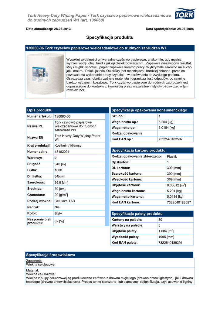 Tork Heavy-Duty Wiping Paper / Tork czyściwo papierowe wielozadaniowe do trudnych zabrudzeń W1 (art. 130060) Data sporządzenia: 24.06.2008 Data aktualizacji: 28.06.2013 Specyfikacja produktu 130060-06 Tork czyściwo papierowe wielozadaniowe do trudnych zabrudzeń W1 Wysokiej wydajności uniwersalne czyściwo papierowe, znakomite, gdy musisz wytrzeć wodę, olej i brud z jakiejkolwiek powierzchni. Zapewnia niezawodny rezultat. Miły i miękki w dotyku papier zapewnia komfort pracy. Wytrzymałe zarówno na sucho jak i mokro. Dzięki jakości QuickDry jest mocniejsze i bardziej chłonne, przez co pozawala na wykonanie pracy szybciej – w porównaniu do zwykłego papieru. Oszczędza czas, obniża zużycie materiału i ogranicza ilość odpadów, co czyni je bardzo wydajnym kosztowo. Tork czyściwo papierowe do trudnych zabrudzeń jest dopuszczone do kontaktu z żywnością przez niezależne instytuty badawcze, w tym również PZH. Opis produktu Specyfikacja opakowania konsumenckiego Numer artykułu 130060-06 Szt./op.: 1 Waga brutto op.: 5.204 [kg] Waga netto op.: 5.0184 [kg] Nazwa PL Tork czyściwo papierowe wielozadaniowe do trudnych zabrudzeń W1 Nazwa EN Trok Heavy-Duty Wiping Paper W1 Kraj produkcji Kostheim/ Niemcy Numer celny 48182091 Specyfikacja kartonu produktu Warstwy: 2 Rodzaj opakowania zbiorczego: Plastik Długość: 340 [m] Op./karton: 1 Listki: 1000 Dł. kartonu: 390 [mm] Dł. listka: 34[cm] Szerokość kartonu: 390 [mm] Szerokość: Wysokość kartonu: 369 [mm] 36.9 [cm] Średnica: Objętość kartonu: 0.05612 [m ] 39 [cm] Waga brutto kartonu: 5.204 [kg] Gramatura: 20 [g/m ] Waga netto kartonu: 5.0184 [kg] Kod EAN kartonu: 7322540183597 Rodzaj opakowania: Kod EAN op.: 7322540183597 3 2 Rodzaj włókna: Celuloza TAD Nadruk: Nie Kolor: Biały Nasycenie bieli 82 [%] produktu: Specyfikacja palety produktu Kartony na palecie: 30 Warstwy na palecie: 5 Objętość palety: 1.684 [m ] Wysokość palety: 1995 [mm] Kod EAN palety: 7322540189391 3 Specyfikacja środowiskowa Zawartość: Włókna celulozowe Materiał: Włókna celulozowe Włókna z pulpy celulozowej są produkowane zarówno z drewna miękkiego (drewno drzew iglastych), jak i drewna twardego (drewno drzew liściastych). Proces ten to siarczano- lub siarczyno- delignifikacja, czyli usuwanie ligniny Tork Heavy-Duty Wiping Paper / Tork czyściwo papierowe wielozadaniowe do trudnych zabrudzeń W1 (art. 130060) Data aktualizacji: 28.06.2013 Data sporządzenia: 24.06.2008 i żywicy z materiału celulozowego. Wybielanie włókien Wybielanie to proces oczyszczający włókna, który ma na celu otrzymanie jaśniejszej pulpy, a także osiągnięcie określonej czystości włókien, aby spełnić wymogi dot. produktów higienicznych oraz, w niektórych przypadkach, wymagania związane z bezpieczeństwem żywności. Istnieją różne metody stosowane obecnie do wybielania pulpy: ECF (Elementary Chlorine Free), w której stosowany jest dwutlenek chloru oraz TCF (Totally Chlorine Free), w której stosowany jest ozon, tlen i nadtlenek wodoru. Dodatki chemiczne Substancje chemiczne używane w procesie produkcji, tak jak I dodatki funkcyjne, zostały ocenione z punktu widzenia ekologicznego, bezpieczeństwa i higieny pracy oraz bezpieczeństwa produktu. Stosowanymi dodatkami funkcyjnymi są: - środki nadające wytrzymałości w stanie mokrym - środki nadające wytrzymałości w stanie suchym - barwniki - środki utrwalające - rozjaśniacz optyczny - klej - środki zmiękczające Dodatkami operacyjnymi są: - środki stabilizacyjne - środki ochronne - powłoka cylindra - środki przeciwpieniące - środki dyspergujące (rozpraszające) - środki powierzchniowo czynne - kontrola PH - środki retencyjne - środki odwadniające Bezpieczeństwo produktu: Ten produkt spełnia wymagania prawne dotyczące bezpieczeństwa żywności. Opakowanie: Stężenie metali ciężkich (Cd, Pb, Hg, Cr6) łącznie < 100 ppm Produkcja: Ten produkt został wyprodukowany przez fabrykę w Kostheim w Niemczech, zgodnie z normami ISO 14001 i EMAS. Utylizacja: Produkt ten jest stosowany głównie przy procesach produkcyjnych, w związku z czym po użyciu może być zanieczyszczony różnymi substancjami. Rodzaj tych substancji określa jak zużyty produkt powinien być utylizowany. Przed poddaniem utylizacji sugerujemy sprawdzić lokalne przepisy dotyczące tej kwestii. Opakowanie może być przeznaczone do odzysku (materiału lub energii). Dodatkowe informacje o produkcie można uzyskać pod adresem: SCA Hygiene Sp. z o.o. ul. Puławska 435a 02-801 Warszawa Tel. (22) 543-75-00 Fax. (22) 543-75-01