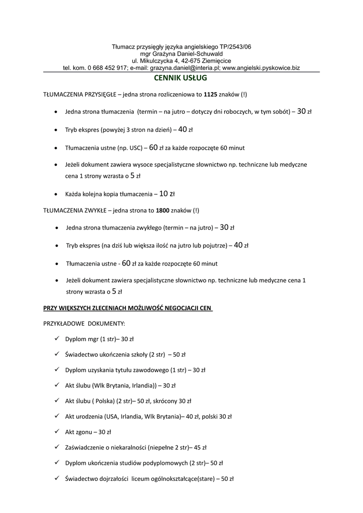 Tłumacz przysięgły języka angielskiego TP/2543/06 mgr Grażyna Daniel-Schuwald ul. Mikulczycka 4, 42-675 Ziemięcice tel. kom. 0 668 452 917; e-mail: [email protected]; www.angielski.pyskowice.biz CENNIK USŁUG TŁUMACZENIA PRZYSIĘGŁE – jedna strona rozliczeniowa to 1125 znaków (!) Jedna strona tłumaczenia (termin – na jutro – dotyczy dni roboczych, w tym sobót) – 30 zł Tryb ekspres (powyżej 3 stron na dzień) – 40 zł Tłumaczenia ustne (np. USC) – 60 zł za każde rozpoczęte 60 minut Jeżeli dokument zawiera wysoce specjalistyczne słownictwo np. techniczne lub medyczne cena 1 strony wzrasta o 5 zł Każda kolejna kopia tłumaczenia – 10 zł TŁUMACZENIA ZWYKŁE – jedna strona to 1800 znaków (!) Jedna strona tłumaczenia zwykłego (termin – na jutro) – 30 zł Tryb ekspres (na dziś lub większa ilość na jutro lub pojutrze) – 40 zł Tłumaczenia ustne - 60 zł za każde rozpoczęte 60 minut Jeżeli dokument zawiera specjalistyczne słownictwo np. techniczne lub medyczne cena 1 strony wzrasta o 5 zł PRZY WIĘKSZYCH ZLECENIACH MOŻLIWOŚĆ NEGOCJACJI CEN PRZYKŁADOWE DOKUMENTY: Dyplom mgr (1 str)– 30 zł Świadectwo ukończenia szkoły (2 str) – 50 zł Dyplom uzyskania tytułu zawodowego (1 str) – 30 zł Akt ślubu (Wlk Brytania, Irlandia)) – 30 zł Akt ślubu ( Polska) (2 str)– 50 zł, skrócony 30 zł Akt urodzenia (USA, Irlandia, Wlk Brytania)– 40 zł, polski 30 zł Akt zgonu – 30 zł Zaświadczenie o niekaralności (niepełne 2 str)– 45 zł Dyplom ukończenia studiów podyplomowych (2 str)– 50 zł Świadectwo dojrzałości liceum ogólnokształcące(stare) – 50 zł Świadectwo dojrzałości technikum – 50-60 zł Dowód rejestracyjny – 40 zł Przebieg ubezpieczenia – 30 zł Indeks politechniki – od 150 zł (zależnie od ilości zapisanych stron) Suplement do dyplomu uniwersyteckiego – od 150 zł Faktura (1 str) – 30zł Zaświadczenie o zatrudnieniu – 30 zł Zwolnienie lekarskie – 30zł Certyfikat zgodności UE – od 30 zł do 70 zł (zależnie od długości)