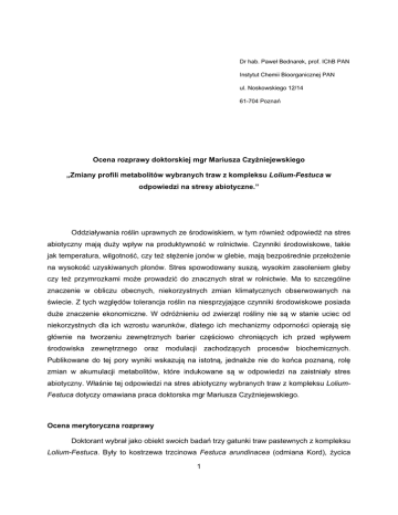 abiotyczny. Właśnie tej odpowiedzi na stres abiotyczny wybranych traw z kompleksu LoliumFestuca dotyczy omawiana praca doktorska mgr Mariusza Czyżniejewskiego.