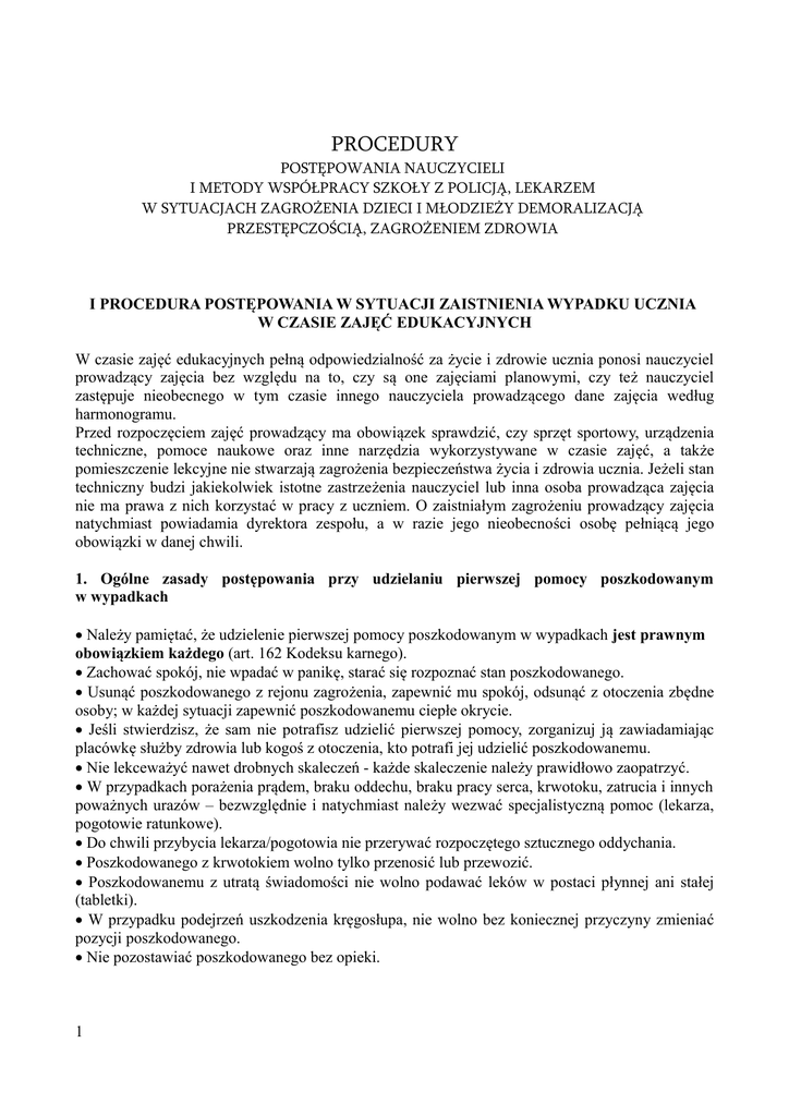PROCEDURY POSTĘPOWANIA NAUCZYCIELI I METODY WSPÓŁPRACY SZKOŁY Z POLICJĄ, LEKARZEM W SYTUACJACH ZAGROŻENIA DZIECI I MŁODZIEŻY DEMORALIZACJĄ PRZESTĘPCZOŚCIĄ, ZAGROŻENIEM ZDROWIA I PROCEDURA POSTĘPOWANIA W SYTUACJI ZAISTNIENIA WYPADKU UCZNIA W CZASIE ZAJĘĆ EDUKACYJNYCH W czasie zajęć edukacyjnych pełną odpowiedzialność za życie i zdrowie ucznia ponosi nauczyciel prowadzący zajęcia bez względu na to, czy są one zajęciami planowymi, czy też nauczyciel zastępuje nieobecnego w tym czasie innego nauczyciela prowadzącego dane zajęcia według harmonogramu. Przed rozpoczęciem zajęć prowadzący ma obowiązek sprawdzić, czy sprzęt sportowy, urządzenia techniczne, pomoce naukowe oraz inne narzędzia wykorzystywane w czasie zajęć, a także pomieszczenie lekcyjne nie stwarzają zagrożenia bezpieczeństwa życia i zdrowia ucznia. Jeżeli stan techniczny budzi jakiekolwiek istotne zastrzeżenia nauczyciel lub inna osoba prowadząca zajęcia nie ma prawa z nich korzystać w pracy z uczniem. O zaistniałym zagrożeniu prowadzący zajęcia natychmiast powiadamia dyrektora zespołu, a w razie jego nieobecności osobę pełniącą jego obowiązki w danej chwili. 1. Ogólne zasady postępowania przy udzielaniu pierwszej pomocy poszkodowanym w wypadkach · Należy pamiętać, że udzielenie pierwszej pomocy poszkodowanym w wypadkach jest prawnym obowiązkiem każdego (art. 162 Kodeksu karnego). · Zachować spokój, nie wpadać w panikę, starać się rozpoznać stan poszkodowanego. · Usunąć poszkodowanego z rejonu zagrożenia, zapewnić mu spokój, odsunąć z otoczenia zbędne osoby; w każdej sytuacji zapewnić poszkodowanemu ciepłe okrycie. · Jeśli stwierdzisz, że sam nie potrafisz udzielić pierwszej pomocy, zorganizuj ją zawiadamiając placówkę służby zdrowia lub kogoś z otoczenia, kto potrafi jej udzielić poszkodowanemu. · Nie lekceważyć nawet drobnych skaleczeń - każde skaleczenie należy prawidłowo zaopatrzyć. · W przypadkach porażenia prądem, braku oddechu, braku pracy serca, krwotoku, zatrucia i innych poważnych urazów – bezwzględnie i natychmiast należy wezwać specjalistyczną pomoc (lekarza, pogotowie ratunkowe). · Do chwili przybycia lekarza/pogotowia nie przerywać rozpoczętego sztucznego oddychania. · Poszkodowanego z krwotokiem wolno tylko przenosić lub przewozić. · Poszkodowanemu z utratą świadomości nie wolno podawać leków w postaci płynnej ani stałej (tabletki). · W przypadku podejrzeń uszkodzenia kręgosłupa, nie wolno bez koniecznej przyczyny zmieniać pozycji poszkodowanego. · Nie pozostawiać poszkodowanego bez opieki. 1 2. Procedura zawiadamianie o wypadku: Szkoła o każdym wypadku niezwłocznie zawiadamia: · rodziców (prawnych opiekunów) poszkodowanego; · organ prowadzący szkołę; · o wypadku śmiertelnym, ciężkim i zbiorowym - prokuratora i kuratora oświaty; · o wypadku, do którego doszło w wyniku zatrucia - inspektora sanitarnego; · o wypadku, w którym uraz spowodowany jest agresywnym działaniem osoby trzeciej –policję. 3. Procedury udzielania uczniom pierwszej pomocy przedlekarskiej Nauczyciel / pracownik szkoły podejmuje następujące działania: · Powiadamia o zdarzeniu dyrektora zespołu. · Powiadomione osoby wspólnie decydują o dalszym postępowaniu z uczniem. Decyzję o ewentualnym wezwaniu pogotowia ratunkowego podejmuje dyrektor zespołu. · Do momentu odebrania ucznia przez rodziców pozostaje on pod opieką wyznaczonej przez dyrektora osoby. Nauczyciel nie może podać uczniowi żadnych środków farmakologicznych! 4. Postępowanie w sytuacji zaistnienia wypadku lekkiego, niewymagającego interwencji lekarza (powierzchowne otarcia naskórka, stłuczenia, itp.): · Po stwierdzeniu zdarzenia nauczyciel natychmiast udziela poszkodowanemu pierwszej pomocy, po czym staje w drzwiach i głośno wzywa pomocy jeżeli taka jest potrzebna, pomoc może wezwać nauczyciel przez telefon. Po zapewnieniu opieki dla pozostających w sali uczniów należy poszkodowanego ucznia odprowadzić do sekretariatu szkoły lub pokoju nauczycielskiego, gdzie pomocy udziela osoba mająca przeszkolenie w tym zakresie. · Jeżeli przyczyną zdarzenia była wadliwość lub niesprawność użytych narzędzi, nauczyciel natychmiast zabezpiecza je, uniemożliwiając ich dalsze użytkowanie oraz zgłasza usterkę dyrektorowi i woźnemu. · Zdarzenie powyższe nie wymaga wpisu do rejestru wypadków oraz spisania protokołu powypadkowego. 5. Postępowanie w sytuacji zaistnienia wypadku wymagającego interwencji lekarza: · Po stwierdzeniu zdarzenia nauczyciel natychmiast udziela poszkodowanemu pierwszej pomocy, po czym staje w drzwiach i głośno wzywa pomocy. Następnie telefonicznie wzywa rodziców, pogotowie i dyrektora szkoły. · Jeśli nikt nie reaguje na głośne wzywanie pomocy, a poszkodowany uczeń w wyniku urazu nie powinien być ruszany, należy telefonicznie wezwać doraźną pomoc (np. osobę przeszkoloną w udzielaniu pierwszej pomocy). Jeśli natomiast poszkodowany może się poruszać, wówczas po zapewnieniu opieki pozostałym uczniom, należy doprowadzić poszkodowanego do sekretariatu. · Jeśli zdarzenie miało miejsce poza budynkiem szkoły, ale na terenie dookoła placówki (np.na boisku) i nie ma w pobliżu nikogo, kto może pomóc w zaistniałej sytuacji, wezwanie pomocy może nastąpić przy użyciu telefonu komórkowego nauczyciela lub poprzez wysłanie odpowiedzialnego ucznia do sekretariatu szkoły. · Sekretarz szkoły lub nauczyciel natychmiast wzywa pogotowie ratunkowe oraz powiadamia o zdarzeniu dyrektora zespołu. 2 · Do czasu przybycia pogotowia ratunkowego osoby przeszkolone w udzielaniu pomocy przedmedycznej natychmiast podejmują niezbędne czynności ratujące zdrowie i życie ucznia. · Do czasu przybycia pogotowia ratunkowego oraz rodziców uczeń pozostaje pod opieką nauczyciela. Dyrektor zapewnia opiekę pozostałym uczniom. · Tylko rodzic ma prawo podejmo