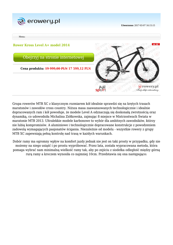Utworzono: 2017-03-07 16:15:15 Menu: Rower Kross Level A+ model 2014 Obejrzyj na stronie internetowej Cena produktu: 19 999,00 PLN 17 599,12 PLN Grupa rowerów MTB XC z klasycznym rozmiarem kół idealnie sprawdzi się na krętych trasach maratonów i zawodów cross country. Niższa masa zaawansowanych technologicznie i idealnie dopracowanych ram i kół powoduje, że modele Level A odznaczają się doskonałą zwrotnością oraz dynamiką, co udowodniła Michalina Ziółkowska, zajmując 8 miejsce w Mistrzostwach Świata w maratonie MTB 2013. Ultralekkie modele karbonowe to wybór dla ambitnych zawodników, którzy nie lubią kompromisów. A aluminiowe i technologicznie dopracowane konstrukcje z powodzeniem zadowolą wymagających pasjonatów ścigania. Niezależnie od modelu - wszystkie rowery z grupy MTB XC zapewniają pełną kontrolę nad trasą w każdych warunkach. Dobór ramy ma ogromny wpływ na komfort jazdy jednak nie jest on taki prosty w przypadku, gdy nie możemy na niego usiąść i po prostu wypróbować. Przez lata, została wypracowana metoda, która pomaga wybrać nam minimalną wielkość ramy tak, aby po zejściu z siodełka odległość między górną rurą ramy a kroczem wynosiła co najmniej 10cm. Przedstawia się ona następująco: 1. Stajemy boso przy ścianie. 2. Mierzymy odległość między podłożem, a kroczem. 3. Uzyskany wynik mnożymy: - przez 0,57 w przypadku roweru górskiego - przez 0,63 w przypadku roweru trekkingowego - przez 0,66 przy rowerze szosowym. 4. Otrzymany wynik należy podzielić przez 2,54 aby uzyskać wartość w calach. Wartość ta, to rozmiar ramy jakiej powinniśmy używać. Niestety trzeba pamiętać, że takie obliczenia są bardzo ogólne biorąc pod uwagę ilość możliwych stylów jazdy jakie stworzyła ludzkość. Ponadto sprawę utrudnia jeszcze długość roweru, która ma decydujący wpływ na pozycję na rowerze. Na szczęście na ten element możemy wpłynąć poprzez kilka manipulacji w naszym rowerze, a mianowicie: Jeśli jesteśmy za bardzo „położeni” na rowerze, możemy zmienić wspornik kierownicy na krótszy lub też zmienić kierownicę na „giętą” o wysokim wzniosie. Takie zabiegi sprawią, że nasza pozycja na rowerze będzie bardziej wyprostowana i wygodna Jeśli natomiast czujemy, że nasze ciało jest za bardzo odchylone do tyłu i przy podjazdach odczuwamy, że przednie koło ledwo dotyka podłoża lub się od niego odrywa to pomocne okaże się przesunięcie siodełka do przodu w jarzmie sztycy podsiodłowej. Kolejną sprawą jest styl jazdy. W klasycznych stylach takich jak: MTB, kolarstwo szosowe, trekking rozmiary podane w poniższych tabelkach przeważnie się zgadzają. Sprawa wygląda inaczej jeśli chcemy używać roweru bardziej ekstremalnie, na przykład: w maratonach czy wyścigach XC, w 4 Crossie, enduro czy downhillu. Wtedy lepsze okazują się ramy mniejsze, co najmniej o jeden lub nawet dwa rozmiary, a wszystko dlatego, że mniejszym rowerem łatwiej manewrować. Oczywiście nie można przesadzić z małym rozmiarem ponieważ to także nie wpływa korzystnie na prowadzenie roweru. Konieczne jest więc znalezienie swoistego „złotego środka” biorąc pod uwagę matematyczne wyliczenia, styl jazdy i doświadczenie innych osób jeżdżących na rowerach. Rowery dla dorosłych Wysokość ciała Długość wewnętrznej Rozmiar ramy Rozmiar ramy strony nogi w centymetrach MTB/CROSS CITY/TREKKING 152 cm 71 cm 14” (36cm) 16” (41 cm) 157 cm 72 cm 15” (38 cm) 17” (43 cm) 162 cm 74 cm 16” (41 cm) 18” (46 cm) 167 cm 75 cm 16” (41 cm) 18” (46 cm) 172 cm 76 cm 17” (43 cm) 19” (48 cm) 175 cm 77 cm 17" (43 cm) 19” (48 cm) 177 cm 79 cm 18" (46 cm) 20” (51 cm) 182 cm 82 cm 18" (46 cm) 20” (51 cm) 187 cm 86 cm 19" (48 cm) 21” (53 cm) 192 cm 89 cm 20" (51 cm) 22” (56 cm) 197 cm 92 cm 21" (53 cm) 22” (58 cm) Rowery dla dzieci Wiek Długość wewnętrznej Rozmiar ramy Rozmiar kół strony nogi w centymetrach roweru w rowerze 4-6 lat 48 cm brak 16” 5-8 lat 53 cm 11” 20” 5-8 lat 56 cm 12” 20” 5-8 lat 58 cm 13” 20” 7-12 lat 66 cm 14” 24” 7-12 lat 69 cm 15” 24” NA WSZYSTKIE MODELE KROSS UDZIELAMY 24 MIESIĘCZNEJ GWARANCJI !! >>SZCZEGÓŁY<< Rozmiary ram Klamki hamulców Hamulce Mechanizm korbowy Oś korbowodu Prowadzenie łańcucha XS, S, M, L SRAM XX SRAM XX (hydrauliczne, tarcza 160mm) SRAM XX 39/26T SRAM Press Fit GXP - Kierownica Easton EC90 XC (karbon, prosta 590, 31,8mm) Mostek/ Wspornik kierownicy Easton EC90 SL (carbon, 31,8mm) Pedały - Sztyca Easton EC90 Zero (karbon, 31,6mm) Siodło Fi'zi:k Tundra 2 Braided Przeznaczenie Piasta przód Męski SRAM Rise 60 Piasta tył SRAM Rise 60 Łańcuch SRAM PC 1091R Kaseta/ wolnobieg SRAM XX XG-1099 11-36T Szprychy - Obręcze SRAM Rise 60 karbon Opony Wyposażenie dodatkowe Typ roweru Waga Schwalbe Rocket Ron Evo 26"x2.1" Górski - Tylny amortyzator /Damper Rozmiar kół Sezon Rodzina Rama Widelec/amortyzator 26" 2014 Carbon SL Rock Shox SID XX WC Tapered (skok 100mm, blokada w manetce) Stery VP A45AC2 pół-zintegrowane Przerzutka przód SRAM XX 34,9mm Przerzutka tył SRAM XX karbon Manetki SRAM XX Grip Shift, 10 biegów Mimo dołożenia wszelkich starań nie gwarantujemy, że publikowane opisy i specyfikacje techniczne niezawierają uchybień lub błędów, które nie mogą jednak być podstawą do roszczeń. W przypadku jakichkolwiek wątpliwości, przed podjęciem decyzji prosimy o kontakt. Adres: www.erowery.pl Telefon: 605 515 185, 34 361 16 71 Email: [email protected]