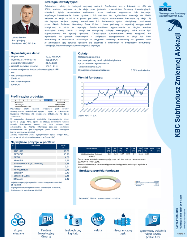 Strategia inwestycyjna: Najważniejsze dane: KBC Subfundusz Zmiennej Alokacji Jakub Bentke Zarządzający Portfelami KBC TFI S.A. Subfundusz należy do kategorii aktywnej alokacji. Subfundusz mo że lokować od 0% do 100% wartości aktywów w 1) akcje oraz jednostki uczestnictwa funduszy inwestycyjnych otwartych, tytuły uczestnictwa emitowane przez fundusze zagraniczne lub instytucje wspólnego inwestowania, które zgodnie z ich statutem lub regulaminem inwestują do 100% aktywów w akcje, a także w prawa pochodne, których instrumentem bazowym są akcje. 2) nie będące akcjami papiery wartościowe lub instrumenty rynku pieniężnego emitowane przez Skarb Państwa, Narodowy Bank Polski i inne podmioty o wysokiej wiarygodno ści kredytowej, a także w depozyty. Subfun.umożliwia wypracowanie w długim terminie atrakcyjnej strony zwrotu z uwagi na elastyczną politykę inwestycyjną, która może być dopasowywana do sytuacji rynkowej. Zarządzający subfunduszem może reagować na wydarzenia na rynkach finansowych – zwiększać zaangażowanie w akcje lub inne instrumenty o charakterze udziałowym w przypadku tendencji wzrostowej na gie łdzie bądź je zmniejszać, gdy sytuacja rynkowa się pogarsza i inwestować w bezpieczne instrumenty - obligacje, instrumenty rynku pieniężnego lub depozyty. Opłaty: 10.92 mln PLN • Aktywa netto: 122.26 PLN • Wycena j.u.(30-04-2015): 04-04-2012 • Data pierwszej wyceny: 100.01 PLN • Wartość pierwszej wyceny: • Numer w rejestrze funduszy inwestycyjnych: RFI Opłata manipulacyjna: - przy nabyciu: wg tabeli opłat dystrybutora - przy zamianie: wyrównawcza - przy umorzeniu: 0,0% Wynagrodzenie za zarządzanie: 354 • Min. pierwsza wpłata: 500 PLN • Min. kolejna wpłata: 100 PLN 3.50% w skali roku Wyniki funduszu: 124 120 116 112 Profil ryzyka produktu: 108 104 100 20 12 - 04 -0 4 20 12 -06 -0 8 20 12 -08 -0 7 20 12 -10 -0 5 20 12 -12 -0 5 20 13 -02 -0 8 20 13 -04 -1 1 20 13 -06 -1 4 20 13 -08 -1 3 20 13 -10 -1 1 20 13 -12 -1 2 20 14 -02 -1 8 20 14 -04 -1 7 20 14 -06 -2 0 20 14 -08 -2 0 20 14 -10 -1 7 20 14 -12 -1 7 20 15 -02 -2 3 20 15 -04 -2 4 96 Powyższy profil ryzyka pr o d u k t u jest równy Syntetycznemu wskaźnikowi ryzyka i zysku w dokumencie Kluczowe Informacje dla Inwestorów, aktualnemu na dzień 22-05-2014. W przypadku dystrybucji produkt ów inwestycyjnych przez spółki z Grupy KBC, spółki te stosują dodatkowo własne zasady dokonywania oceny czy dana us ługa jest odpowiednia dla Klienta. Informacja odno śnie produktów odpowiednich dla poszczególnych profili Klienta dostępna jest na stronie www.kbctfi.pl Zasady stosowane przez dystrybutor ów spoza Grupy KBC, mogą się różnić od zasad przyjętych w Grupie KBC. Źródło: KBC TFI S.A. Największe pozycje w portfelu: udział [%] 1 DS1023 2 PS0718 3 PZU 4 PKOBP 5 Santander CB (2015-01-29) 6 Pekao 7 FW20H1520 8 BZWBK 9 Biomed-Lublin 10 Monnari 16,86 15,28 4,60 3,87 3,78 2,91 2,76 2,49 2,15 2,12 Stopa zwrotu KBC Subfundusz Zmiennej Alokacji 1M [%] 3,03 3M [%] 6M [%] 6,18 6,47 9M [%] 13,41 1 rok [%] 8,11 2 lata [%] 10,16 3 lata [%] 4 lata [%] 5 lat [%] 22,81 Stopa zwrotu jest obliczana następująco np. za 2 lata – stopa zwrotu za okres 30.04.2013 - 30.04.2015. Powyższe informacje nie stanowią gwarancji osiągnięcia podobnych wyników w przyszłości. Struktura portfela funduszu Akcje 53,69% Dłużne papiery wartościowe 37,72% Inne aktywa 8,59% Razem: 100,00% Największe pozycje w portfelu funduszu wg stanu na dzień 31-12-2014. Więcej informacji w sprawozdaniu finansowym Funduszu, dostępnym na stronie www.kbctfi.pl Źródło KBC TFI S.A., stan na dzień 31-12-2014 Informacja marketingowa instrument KARTA PRODUKTU Aktualizacja na dzień 30-04-2015 # Strona 1 KBC Towarzystwo Funduszy Inwestycyjnych S.A. Informacje podstawowe: Siedziba: ul. Chmielna 85/87, 00-805 Warszawa Kontakt: [email protected]; infolinia: (22) 582 88 58 Aktywa w zarządzaniu: 4,024 mld PLN (stan na 31.12.2014) Data powstania: 20.04.2005 r.; połączenie WARTA TFI S.A., WARTA AM S.A., TFI KB S.A., KB ZA S.A. Zezwolenie Komisji Nadzoru Finansowego z dn. 14.05.2002, decyzja nr DFN1 - 4030–23-1/02-1452 Gdzie kupić fundusze KBC TFI? informacja na www.kbctfi.pl Komentarz analityka: W kwietniu na krajowym parkiecie dominował kolor zielony, a optymizm inwestor ów widoczny był we wszystkich subindeksach na Ksi ążęcej. WIG 20 zyskał +4,95 %, średnie spółki zrzeszone w ramach mWIG 40 wzrosły o +3,53 %, zaś najmniejsze należące do sWIG 80 zwiększyły swoją wartość o +2,34 %. W rezultacie szeroki indeks WIG zako ńczył miesiąc na 4,41-procentowym plusie, wykazując się znacznie większą siłą niż niemiecki DAX (-4,3%), czy francuski CAC40 (+0,3 %). Dobry sentyment do rynków wschodzących w kwietniu potwierdzają także 6,8-procentowe wzrosty indeksu MSCI Emerging Markets. Kwietniowe dane makroekonomiczne dają powody do optymistycznego patrzenia na polską gospodarkę. Przemysłowy PMI za miesiąc marzec wyniósł 54,8 pkt, zaś za kwiecień 54 pkt. Są to wartości znacznie powyżej progu 50 pkt. oddzielającego spowolnienie od ożywienia gospodarczego. Potwierdzeniem pozytywnego momentum w polskim PKB jest tak że dynamika produkcji przemysłowej w marcu wynosząca +8,8 % oraz sprzedaż detaliczna, która w analogicznym okresie wyniosła +3%. Jednocześnie wciąż zaobserwować można silne tendencje deflacyjne. Inflacja cen konsumenckich CPI wyniosła w marcu -1,5 % (oczekiwano -1,4 %), lecz jej dołek mamy prawdopodobnie już za sobą w lutym, kiedy to wynios ła -1,6 %. Biorąc pod uwagę komentarz RPP o zakończeniu cyklu obniżek stóp procentowych, dołek deflacyjny za nami, jak i dobre dane makro, wątpliwym wydaje się scenariusz kolejnej obni żki stóp procentowych przez obecną kadencję RPP, o ile oczywiście nie będziemy mieli do czynienia z gwałtownym umocnieniem złotego do koszyka głównych walut. Pozytywne momentum widać również w gospodarce Eurola
