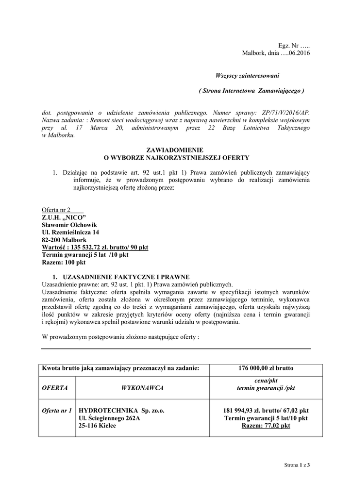 Egz. Nr ….. Malbork, dnia ….06.2016 Wszyscy zainteresowani ( Strona Internetowa Zamawiającego ) dot. postępowania o udzielenie zamówienia publicznego. Numer sprawy: ZP/71/V/2016/AP. Nazwa zadania: : Remont sieci wodociągowej wraz z naprawą nawierzchni w kompleksie wojskowym przy ul. 17 Marca 20, administrowanym przez 22 Bazę Lotnictwa Taktycznego w Malborku. ZAWIADOMIENIE O WYBORZE NAJKORZYSTNIEJSZEJ OFERTY 1. Działając na podstawie art. 92 ust.1 pkt 1) Prawa zamówień publicznych zamawiający informuje, że w prowadzonym postępowaniu wybrano do realizacji zamówienia najkorzystniejszą ofertę złożoną przez: Oferta nr 2 Z.U.H. ,,NICO” Sławomir Olchowik Ul. Rzemieślnicza 14 82-200 Malbork Wartość : 135 532,72 zł. brutto/ 90 pkt Termin gwarancji 5 lat /10 pkt Razem: 100 pkt 1. UZASADNIENIE FAKTYCZNE I PRAWNE Uzasadnienie prawne: art. 92 ust. 1 pkt. 1) Prawa zamówień publicznych. Uzasadnienie faktyczne: oferta spełniła wymagania zawarte w specyfikacji istotnych warunków zamówienia, oferta została złożona w określonym przez zamawiającego terminie, wykonawca przedstawił ofertę zgodną co do treści z wymaganiami zamawiającego, oferta uzyskała najwyższą ilość punktów w zakresie przyjętych kryteriów oceny oferty (najniższa cena i termin gwarancji i rękojmi) wykonawca spełnił postawione warunki udziału w postępowaniu. W prowadzonym postępowaniu złożono następujące oferty : Kwota brutto jaką zamawiający przeznaczył na zadanie: 176 000,00 zł brutto OFERTA cena/pkt termin gwarancji /pkt Oferta nr 1 WYKONAWCA HYDROTECHNIKA Sp. zo.o. Ul. Ściegiennego 262A 25-116 Kielce 181 994,93 zł. brutto/ 67,02 pkt Termin gwarancji 5 lat/10 pkt Razem: 77,02 pkt Strona 1 z 3 Oferta nr 2 Z.U.H. ,,NICO” Sławomir Olchowik Ul. Rzemieślnicza 14 82-200 Malbork 135 532,72 zł. brutto/ 90,00 pkt Termin gwarancji 5 lat/10 pkt Razem: 100 pkt Oferta nr 3 STRABAG Sp.z.o.o. Ul. Parzniewska 10 05-800 Pruszków 154 704,26 zł. brutto / 78,85 pkt Termin gwarancji 5 lat/10 pkt Razem: 88,85 pkt Oferta nr 4 Oferta nr 5 Przedsiębiorstwo Usługowo-Handlowe ,,BUD-EKO” Jolanta Schreiber Ul. Mieszka I 1/20 82-500 Kwidzyn EKO-TECH Karol Słomski Ul. 27 Stycznia 7 83-140 Gniew 147 382,67 zł. brutto / 82,76 pkt Termin gwarancji 5 lat/10 pkt Razem: 92,76 pkt 146 141,22 zł zł. brutto / 83,47 pkt Termin gwarancji 5 lat/10 pkt Razem: 93,47 pkt Oferta nr 6 ELEKTRO-CAL Sp.z.o.o. Zajączkowo 28 A 83-111 Miłoradz 157 109,13 zł. brutto / 77,64 pkt Termin gwarancji 5 lat/10 pkt Razem: 87,64 pkt Oferta nr 7 Przedsiębiorstwo Wielobranżowe ,,SKIBIŃSKI” Mieczysław Skibiński Ul. Mickiewicza 43ajączkowo 28 A 83-340 Sierakowice 147 257,46 zł. brutto / 82,83 pkt Termin gwarancji 5 lat/10 pkt Razem: 92,83 pkt 2 . Działając na podstawie art. 92 ust. 1 pkt. 2) Prawa zamówień publicznych zamawiający informuje, że w prowadzonym postępowaniu nie zostały odrzucone oferty. 3. Działając na podstawie art. 92 ust. 1 pkt. 3) Prawa zamówień publicznych zamawiający informuje, że w prowadzonym postępowaniu nie zostali wykluczeni wykonawcy. Środki ochrony prawnej Od niniejszej decyzji zamawiającego, wykonawcy przysługują środki ochrony prawnej (Odwołanie, Skarga do Sądu) wobec czynności: 1) Wykluczenia wykonawcy z postępowania o udzielenie zamówienia; 2) Odrzucenia oferty wykonawcy W pozostałych przypadkach odwołanie nie przysługuje. Wykonawca może w terminie przewidzianym do wniesienia odwołania poinformować zamawiającego o: 1) niezgodnej z przepisami ustawy czynności podjętej przez zamawiającego w niniejszym postępowaniu, lub Strona 2 z 3 2) zaniechania czynności, od której zamawiający jest zobowiązany na podstawie ustawy, na które nie przysługuje w niniejszym postępowaniu odwołanie. Termin wniesienia odwołania: 5 dni od dnia przesłania niniejszego zawiadomienia faksem lub drogą elektroniczną, lub 10 dni od dnia przesłania niniejszego zawiadomienia, jeżeli zostało ono wysłane pisemnie. Informacje dotyczące środków ochrony prawnej znajdują się w specyfikacji istotnych warunków zamówienia oraz w Dziale VI Prawa zamówień publicznych „Środki ochrony prawnej”, art. 179 do 198 g (tj. Dz. U. z 2015r. poz. 2164 z p.zm.). DOWÓDCA 22BAZY LOTNICTWA TAKTYCZNEGO ……………………………………………. Wykonano w 1 egz.: Egz. Nr 1 – ad acta (T:11/13) ( B-C) Wykonał: A. Paściak 13.06.2016 r. ( tel. 261 536 782) Dostęp do dokumentu: Sekcja Zamówień Publicznych Strona 3 z 3