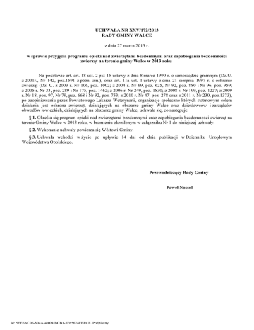 UCHWAŁA NR XXV/172/2013 RADY GMINY WALCE z dnia 27 marca 2013 r. w sprawie przyjęcia programu opieki nad zwierzętami bezdomnymi oraz zapobiegania bezdomności zwierząt na terenie gminy Walce w 2013 roku Na podstawie art. art. 18 ust. 2 pkt 15 ustawy z dnia 8 marca 1990 r. o samorządzie gminnym (Dz.U. z 2001r., Nr 142, poz.1591 z późn. zm.), oraz art. 11a ust. 1 ustawy z dnia 21 sierpnia 1997 r. o ochronie zwierząt (Dz. U. z 2003 r. Nr 106, poz. 1002; z 2004 r. Nr 69, poz. 625, Nr 92, poz. 880 i Nr 96, poz. 959; z 2005 r. Nr 33, poz. 289 i Nr 175, poz. 1462; z 2006 r. Nr 249, poz. 1830; z 2008 r. Nr 199, poz. 1227; z 2009 r. Nr 18, poz. 97, Nr 79, poz. 668 i Nr 92, poz. 753; z 2010 r. Nr 47, poz. 278 oraz z 2011 r. Nr 230, poz.1373), po zaopiniowaniu przez Powiatowego Lekarza Weterynarii, organizacje społeczne których statutowym celem działania jest ochrona zwierząt, działających na obszarze gminy Walce oraz dzierżawców i zarządców obwodów łowieckich, działających na obszarze gminy Walce, uchwala się, co następuje: § 1. Określa się program opieki nad zwierzętami bezdomnymi oraz zapobiegania bezdomności zwierząt na terenie Gminy Walce w 2013 roku, w brzmieniu określonym w załączniku Nr 1 do niniejszej uchwały. § 2. Wykonanie uchwały powierza się Wójtowi Gminy. § 3. Uchwała wchodzi w życie po upływie 14 dni od dnia publikacji w Dzienniku Urzędowym Województwa Opolskiego. Przewodniczący Rady Gminy Paweł Nossol Id: 5EE6AC06-804A-4A09-BCB1-5F65674FBFCE. Podpisany Załącznik Nr 1 do Uchwały Nr XXV/172/2013 Rady Gminy Walce z dnia 27 marca 2013 r. Program opieki nad zwierzętami bezdomnymi oraz zapobiegania bezdomności zwierząt na terenie Gminy Walce w 2013 roku Podstawą prawną podjęcia przez Radę Gminy Walce uchwały w sprawie „Programu opieki nad zwierzętami bezdomnymi oraz zapobiegania bezdomności zwierząt na terenie Gminy Walce w 2013 r.”, zwanego dalej Programem jest art. 11a ustawy z dnia 21 sierpnia 1997 r. o ochronie zwierząt. Program ma zastosowanie do wszystkich zwierząt domowych, w szczególności psów i kotów, w tym kotów wolno żyjących oraz zwierząt gospodarskich. Większość działań określonych w Programie dotyczy psów i kotów, ponieważ skala bezdomności tych zwierząt jest największa w Gminie. Rozdział 1. POSTANOWIENIA OGÓLNE § 1. Ilekroć w programie jest mowa o: 1) schronisku, należy przez to rozumieć Schronisko dla Bezdomnych Zwierząt w Kędzierzynie-Koźlu przy ul.Gliwickiej 20 prowadzonego przez Miejskie Składowisko Odpadów będące jednostką organizacyjną Gminy Kędzierzyn–Koźle z którą Gmina Walce zawarła porozumienie w zakresie kompleksowej opieki nad bezdomnymi zwierzętami; 2) programie , należy przez to rozumieć Program opieki nad zwierzętami bezdomnymi oraz zapobiegania bezdomności zwierząt na terenie Gminy Walce w 2013 roku; 3) Wójcie Gminy , należy przez to rozumieć Wójta Gminy Walce; 4) Urzędzie Gminy , należy przez to rozumieć Urząd Gminy Walce; 5) Gminie , należy przez to rozumieć Gminę Walce; 6) ustawie , należy przez to rozumieć ustawę z dnia 21 sierpnia 1997 r. o ochronie zwierząt ( Dz.U. z 2003 r. Nr 106, poz. 1002, ze zm. ); 7) kotach wolno żyjących , należy przez to rozumieć koty urodzone lub żyjące na wolności (żyjące w otoczeniu człowieka w stanie dzikim); 8) właścicielu , należy przez to rozumieć osobę będącą mieszkańcem gminy Walce posiadającą zwierzę lub zwierzęta, o których mowa w niniejszej uchwale; 9) opiekunie społecznym , należy przez to rozumieć osobę, która społecznie pomaga i sprawuje opiekę nad wolno żyjącymi kotami na terenie gminy Walce. § 2. Koordynatorem Programu jest Wójt Gminy, który swoje uprawnienia wykonuje za pośrednictwem Referatu Infrastruktury, Gospodarki Komunalnej i Rolnictwa Urzędu Gminy. Rozdział 2. Cel programu § 3. Celem Programu jest zapobieganie bezdomności zwierząt na terenie Gminy, oraz opieka nad zwierzętami bezdomnymi. Rozdział 3. Zapewnienie bezdomnym zwierzętom miejsca w schronisku dla zwierząt § 4. Gmina zapewnia bezdomnym zwierzętom domowym z jej terenu miejsca w schronisku w ramach podpisanego porozumienia w zakresie kompleksowej opieki nad zwierzętami bezdomnymi. Id: 5EE6AC06-804A-4A09-BCB1-5F65674FBFCE. Podpisany Rozdział 4. Opieka nad wolno żyjącymi kotami, w tym ich dokarmianie § 5. 1. Wolno żyjące na terenie gminy koty podlegają opiece Gminy. 2. Gmina prowadzi dokarmianie kotów wolno żyjących na terenie ich przebywania. 3. Dokarmianie kotów wolno żyjących prowadzić będą społeczni opiekunowie. 4. Gmina zapewni zakup i wydawanie karmy społecznym opiekunom (karmicielom) kotów wolno żyjących. 5. Osoba pełniąca funkcję opiekuna społecznego zobowiązana jest złożyć stosowną deklarację do Referatu Infrastruktury, Gospodarki Komunalnej i Rolnictwa w Urzędzie Gminy. Rozdział 5. Odławianie bezdomnych zwierząt § 6. 1. Odławianie bezdomnych zwierząt z terenu Gminy będzie realizowane interwencyjnie – po przyjęciu zgłoszeń o błąkających się bez opieki zwierzętach i braku możliwości ustalenia ich właścicieli lub innych osób, pod których opieką zwierzęta dotychczas przebywały. 2. Zasady wyłapywania bezdomnych zwierząt, w tym psów i kotów oraz dalsze postępowanie z tymi zwierzętami określa odrębna Uchwała Rady Gminy Walce. Rozdział 6. Obligatoryjna sterylizacja albo kastracja zwierząt w schronisku dla zwierząt § 7. 1. Ograniczanie populacji bezdomnych zwierząt poprzez sterylizację i kastrację zwierząt domowych, w szczególności psów i kotów, realizuje schronisko z którym Gmina podpisała porozumienie, poprzez obligatoryjne przeprowadzanie zabiegów sterylizacji i kastracji zwierząt przyjętych do schroniska, z wyjątkiem zwierząt u których istnieje przeciwwskazanie do wykonania zabiegów, z uwagi na stan zdrowia lub wiek. 2. Zabiegom sterylizacji i kastracji nie podlegają zwierzęta w o