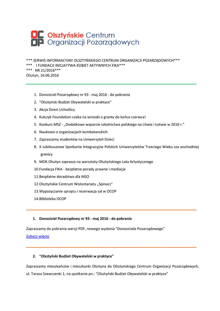 *** SERWIS INFORMACYJNY OLSZTYŃSKIEGO CENTRUM ORGANIZACJI POZARZĄDOWYCH*** *** I FUNDACJI INICJATYWA KOBIET AKTYWNYCH FIKA*** *** NR 21/2016*** Olsztyn, 16.06.2016 __________________________________________________________ 1. Donosiciel Pozarządowy nr 93 - maj 2016 - do pobrania 2. "Olsztyński Budżet Obywatelski w praktyce" 3. Akcja Dzień Uchodźcy 4. Kulczyk Foundation czeka na wnioski o granty do końca czerwca! 5. Konkurs MSZ - „Dodatkowe wsparcie szkolnictwa polskiego na Litwie i Łotwie w 2016 r.” 6. Naukowo o organizacjach kombatanckich 7. Zapraszamy studentów na Uniwersytet Dzieci 8. X Jubileuszowe Spotkanie Integracyjne Polskich Uniwersytetów Trzeciego Wieku zza wschodniej granicy 9. MOK Olsztyn zaprasza na warsztaty Olsztyńskiego Lata Artystycznego 10.Fundacja FIKA - bezpłatne porady prawne i mediacje 11.Bezpłatne doradztwo dla NGO 12.Olsztyńskie Centrum Wolontariatu „Spinacz” 13.Wypożyczanie sprzętu i rezerwacja sal w OCOP 14.Biblioteka OCOP __________________________________________________________ 1. Donosiciel Pozarządowy nr 93 - maj 2016 - do pobrania Zapraszamy do pobrania wersji PDF, nowego wydania "Donosiciela Pozarządowego" Zobacz więcej __________________________________________________________ 2. "Olsztyński Budżet Obywatelski w praktyce" Zapraszamy mieszkańców i mieszkanki Olsztyna do Olsztyńskiego Centrum Organizacji Pozarządowych, ul. Tarasa Szewczenki 1, na spotkanie pn.: "Olsztyński Budżet Obywatelski w praktyce" piątek, 17.06.2016 w godzinach 11.00 - 13.30 wtorek, 21.06.2016 r. w godzinach 15.30 do 18.30 Na spotkaniu będzie można dowiedzieć się o zasadach Olsztyńskiego Budżetu Obywatelskiego, przedyskutować pomysł na projekt do OBO, wypełnić wniosek. Zespół OCOP __________________________________________________________ 3. Akcja Dzień Uchodźcy 20 czerwca na całym świecie obchodzony jest Międzynarodowy Dzień Uchodźcy. W tym roku, w ramach święta uchodźcy, Fundacja Batorego organizuje w dniach 18 - 25 czerwca tygodniową akcję informacyjno-edukacyjną, do której zaprasza organizacje pozarządowe i grupy nieformalne, placówki kulturalne i edukacyjne, biblioteki, teatry, galerie, szkoły, klubokawiarnie, osoby indywidualne i media. Wszystkich, którzy chcą wyrazić swoją solidarność z osobami uciekającymi przed wojną, kataklizmem, więzieniem i represjami. Zobacz więcej __________________________________________________________ 4. Kulczyk Foundation czeka na wnioski o granty do końca czerwca! O granty od Kulczyk Foundation mogą ubiegać się instytucje, stowarzyszenia i fundacje. – Kulczyk Foundation chce przenosić do filantropii najlepsze rozwiązania biznesowe. W każdym roku kalendarzowym odbywać się będą dwie edycje konkursu grantowego. Pierwsza kończy się 30 czerwca. Maksymalna kwota, o którą można się ubiegać wynosi 25 000 złotych. Zwycięzców poznamy do 15 sierpnia. Zobacz więcej __________________________________________________________ 5. Konkurs MSZ - „Dodatkowe wsparcie szkolnictwa polskiego na Litwie i Łotwie w 2016 r.” Minister Spraw Zagranicznych ogłasza konkurs na realizację zadania publicznego: „Dodatkowe wsparcie szkolnictwa polskiego na Litwie i Łotwie w 2016 r.”. Termin składania ofert upływa w dniu 7 lipca 2016 r. SZCZEGÓŁY KONKURSU __________________________________________________________ 6. Naukowo o organizacjach kombatanckich Związek Żołnierzy Wojska Polskiego 14 czerwca 2016 r. obchodzi 35. rocznicę swego powstania. Z tej okazji Zarząd Wojewódzki ZŻWP w Olsztynie, Archiwum Państwowe i Pracownia Historii Wojskowości Instytutu Historii Stosunków Międzynarodowych UWM organizują konferencję naukową pt. „Polskie organizacje kombatanckie”. Konferencja odbędzie się w piątek, 17 czerwca, od godz. 9 w Archiwum Państwowym w Olsztynie (ul. Partyzantów 18). Zobacz więcej __________________________________________________________ 7. Zapraszamy studentów na Uniwersytet Dzieci W nowym roku akademickim Fundacja Uniwersytet Dzieci przymierza się do zwiększenia liczby miejsc, tak aby jeszcze więcej dzieci z naszego miasta i regionu miało możliwość uczestnictwa w inspirujących zajęciach z różnych dziedzin wiedzy. Rekrutacja trwa do 23 czerwca trwa. Zapisy: rekrutacja do projektu Uniwersytet Dzieci __________________________________________________________ 8. X Jubileuszowe Spotkanie Integracyjne Polskich Uniwersytetów Trzeciego Wieku zza wschodniej granicy Akademia Trzeciego Wieku serdecznie zaprasza na "X Jubileuszowe Spotkanie Integracyjne Polskich Uniwersytetów Trzeciego Wieku za wschodniej granicy", które odbędzie sie w dniach 26.06. - 01.07. 2016 r. Zobacz więcej __________________________________________________________ 9. MOK Olsztyn zaprasza na warsztaty Olsztyńskiego Lata Artystycznego Miejski Ośrodek Kultury serdecznie zaprasza do udziału w warsztatach Olsztyńskiego Lata Artystycznego. Wstęp na wszystkie warsztaty jest bezpłatny. Zobacz więcej __________________________________________________________ 10. Fundacja FIKA - bezpłatne porady prawne i mediacje Zapraszamy na bezpłatne porady prawne: środy w godzinach 11.00-14.00 - porady prawne, piątki w godzinach 11.00-14.00 - porady prawne i mediacje Fundacja "Inicjatywa Kobiet Aktywnych" FIKA; 10-274 Olsztyn, ul. Tarasa Szewczenki 1, tel. 505 344 605 Nieodpłatną pomoc prawną można uzyskać również w Urzędzie Miasta Olsztyna, ul. Wyzwolenia 30, pok. 19, tel. 527-31-11. Pomoc prawna świadczona jest od poniedziałku do piątku w godz. 8.00-16.00. Pomoc prawną w Urzędzie Miasta Olsztyna mogą uzyskać tylko osoby określone w ustawie ( ustawa z dnia 5 sierpnia 2015 r. o nieodpłatnej pomocy prawnej). Zapraszamy. __________________________________________________________ 11. Bezpłatne doradztwo dla NGO Olsztyńskie Centrum Organizacji Pozarządowych oferuje bezpłatną pomoc przy przygotowaniu ofert konkursowych. Organizacje zainteresowane ofert