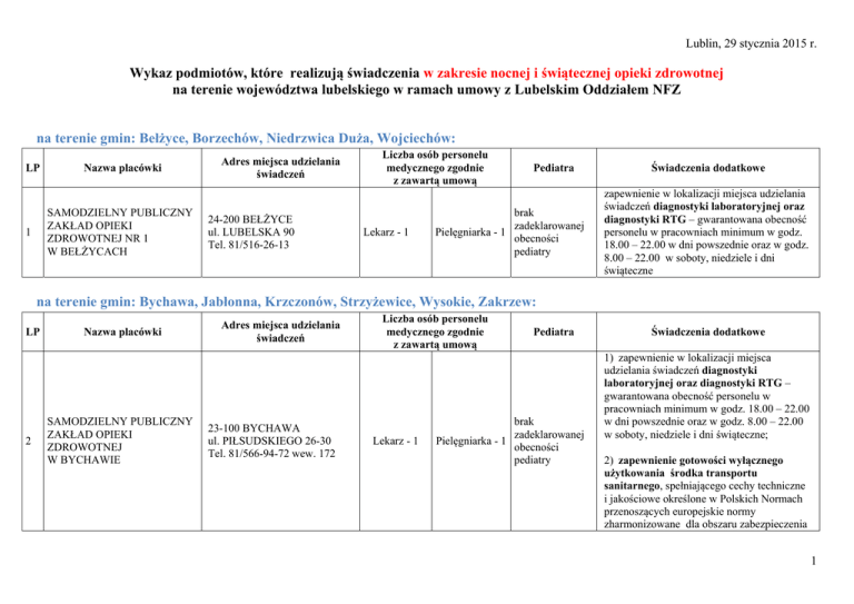 Lublin, 29 stycznia 2015 r. Wykaz podmiotów, które realizują świadczenia w zakresie nocnej i świątecznej opieki zdrowotnej na terenie województwa lubelskiego w ramach umowy z Lubelskim Oddziałem NFZ na terenie gmin: Bełżyce, Borzechów, Niedrzwica Duża, Wojciechów: LP Nazwa placówki SAMODZIELNY PUBLICZNY ZAKŁAD OPIEKI ZDROWOTNEJ NR 1 W BEŁŻYCACH 1 Adres miejsca udzielania świadczeń 24-200 BEŁŻYCE ul. LUBELSKA 90 Tel. 81/516-26-13 Liczba osób personelu medycznego zgodnie z zawartą umową Lekarz - 1 Pediatra brak zadeklarowanej Pielęgniarka - 1 obecności pediatry Świadczenia dodatkowe zapewnienie w lokalizacji miejsca udzielania świadczeń diagnostyki laboratoryjnej oraz diagnostyki RTG – gwarantowana obecność personelu w pracowniach minimum w godz. 18.00 – 22.00 w dni powszednie oraz w godz. 8.00 – 22.00 w soboty, niedziele i dni świąteczne na terenie gmin: Bychawa, Jabłonna, Krzczonów, Strzyżewice, Wysokie, Zakrzew: LP 2 Nazwa placówki SAMODZIELNY PUBLICZNY ZAKŁAD OPIEKI ZDROWOTNEJ W BYCHAWIE Adres miejsca udzielania świadczeń 23-100 BYCHAWA ul. PIŁSUDSKIEGO 26-30 Tel. 81/566-94-72 wew. 172 Liczba osób personelu medycznego zgodnie z zawartą umową Lekarz - 1 Pediatra brak zadeklarowanej Pielęgniarka - 1 obecności pediatry Świadczenia dodatkowe 1) zapewnienie w lokalizacji miejsca udzielania świadczeń diagnostyki laboratoryjnej oraz diagnostyki RTG – gwarantowana obecność personelu w pracowniach minimum w godz. 18.00 – 22.00 w dni powszednie oraz w godz. 8.00 – 22.00 w soboty, niedziele i dni świąteczne; 2) zapewnienie gotowości wyłącznego użytkowania środka transportu sanitarnego, spełniającego cechy techniczne i jakościowe określone w Polskich Normach przenoszących europejskie normy zharmonizowane dla obszaru zabezpieczenia 1 na terenie Gminy Konopnica i Miasta Lublin obejmujące ulice: 1 MAJA, ABELARDA, AGATOWA, AKSINI, AMETYSTOWA, BEATRYCZE, BEŁŻYCKA, BETONOWA, BIAŁOSTOCKA, BIEDRONKI, BIESZCZADZKA, BOCIANIA, BORYNY, BÓR, BURSZTYNOWA, CIENISTA, CIEPŁA, CIEPŁOWNICZA, CYDA, CYRKONIOWA, CZERNIEJOWSKA, DIAMENTOWA, DITTY, IGNACEGO DOMEYKI, DRAGONÓW, DWORCOWA, DZIERŻAWNA, DZIEWANNY, ENERGETYKÓW, FABRYCZNA, FANTASTYCZNA, FILONA, FOLWARCZNA, BISKUPA MARIANA FULMANA, GAZOWA, GDAŃSKA, GĘSIA, GOŚCINNA, GRZYBOWA, GULIWERA, HAMLETA, HELOIZY, HERBOWA, HETMAŃSKA, HUSARSKA, INŻYNIERSKA, IZOLDY, TADEUSZA JACYNY-ONYSZKIEWICZA, JANA PAWŁA II, JANOWSKA, JANTAROWA, JASPISOWA, HIERONIMA JAWŁOWSKIEGO, JUDYMA, JULII, JUTRZENKI, KACZA, KACZEŃCOWA, MATKI TERESY Z KALKUTY, KASZUBSKA, KAWALERYJSKA, KAWIA, KIELECKA, KLEOPATRY, WITOLDA KLEPACKIEGO, KMICICA, EDWARDA KOŁACZKOWSKIEGO, KOŁO, KORALOWA, KRĘŻNICKA, KROCHMALNA, TADEUSZA KRWAWICZA, KRYSZTAŁOWA, KU SŁOŃCU, KUJAWSKA, KUKUŁCZA, KURPIOWSKA, KWARCOWA, LASKOWA, LAURY, LAZUROWA, LETNISKOWA, LIPNIAK, LIPSKA, ŁANOWA, ŁĄKOWA, ŁOMŻYŃSKA, ŁOWICKA, ŁUKOWSKA, MAŁOPOLSKA, MARZANNY, MAZOWIECKA, MAZURSKA, MEDALIONÓW, MŁYŃSKA, MODRA, MRÓWCZA, NA STOKU, NAD ZALEWEM, NADŁĄCZNA, NAŁKOWSKICH, NATASZY, NIEZAPOMINAJKI, NIZINNA, OFELII, WŁADYSŁAWA OLECHNOWICZA, KAROLA OLSZEWSKIEGO, OLSZTYŃSKA, ONIEGINA, ONYKSOWA, OPALOWA, OPOLSKA, WŁADYSŁAWA ORKANA, ORLANDA, OSMOLICKA, OWCZA, PARCZEWSKA, PARYSA, PASIECZNA, PAWŁA, PERLICZA, PERŁOWA, STANISŁAWA PIĄTKOWSKIEGO, JÓZEFA PIECHOTY, PIEKARSKA, PLAC BYCHAWSKI, PLAC DWORCOWY, POCZTOWA, POD GAJEM, PODHALAŃSKA, POLONIUSZA, POMORSKA, PORANNA, POZNAŃSKA, PRAWIEDNICKA, PRZEDWIOŚNIE, PRZESKOK, PRZY BOCZNICY, PRZYTULNA, PSZCZELA, PTASIA, RADOMSKA, RADOŚCI, RADZIKOWSKA, RASZYŃSKA, RĄBLOWSKA, ŁUKASZA RODAKIEWICZA, ROMANTYCZNA, ROMEA, EUGENIUSZA ROMERA, ROSY, ROŚLINNA, ROZTOCZE, RÓŻANA, RUBINOWA, RUCIANA, RYCERSKA, RZEMIEŚLNICZA, RZESZOWSKA, JANA SAMSONOWICZA, SANDOMIERSKA, SARNIA, SASANKOWA, SIELSKA, FELIKSA SKUBISZEWSKIEGO, ANTONIEGO SŁOMKOWSKIEGO, SŁUPKOWA, MARIANA SMOLUCHOWSKIEGO, SPÓŁDZIELCZA, STARY GAJ, MIECZYSŁAWA STELMASIAKA, STOKROTKI, SYMPATYCZNA, SZAFIROWA, SZASERÓW, SZCZECIŃSKA, CZESŁAWA SZCZEPAŃSKIEGO, SZCZĘŚLIWA, SZCZYTOWA, SZMARAGDOWA, SZWEJKA, ROMANA ŚLASKIEGO, ŚLĄSKA, TARNINOWA, TATARAKOWA, TATIANY, TĘCZOWA, TOPAZOWA, TRISTANA, JANA TURCZYNOWICZA, TURKUSOWA, TURNIOWA, TYMIANKOWA, URZĘDOWSKA, UŚMIECHU, BERNARDA WAPOWSKIEGO, WARMIŃSKA, WATYKAŃSKA, WĄWOZOWA, WERTERA, WĘGLINEK, WIDOK, WIELKOPOLSKA, WIKLINOWA, WŁOŚCIAŃSKA, WOKULSKIEGO, HENRYKA WOLIŃSKIEGO, JACKA WORONIECKIEGO, PROF. IGNACEGO WOŚKI, WROCŁAWSKA, WROTKOWSKA, WRÓBLA, WYŻYNNA, ZAGAJNIKOWA, ZAGŁOBY, ZALEW ZEMBORZYCKI, ZIOŁOWA, ZWYCIĘSKA, ŻEGLARSKA, GMINA KONOPNICA LP 3 Nazwa placówki NIEPUBLICZNY ZAKŁAD OPIEKI ZDROWOTNEJ GALEN CAŁODOBOWA OPIEKA LEKARSKOPIELĘGNIARSKA LEK. MED. MIROSŁAW PODGÓRSKI Adres miejsca udzielania świadczeń LUBLIN ul. WAPOSKIEGO 2 lok. 3 Tel. 81/450-58 25 Liczba osób personelu medycznego zgodnie z zawartą umową Lekarz - 2 Pediatra gwarantowana Pielęgniarka - 2 stała obecność lekarza pediatry Świadczenia dodatkowe zapewnienie gotowości wyłącznego użytkowania środka transportu sanitarnego, spełniającego cechy techniczne i jakościowe określone w Polskich Normach przenoszących europejskie normy zharmonizowane dla obszaru zabezpieczenia 2 na terenie Gminy Niemce i Miasta Lublin obejmujące ulice: 3 MAJA, AGRESTOWA, AL.WŁADYSŁAWA ANDERSA, ARCHIDIAKOŃSKA, FRANCISZKI ARNSZTAJNOWEJ, ARONIOWA, JANA BARCICKIEGO, BARWINKOWA, BAZYLIANÓWKA, BERBERYSOWA, BERNARDYŃSKA, BESKIDZKA, FELIKSA BIECZYŃSKIEGO, KONRADA BIELSKIEGO, MIECZYSŁAWA BIERNACKIEGO, BLUSZCZOWA, BOCZNA RUSAŁKI, JANA BOŁBOTTA, BORÓWKOWA, BRAMOWA, BRZOSKWINIOWA, BRZOZOWA, BUDRYSÓW, BULWAROWA, BURSAKI, CEDROWA, CERAMICZNA, CERKIEWNA, JANA CHĘCIŃSKIEGO, CHMIELNA, DRA WITOLDA CHODŹKI, CHOINY, FRYDERYKA CHOPINA, CIASNA, CICHA, MARII CURIE-SKŁODOWSKIEJ, PLAC MARII CURIE-SKŁODOWSKIEJ, CYNAMONOWA, CYPRYSOWA, CYRULICZA, PLAC JÓZEFA CZECHOWICZA, IGNACEGO CZUMY, CZWARTEK, CZYSTA, DAKTYLOWA, DALIOWA, DERENIOWA, DĘBOW
