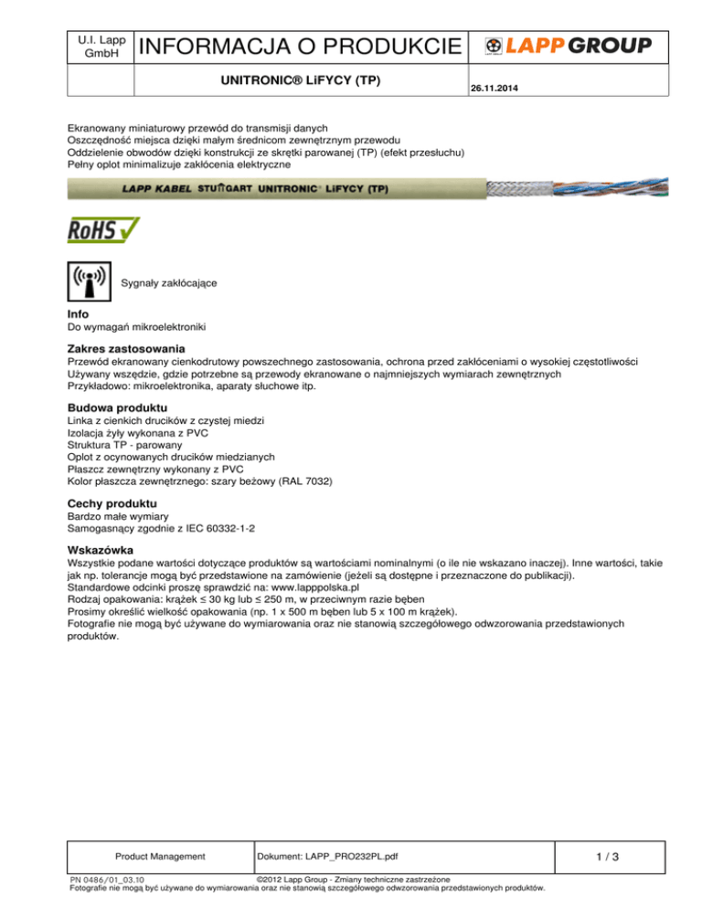 U.I. Lapp GmbH INFORMACJA O PRODUKCIE UNITRONIC® LiFYCY (TP) 26.11.2014 Ekranowany miniaturowy przewód do transmisji danych Oszczędność miejsca dzięki małym średnicom zewnętrznym przewodu Oddzielenie obwodów dzięki konstrukcji ze skrętki parowanej (TP) (efekt przesłuchu) Pełny oplot minimalizuje zakłócenia elektryczne Sygnały zakłócające Info Do wymagań mikroelektroniki Zakres zastosowania Przewód ekranowany cienkodrutowy powszechnego zastosowania, ochrona przed zakłóceniami o wysokiej częstotliwości Używany wszędzie, gdzie potrzebne są przewody ekranowane o najmniejszych wymiarach zewnętrznych Przykładowo: mikroelektronika, aparaty słuchowe itp. Budowa produktu Linka z cienkich drucików z czystej miedzi Izolacja żyły wykonana z PVC Struktura TP - parowany Oplot z ocynowanych drucików miedzianych Płaszcz zewnętrzny wykonany z PVC Kolor płaszcza zewnętrznego: szary beżowy (RAL 7032) Cechy produktu Bardzo małe wymiary Samogasnący zgodnie z IEC 60332-1-2 Wskazówka Wszystkie podane wartości dotyczące produktów są wartościami nominalnymi (o ile nie wskazano inaczej). Inne wartości, takie jak np. tolerancje mogą być przedstawione na zamówienie (jeżeli są dostępne i przeznaczone do publikacji). Standardowe odcinki proszę sprawdzić na: www.lapppolska.pl Rodzaj opakowania: krążek ≤ 30 kg lub ≤ 250 m, w przeciwnym razie bęben Prosimy określić wielkość opakowania (np. 1 x 500 m bęben lub 5 x 100 m krążek). Fotografie nie mogą być używane do wymiarowania oraz nie stanowią szczegółowego odwzorowania przedstawionych produktów. Product Management Dokument: LAPP_PRO232PL.pdf ©2012 Lapp Group - Zmiany techniczne zastrzeżone PN 0486/01_03.10 Fotografie nie mogą być używane do wymiarowania oraz nie stanowią szczegółowego odwzorowania przedstawionych produktów. 1/3 U.I. Lapp GmbH INFORMACJA O PRODUKCIE UNITRONIC® LiFYCY (TP) Dane techniczne 26.11.2014 Oznaczenie żył: DIN 47100, patrz załącznik T9 Pojemność robocza: Żyła/Żyła około 80 nF/km Żyła/Ekran około 120 nF/km Szczytowe napięcie robocze: (nie do zastosowań silnoprądowych) 150 V Klasyfikacja: ETIM 5.0 Class-ID: EC000104 Opis klasy ETIM 5.0: Przewód sterowniczy Indukcyjność: Około 0,65 mH/km Sprzężenie: Przy 1 kHz: około 300 pF/100 m Budowa żyły: Linka, bardzo cienkie druciki, Przekrój: 0,08 mm² Minimalny promień gięcia: Sporadycznie ruchome: 7,5 x średnica zewnętrzna Połączenia nieruchome: 4 x zewnętrzna średnica przewodu Napięcie próbne: 800 V Zakres temperatury: Sporadycznie ruchome: od -5°C do +70°C Połączenia nieruchome: od -40°C do +80°C Product Management Dokument: LAPP_PRO232PL.pdf ©2012 Lapp Group - Zmiany techniczne zastrzeżone PN 0486/01_03.10 Fotografie nie mogą być używane do wymiarowania oraz nie stanowią szczegółowego odwzorowania przedstawionych produktów. 2/3 Powered by TCPDF (www.tcpdf.org) U.I. Lapp GmbH Indeks miedzi [kg/km] Waga [kg/km] 0034231 4 x 2 x 0,08 5.1 19.4 37 0034233 8 x 2 x 0,08 6.7 23.7 76 Dokument: LAPP_PRO232PL.pdf UNITRONIC® LiFYCY (TP) INFORMACJA O PRODUKCIE Product Management Średnica zewnętrzna [mm] 26.11.2014 ©2012 Lapp Group - Zmiany techniczne zastrzeżone PN 0486/01_03.10 Fotografie nie mogą być używane do wymiarowania oraz nie stanowią szczegółowego odwzorowania przedstawionych produktów. 3/3 Powered by TCPDF (www.tcpdf.org) UNITRONIC® LiFYCY (TP) Liczba par i przekrój [mm²] Numer artykułu